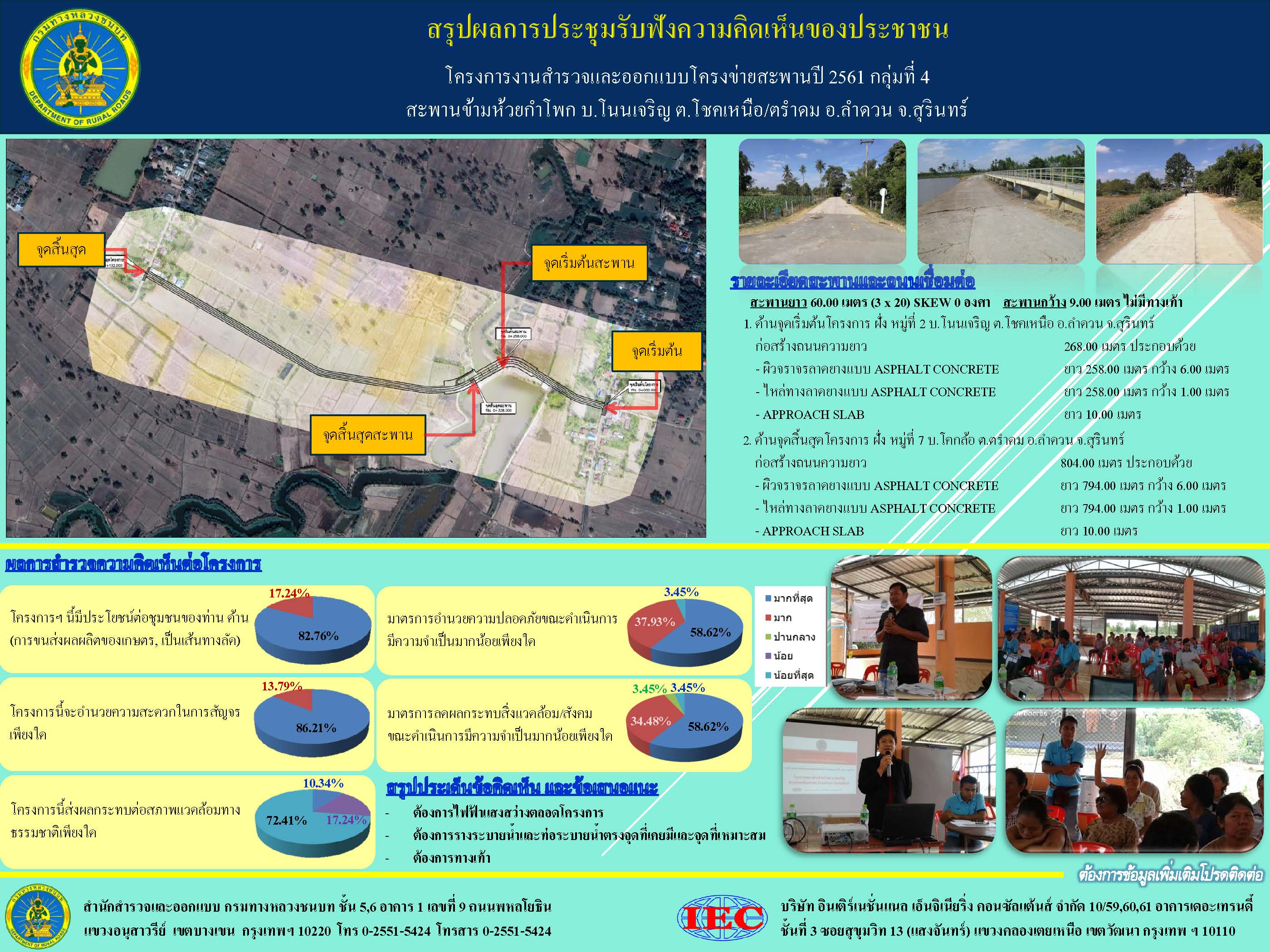 สรุปผลการประชุมรับฟังความคิดเห็นของประชาชน โครงการการสำรวจและออกแบบโครงข่ายสะพานปี 2561 กลุ่มที่ 4 สะพานข้ามห้วยกำโพก ต.โชคเหนือ อ.ลำดวน จ.สุรินทร์