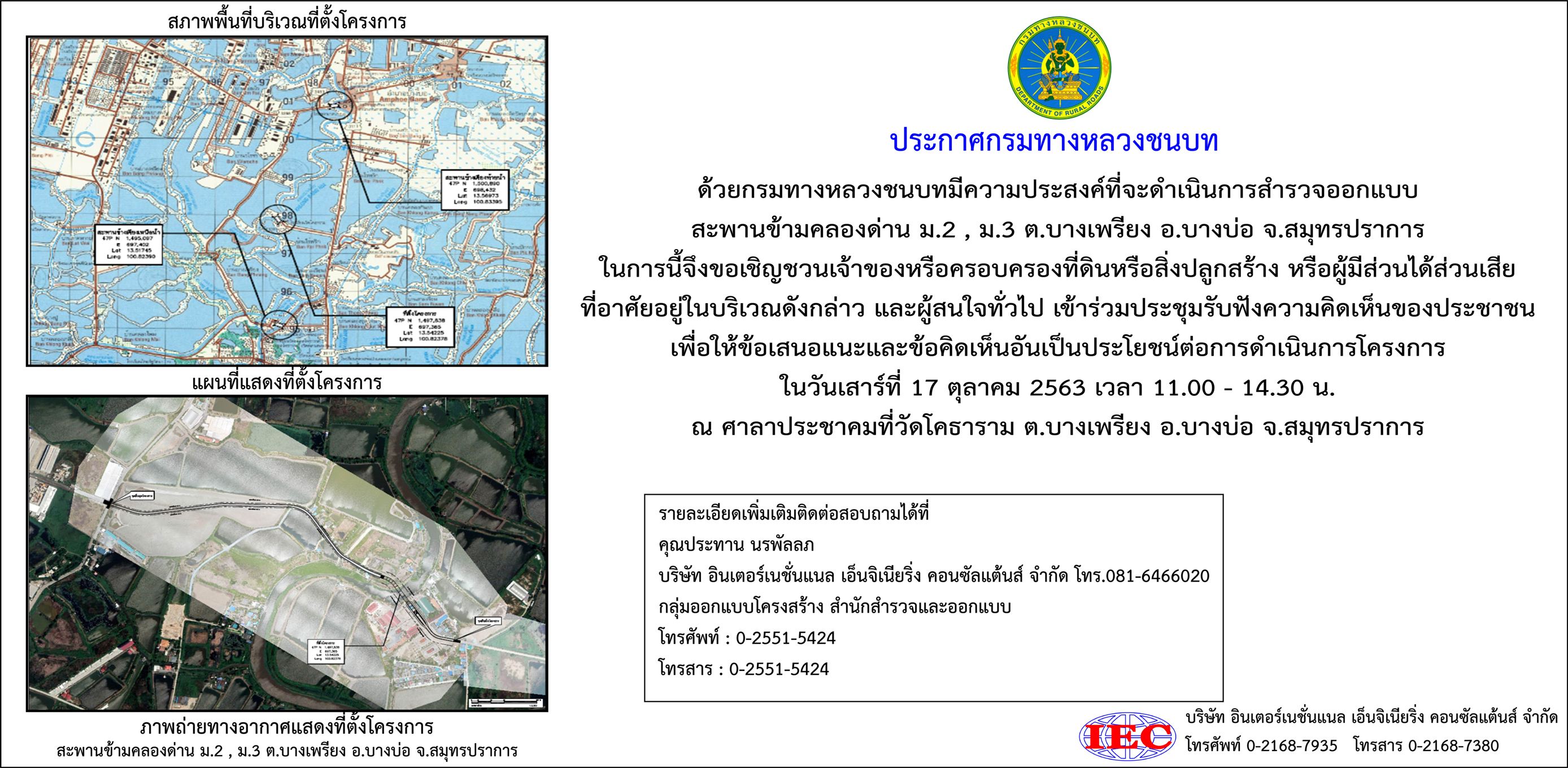 02-เชิญผู้สนใจทั่วไป เข้าร่วมประชุมรับฟังความคิดเห็นของประชาชน สะพานข้ามคลองด่าน ม.2 , ม.3 ต.บางเพรียง อ.บางบ่อ จ.สมุทรปราการ ในวันเสาร์ที่ 17ตุลาคม 2563 เวลา 11.00– 14.30 น.