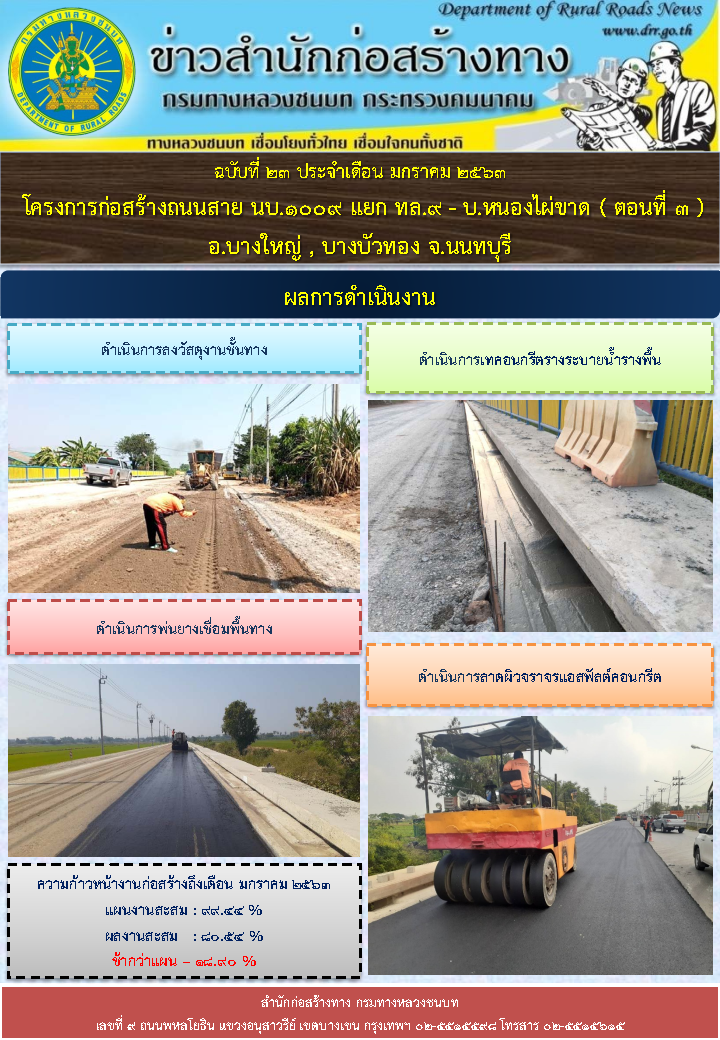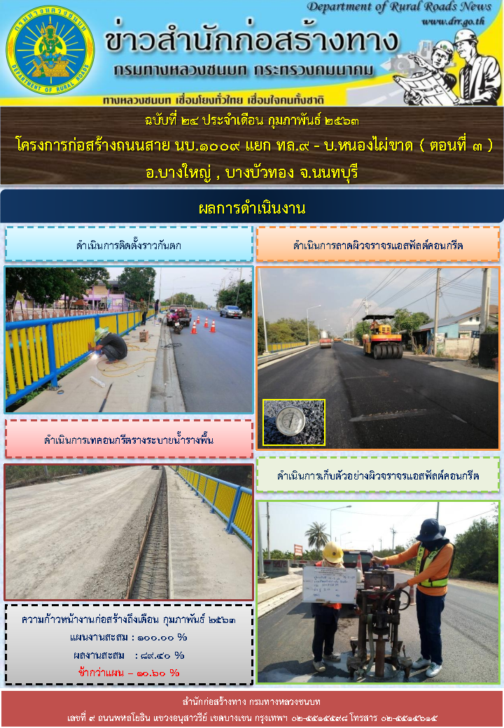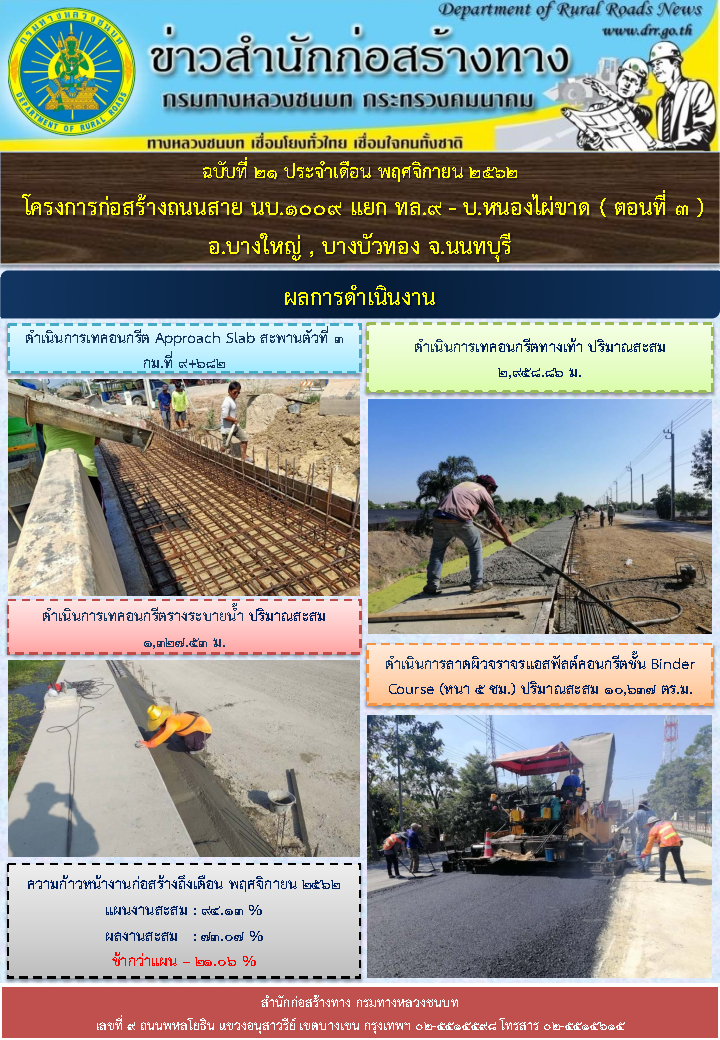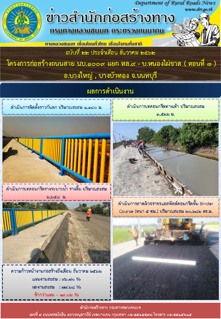 กรมทางหลวงชนบท ได้รับการร้องเรียนจากผู้ใช้เส้นทางทางสาย นบ.1009 แยก ทล.9-บ.หนองไผ่ขาด (ตอนที่ 3) อ.บางใหญ่, บางบัวทอง จ.นนทบุรี ระยะทางทั้งสิ้น 3.638 กิโลเมตร เนื่องจากในปัจจุบัน อ.บางใหญ่ และ อ.บางบัวทอง มีการขยายตัวของชุมชนอย่างรวดเร็ว มีหมู่บ้านจัดสรรเกิดขึ้นอย่างต่อเนื่อง ทำให้การจราจรที่ออกสู่ ถนนสาย ทล.9 ซึ่งเป็นสายหลักติดขัดอย่างมาก โดยเฉพาะอย่างยิ่งในช่วงเวลาเร่งด่วน ทำให้เกิดอุบัติเหตุขึ้นบ่อยครั้ง สร้างความสูญเสียทั้งชีวิตและทรัพย์สิน เนื่องจากถนนเดิมเป็นถนนลาดยาง Ac. กว้าง 6.00 เมตร ไม่มีไหล่ทาง อยู่บนพื้นที่ดินอ่อนและติดคันคลองตลอดสายทาง ซึ่งมีสภาพชำรุดเสียหายเป็นอย่างมาก เพื่อแก้ไขปัญหาการจราจรภายในพื้นที่ชุมชนชานเมือง เพื่อความสะดวกปลอดภัยในชีวิตและทรัพย์สินของประชาชนผู้ใช้รถ ใช้ถนน และแก้ไขปัญหาสิ่งแวดล้อม เพื่อพัฒนาส่งเสริมคุณภาพชีวิตของประชาชนให้ดีขึ้นทั้งด้านเศรษฐกิจ สังคม และสิ่งแวดล้อม