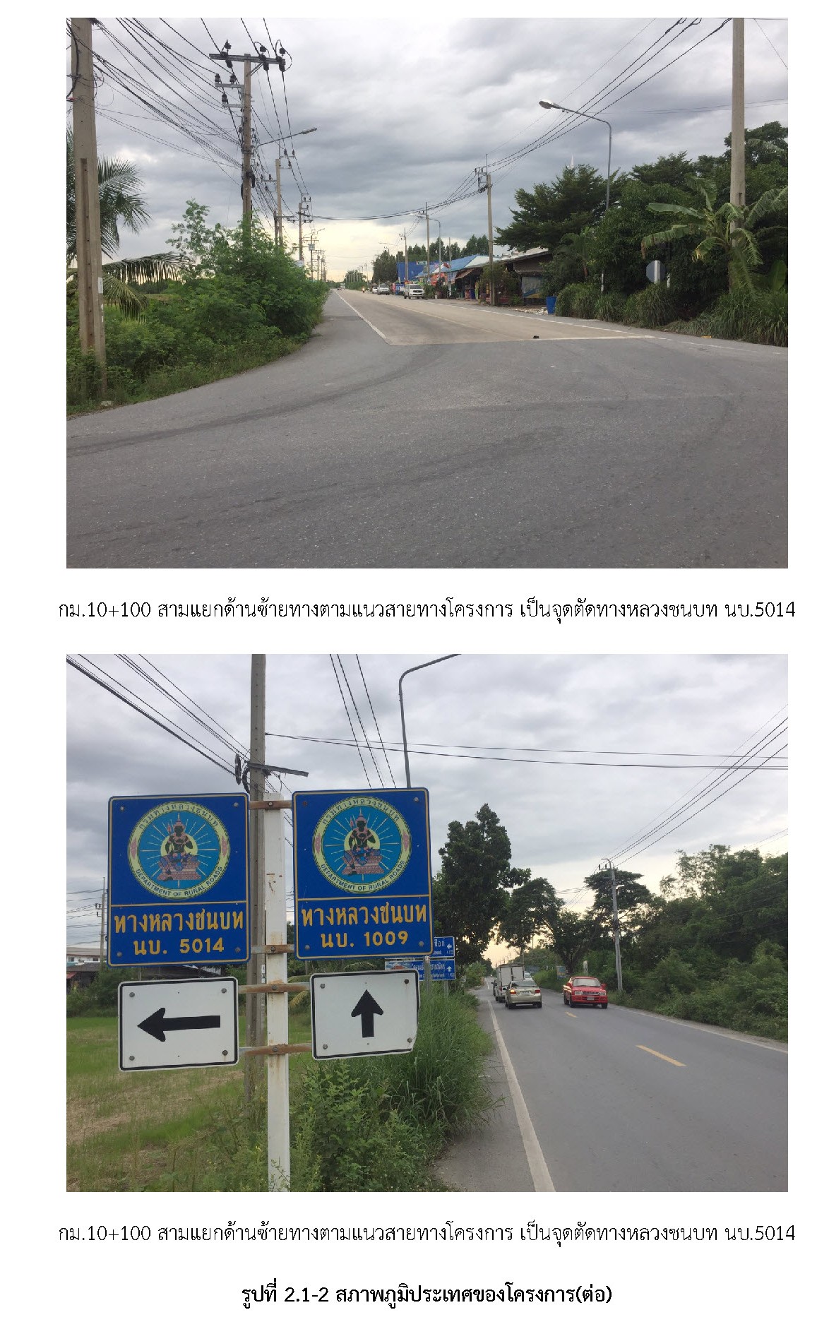 - กม.10+100 เป็นที่ตั้งของสามแยกด้านซ้ายทางตามแนวสายทางโครงการ เป็นจุดตัดทางหลวงชนบท นบ.5014 ซึ่งหลังจากบริเวณแยกนี้จะมีการเปลี่ยนแปลงความกว้างถนนคือ บริเวณนี้ สภาพเดิมถนนโครงการ มีขนาด 2 ช่องจราจร ความกว้าง 3.00 เมตร ไม่มีไหล่ทาง ผิวทางแอสฟัลติกคอนกรีต ผิวจราจรบางช่วงมีสภาพชำรุดเสียหาย เกิดในลักษณะผิวทางเสียรูป ทรุดตัว