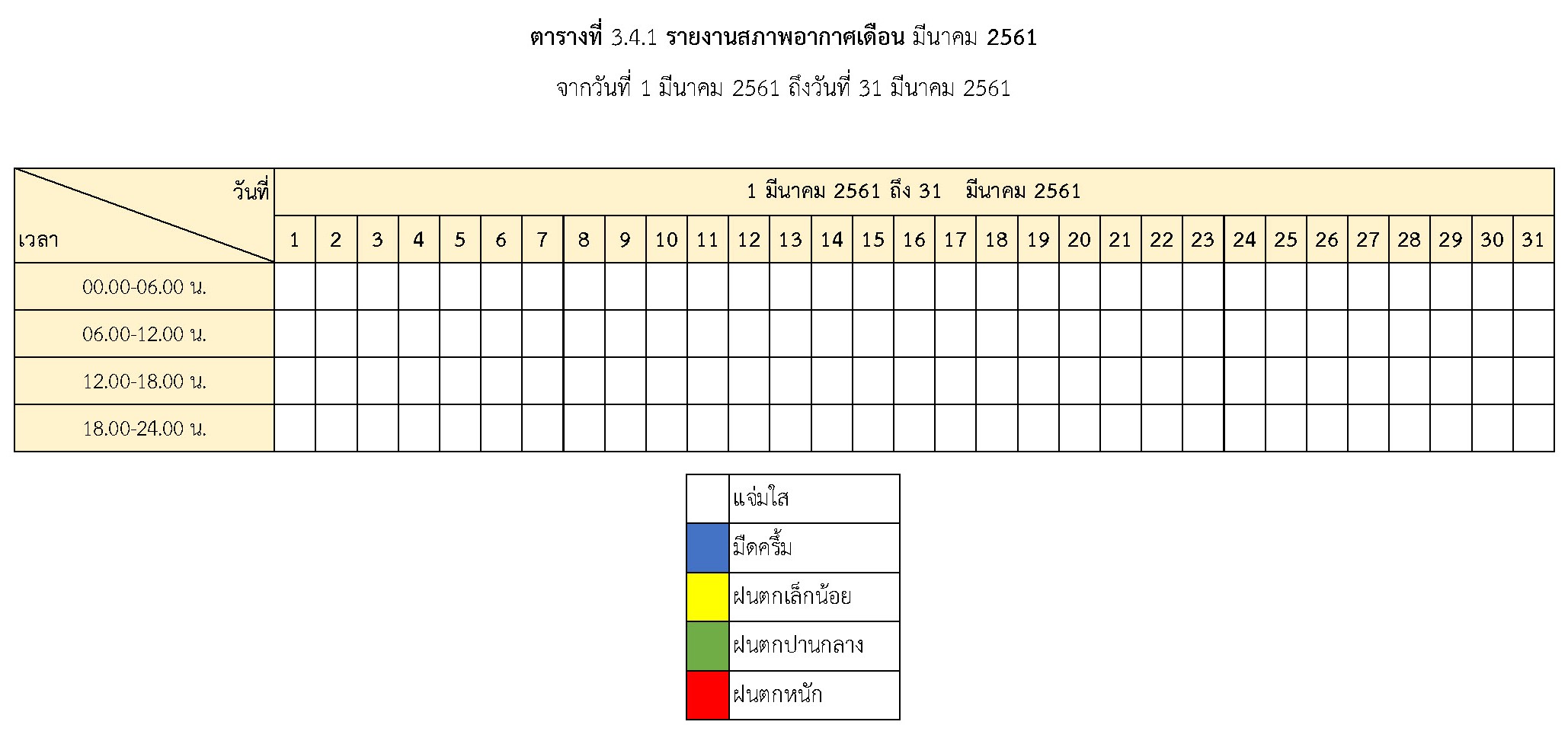 - ระหว่างวันที่ 1 มีนาคม 2561 ถึงวันที่ 31 มีนาคม 2561สภาพอากาศ สรุปตามตารางที่ 3.4.1