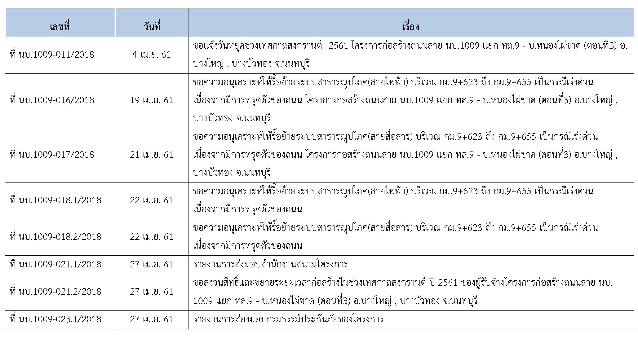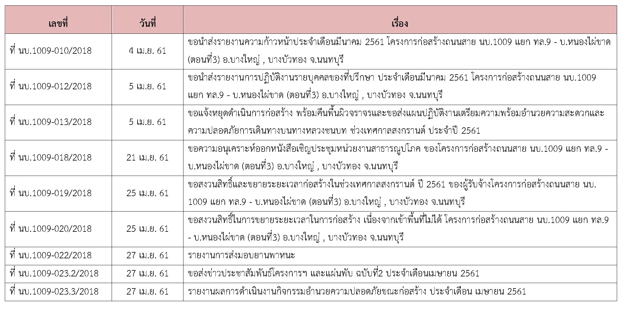 ที่ปรึกษาได้ปฏิบัติงานควบคุมการก่อสร้าง โครงการก่อสร้างก่อสร้างถนนสาย นบ.1009 แยก ทล.9-บ.หนองไผ่ขาด(ตอนที่3)อ.บางใหญ่ , บางบัวทอง จ.นนทบุรี ประจำเดือน เมษายน 2561 (ตั้งแต่วันที่ 1 – 30 เมษายน 2561 )
