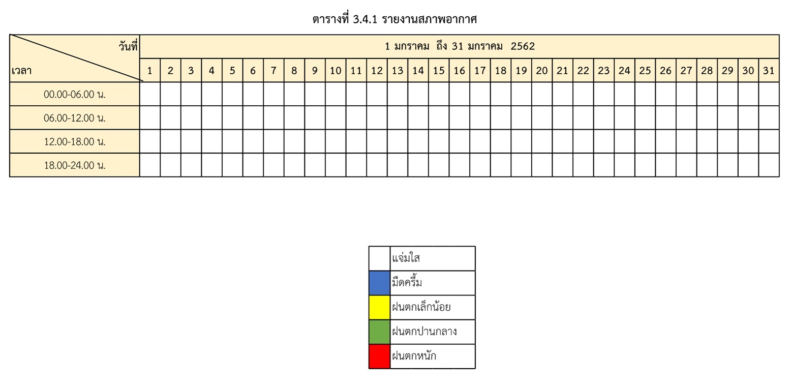 - ระหว่างวันที่ 1 มกราคม 2562 ถึงวันที่ 31 มกราคม 2562สภาพอากาศ สรุปตามตารางที่ 3.4.1
