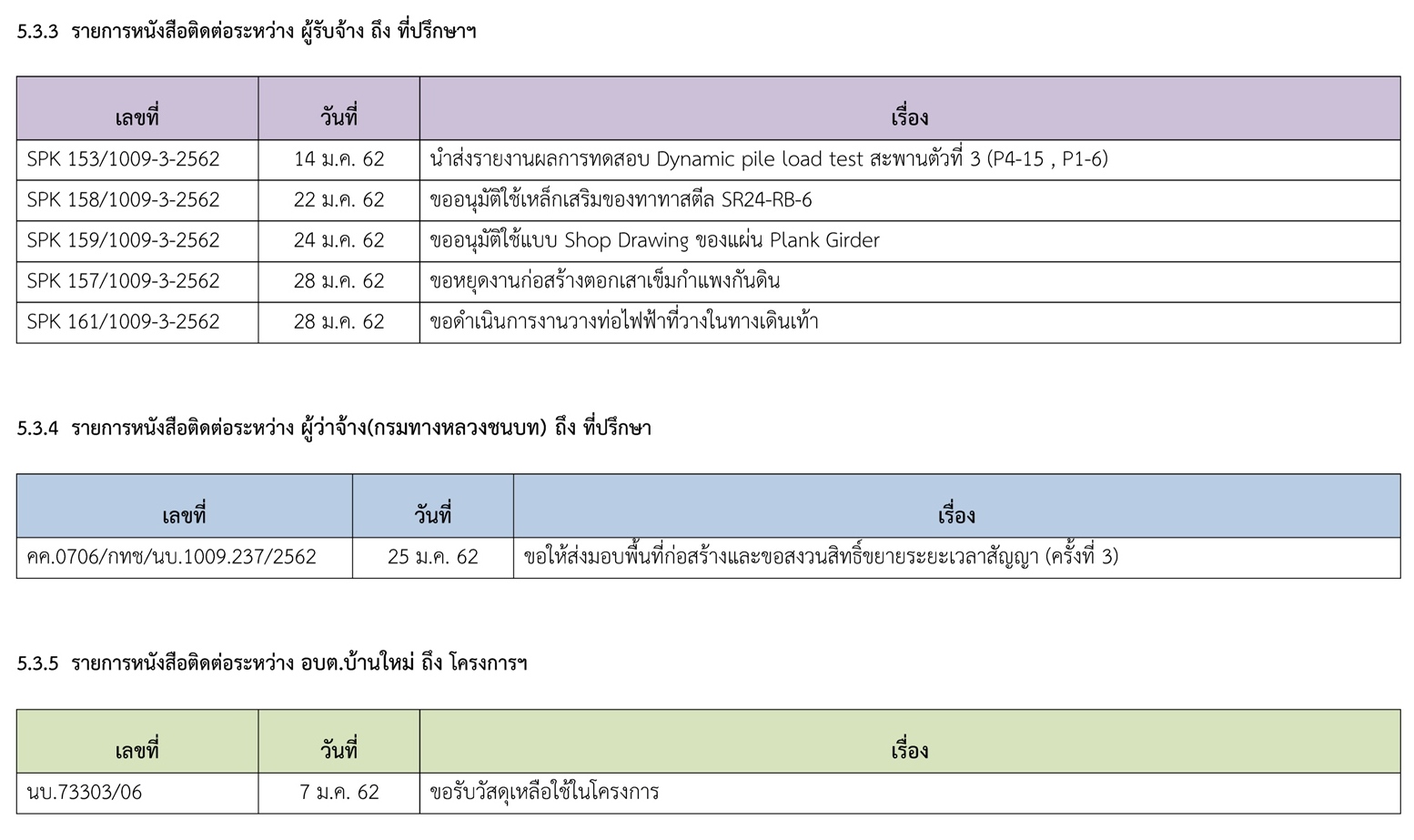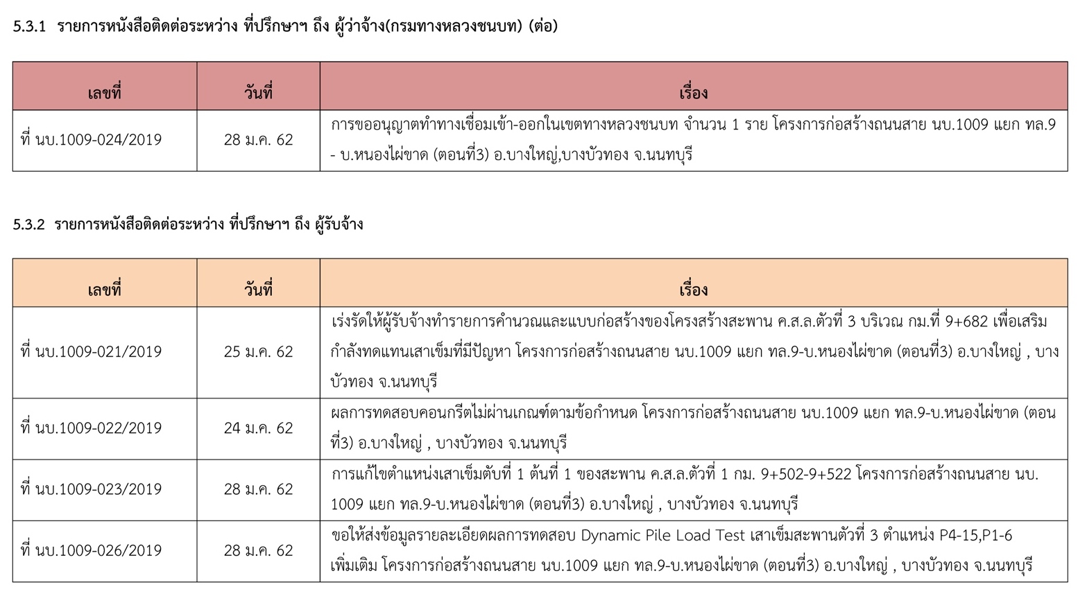 5.3.1 รายการหนังสือติดต่อระหว่าง ที่ปรึกษาฯ ถึง ผู้ว่าจ้าง(กรมทางหลวงชนบท)