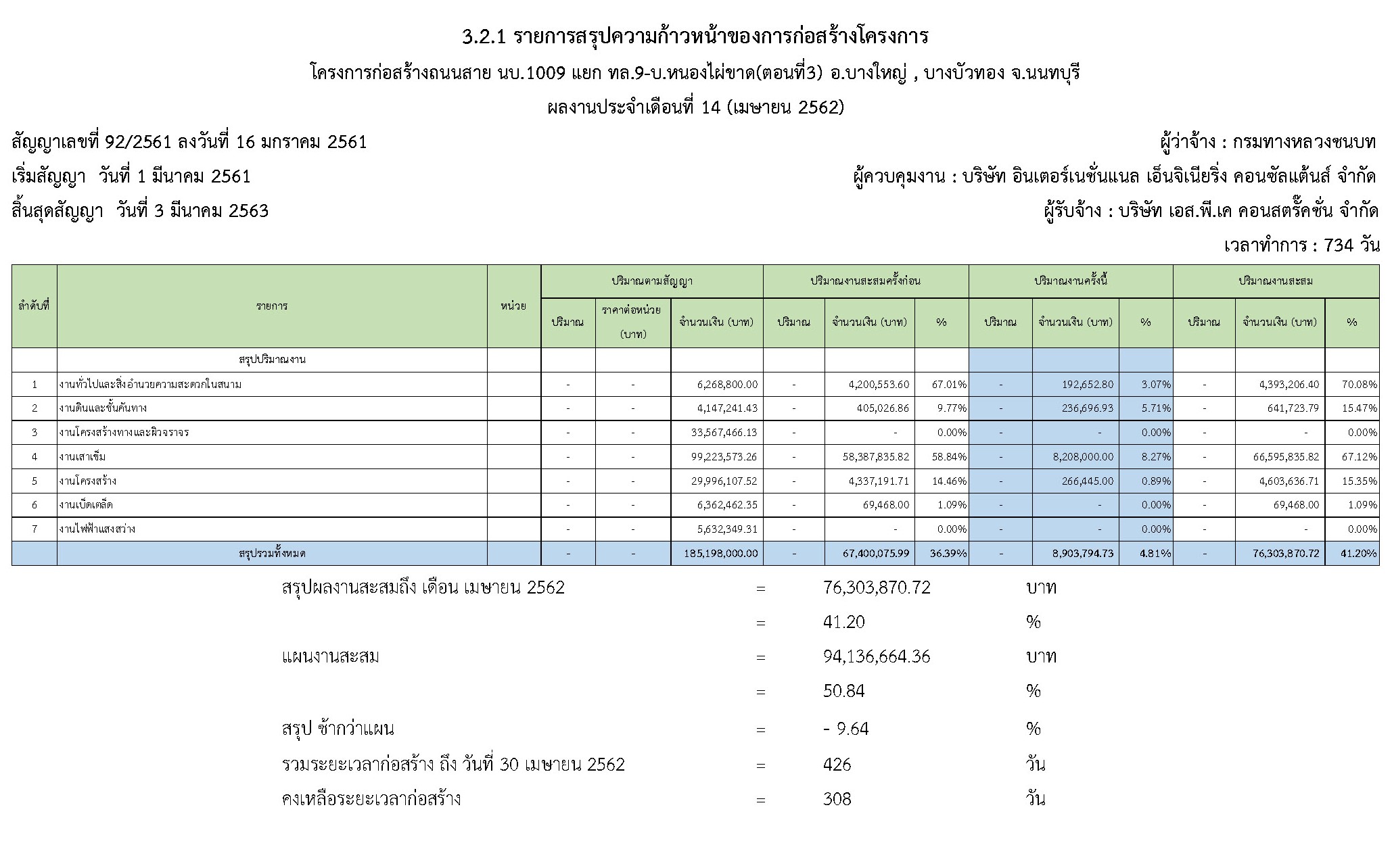 - คงเหลือระยะเวลาดำเนินการก่อสร้าง : 308 วัน