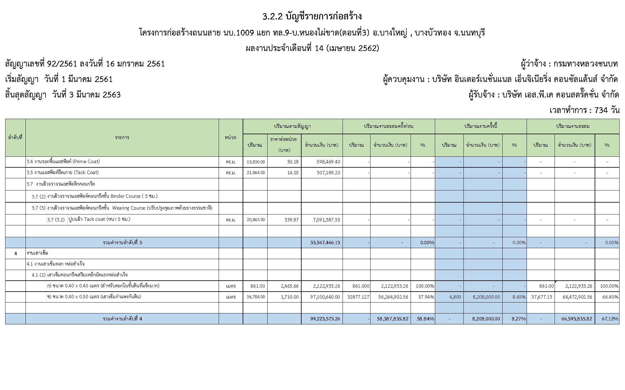 ในระหว่างวันที่ 1 เมษายน 2562 ถึง วันที่ 30 เมษายน 2562 ผู้รับจ้างได้ดำเนินงานในส่วนต่างๆดังนี้