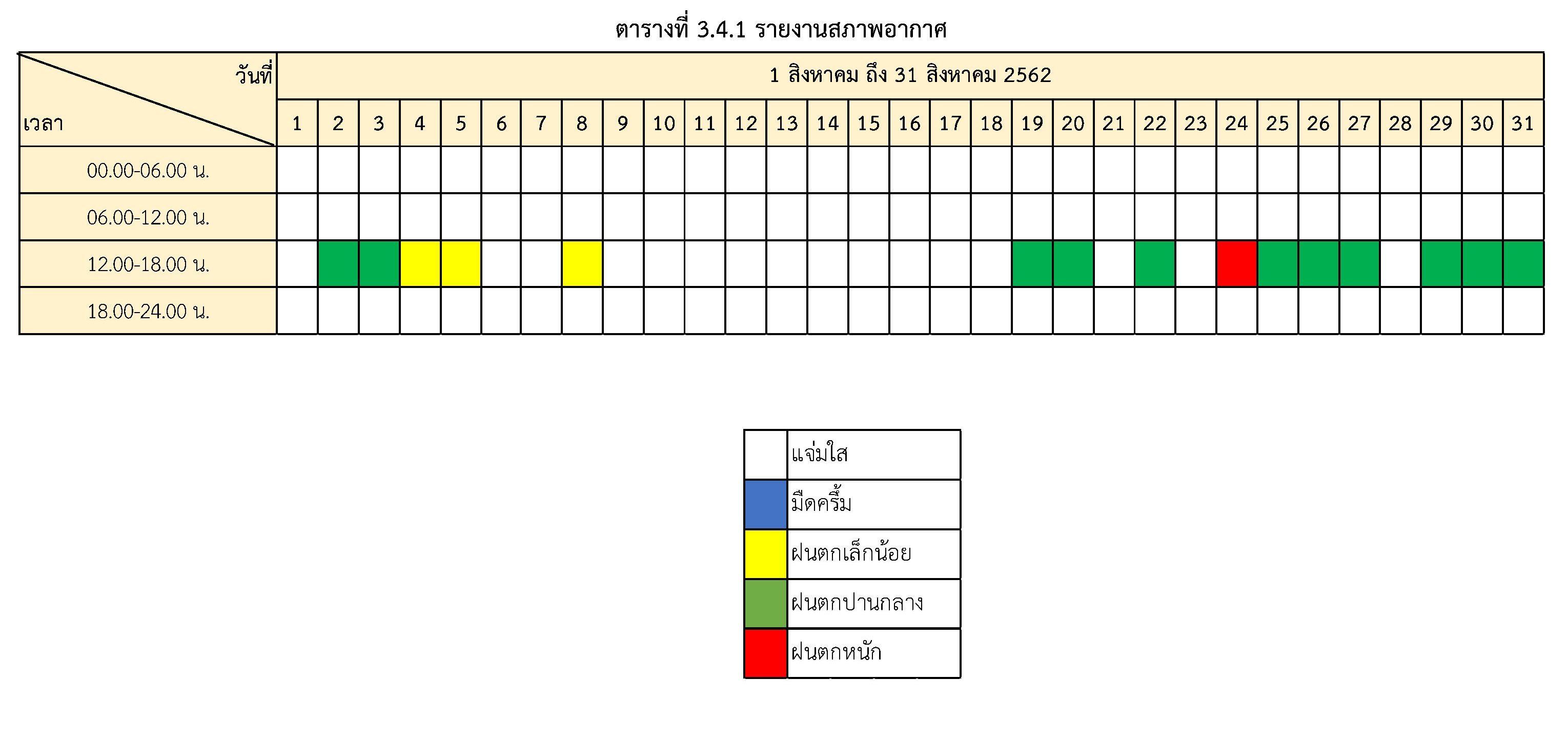 - ระหว่างวันที่ 1 สิงหาคม 2562 ถึงวันที่ 31 สิงหาคม 2562สภาพอากาศ สรุปตามตารางที่ 3.4.1