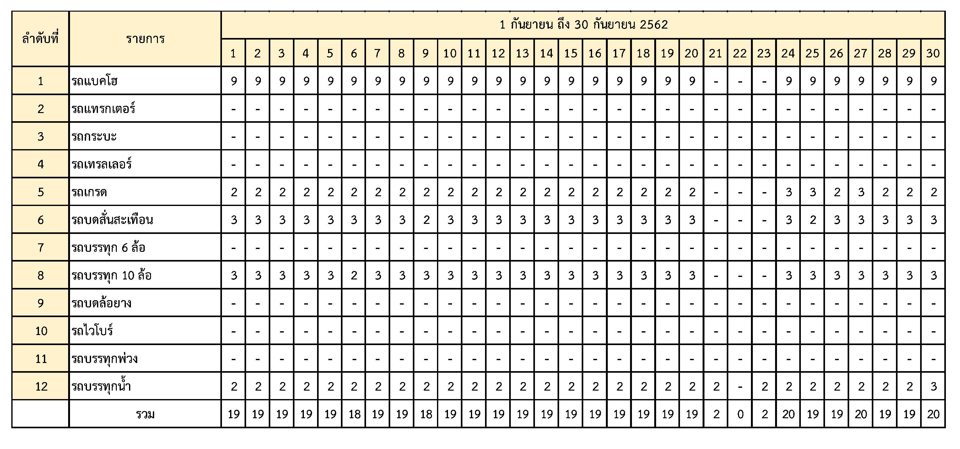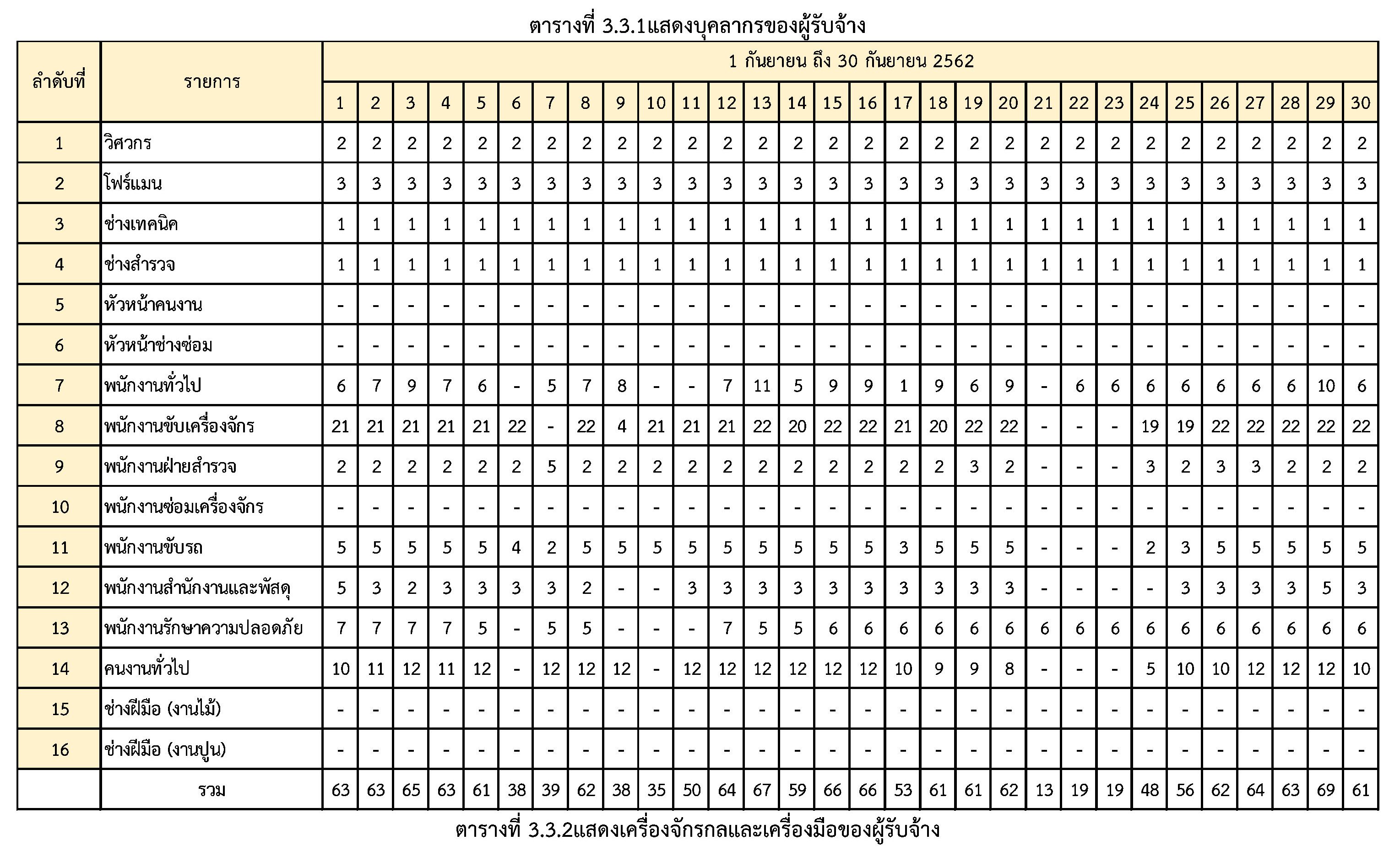 - ระหว่างวันที่ 1 กันยายน2562ถึงวันที่ 30 กันยายน2562ผู้รับจ้างได้จัดเครื่องจักรอุปกรณ์ และบุคลากร เพื่อเข้าดำเนินการตามรายละเอียด ตารางที่ 3.3.1 และตารางที่ 3.3.2