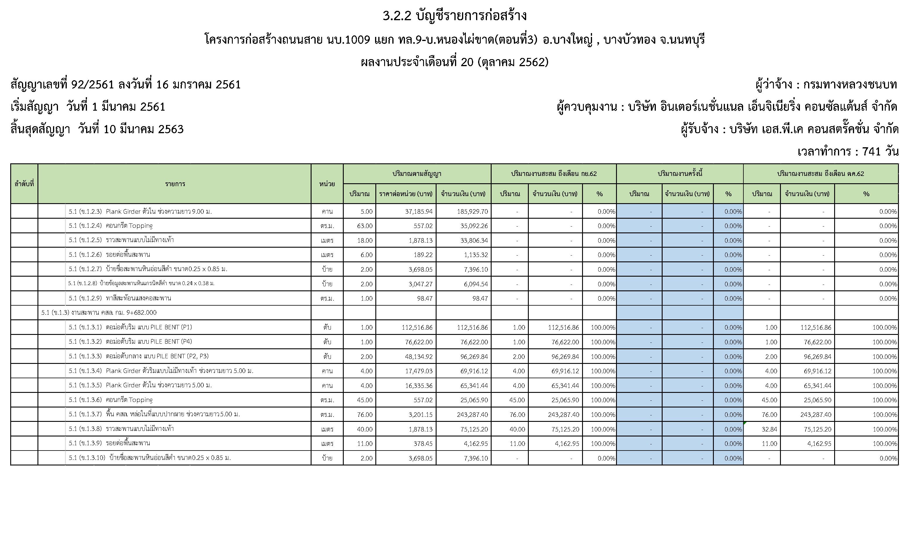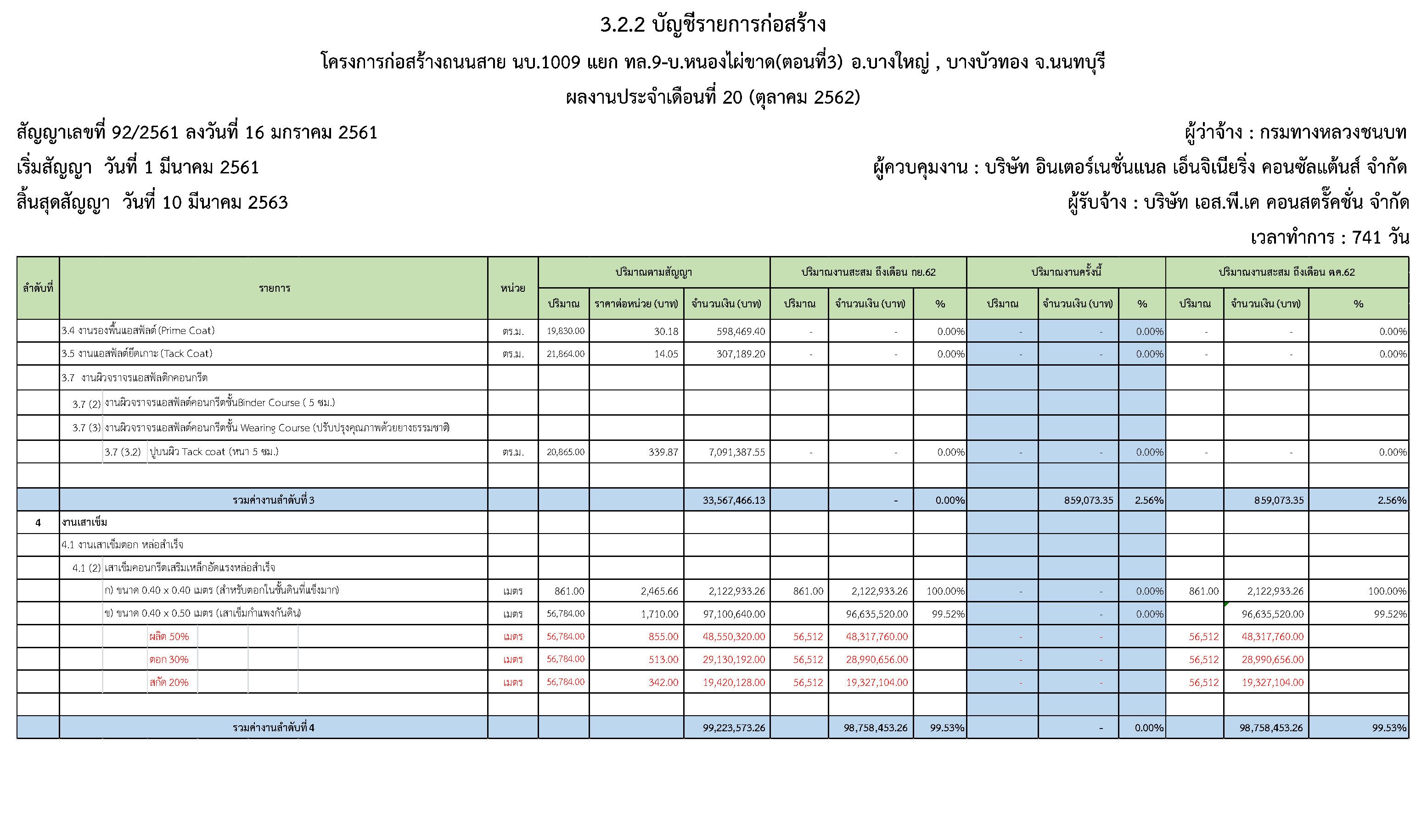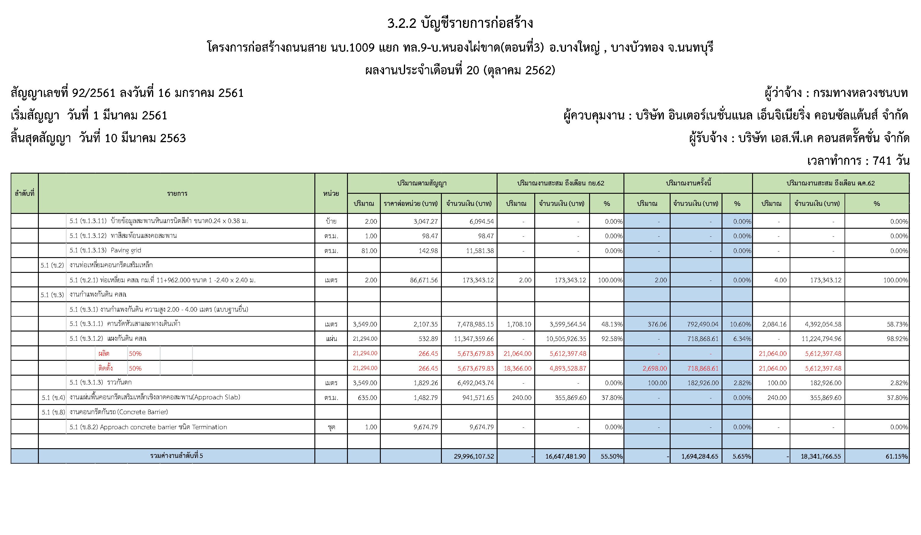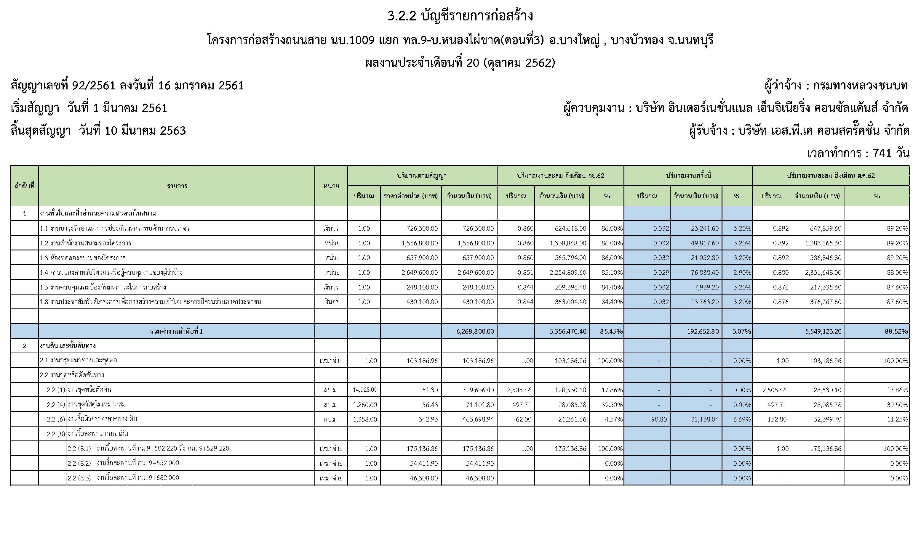 ในระหว่างวันที่1 ตุลาคม2562ถึงวันที่ 31ตุลาคม 2562ผู้รับจ้างได้ดำเนินงานในส่วนต่างๆดังนี้