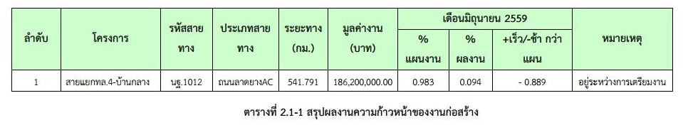 ในเดือน มิถุนายน 2559 ยังไม่มีความก้าวหน้าของงานก่อสร้างที่สามารถตรวจรับงานได้ จึงไม่มีการตรวจรับงานใดๆ ดังสรุปในตารางที่ 2.3-1