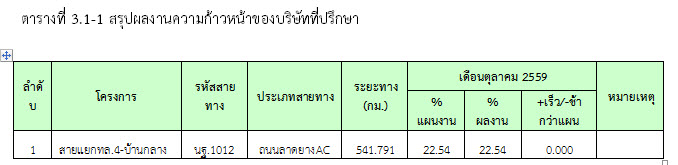 ความก้าวหน้าในช่วงเดือนตุลาคม 2559 (22.54%) ผลงานความก้าวหน้าแสดงไว้ในตารางที่ 3.1-1 ดังนี้