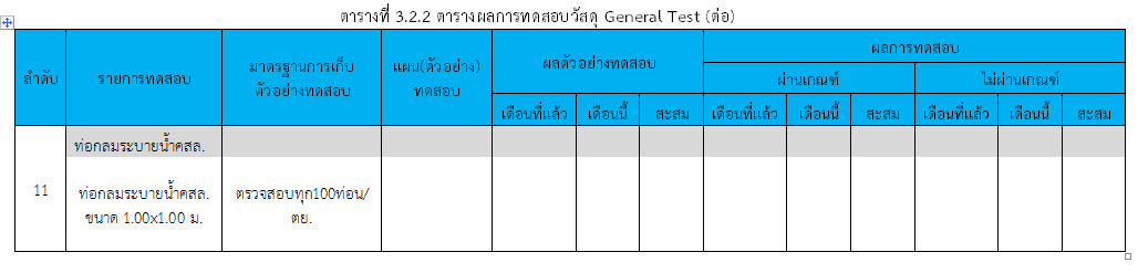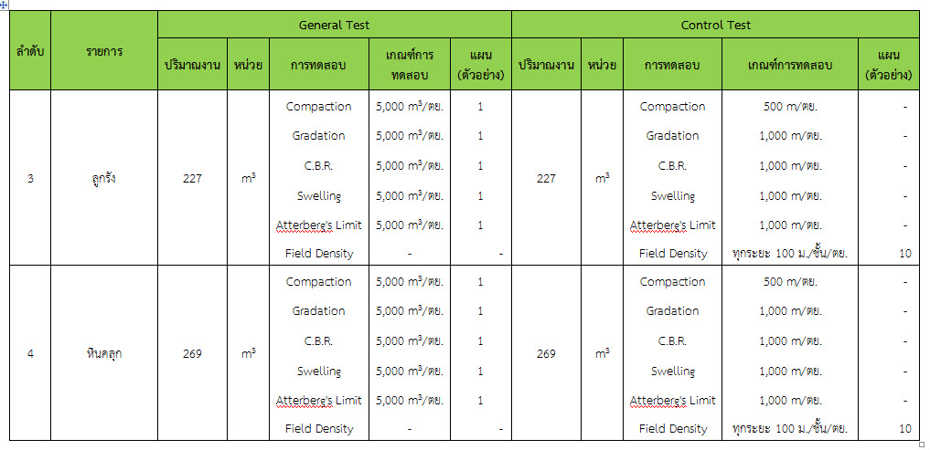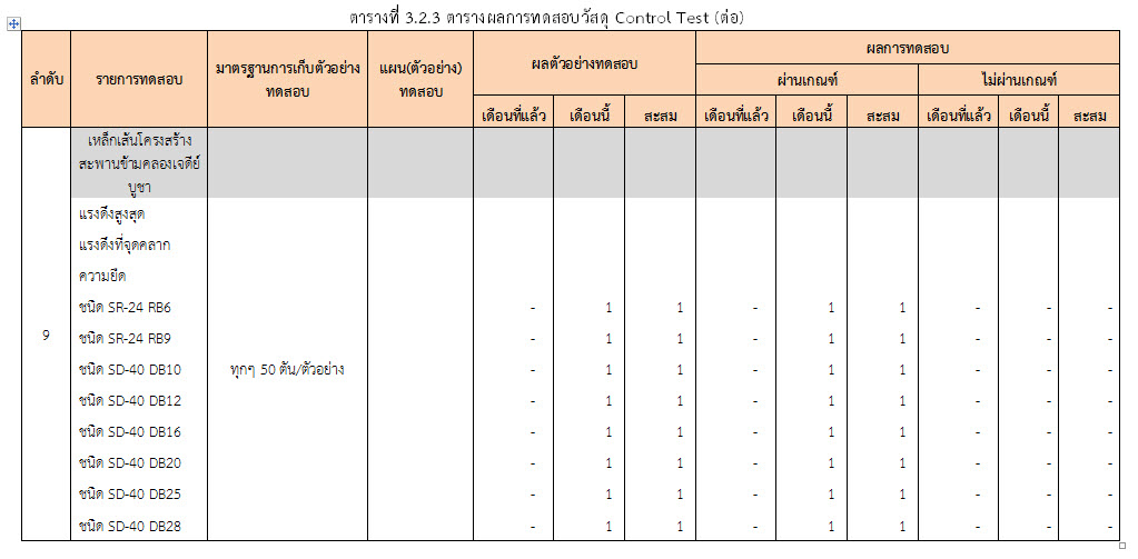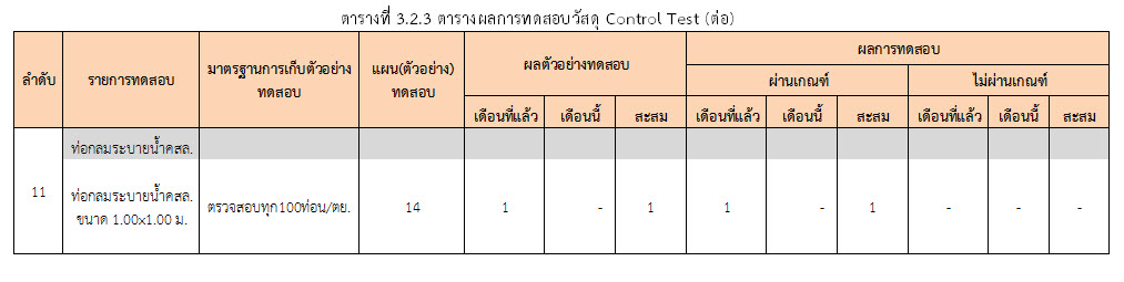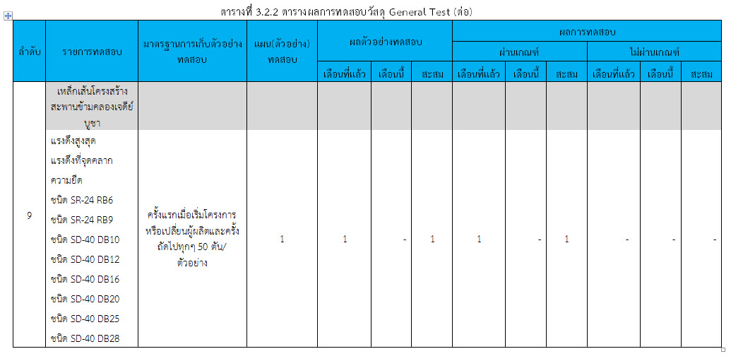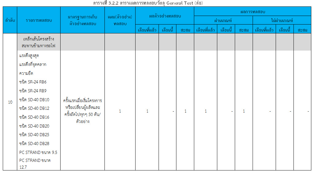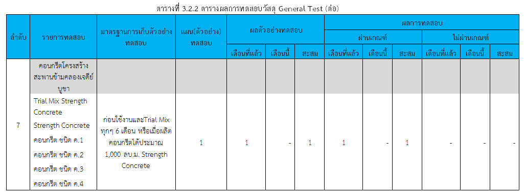 ในเดือน ตุลาคม 2559 ได้แสดงเกณฑ์การทดสอบ General Test และ Control Test แสดงไว้ในตารางที่ 3.2-1 – 3.2-3 ดังนี้3.2 การตรวจสอบการอนุมัติการใช้วัสดุ