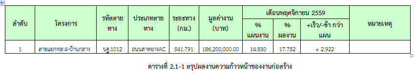 ความก้าวหน้าของเดือนพฤศจิกายน 2559 ของการปฏิบัติงาน (14.830%) กำลังดำเนินการเคลียร์สิ่งปลูกสร้างเดิม, ประกอบนั่งร้านสะพานข้ามคลองเจดีย์บูชา, ประกอบปั่นจั่นเพื่อเตรียมงานตอกเสาเข็มสะพานข้ามคลองเจดีย์บูชา, ตอกเสาเข็มสะพานข้ามคลองเจดีย์บูชา, ขุดลอกรางระบายน้ำเดิม, ทำทางเข้า – ออก ให้กับชาวบ้านที่ได้รับผลกระทบจากฝนตก, ลงวัสดุเพื่อทำคันทางชั้นที่ 1, ลงวัสดุเพื่อทำคันทางชั้นที่ 2 และยังไม่สามารถเข้าพื้นที่ได้บางส่วนผลงานความก้าวหน้าแสดงไว้ใน ตารางที่ 2.1-1