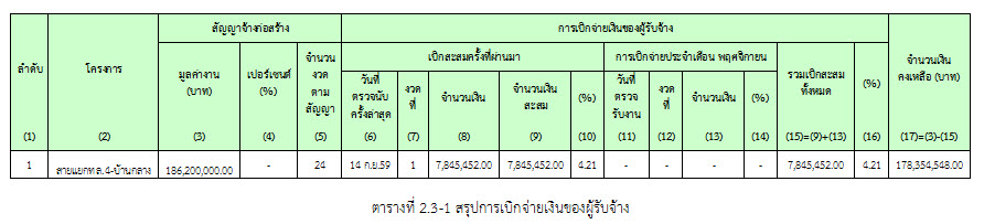 คณะกรรมการตรวจการจ้าง ดำเนินการตรวจรับงานในเดือน พฤศจิกายน 2559 ดังสรุปในตารางที่ 2.3-1 สรุปการเบิกจ่ายเงินของผู้รับจ้าง