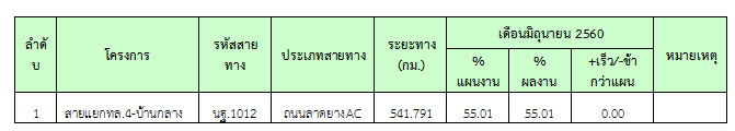 ที่ปรึกษาได้ดำเนินการควบคุมงานก่อสร้าง ในเดือน มิถุนายน 2560 มีรายละเอียดการดำเนินงานและความก้าวหน้าของงานตามที่กล่าวในบทที่ 2 ข้อ2.4 รายละเอียดความก้าวหน้าของงานในสายทาง