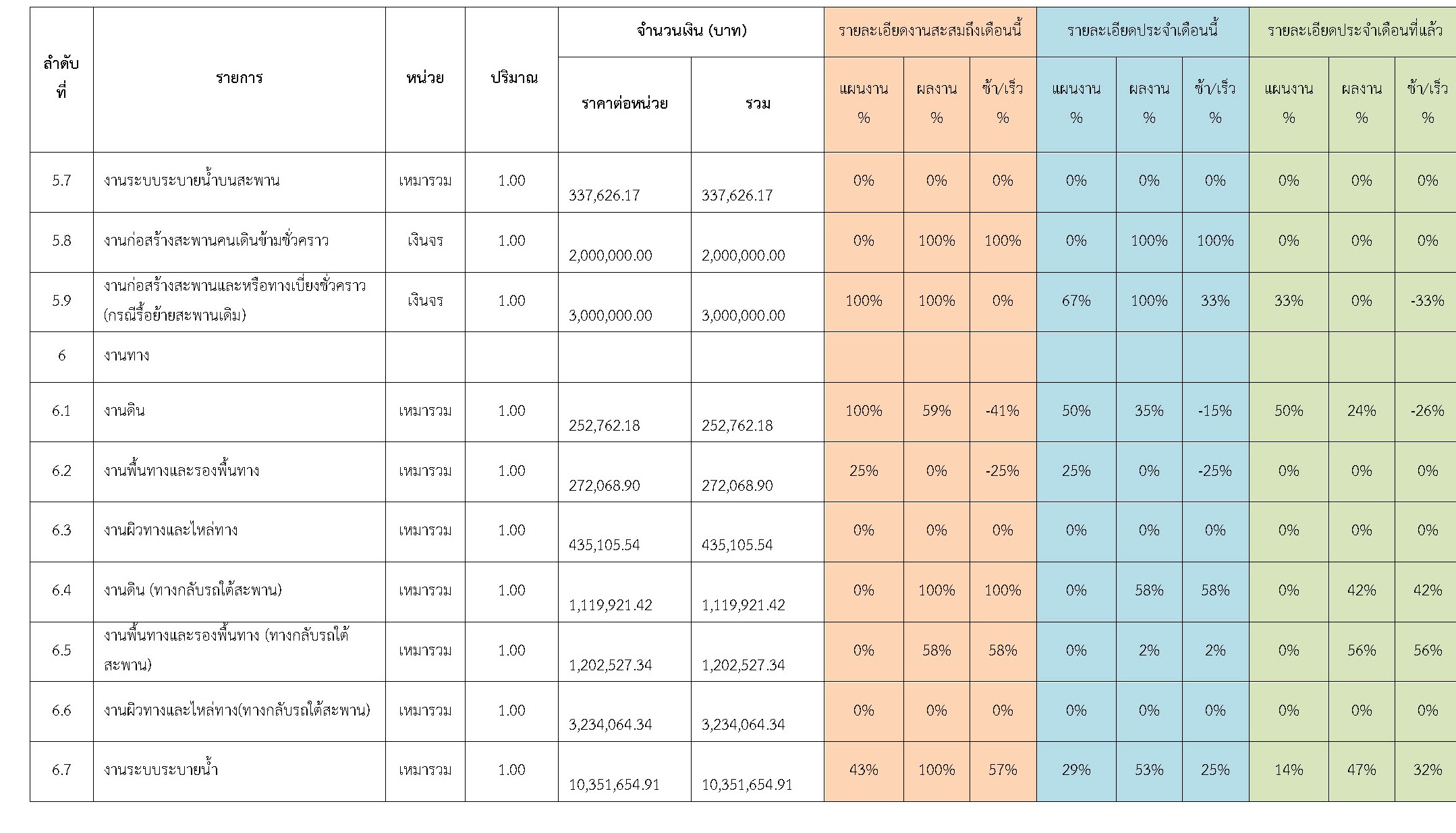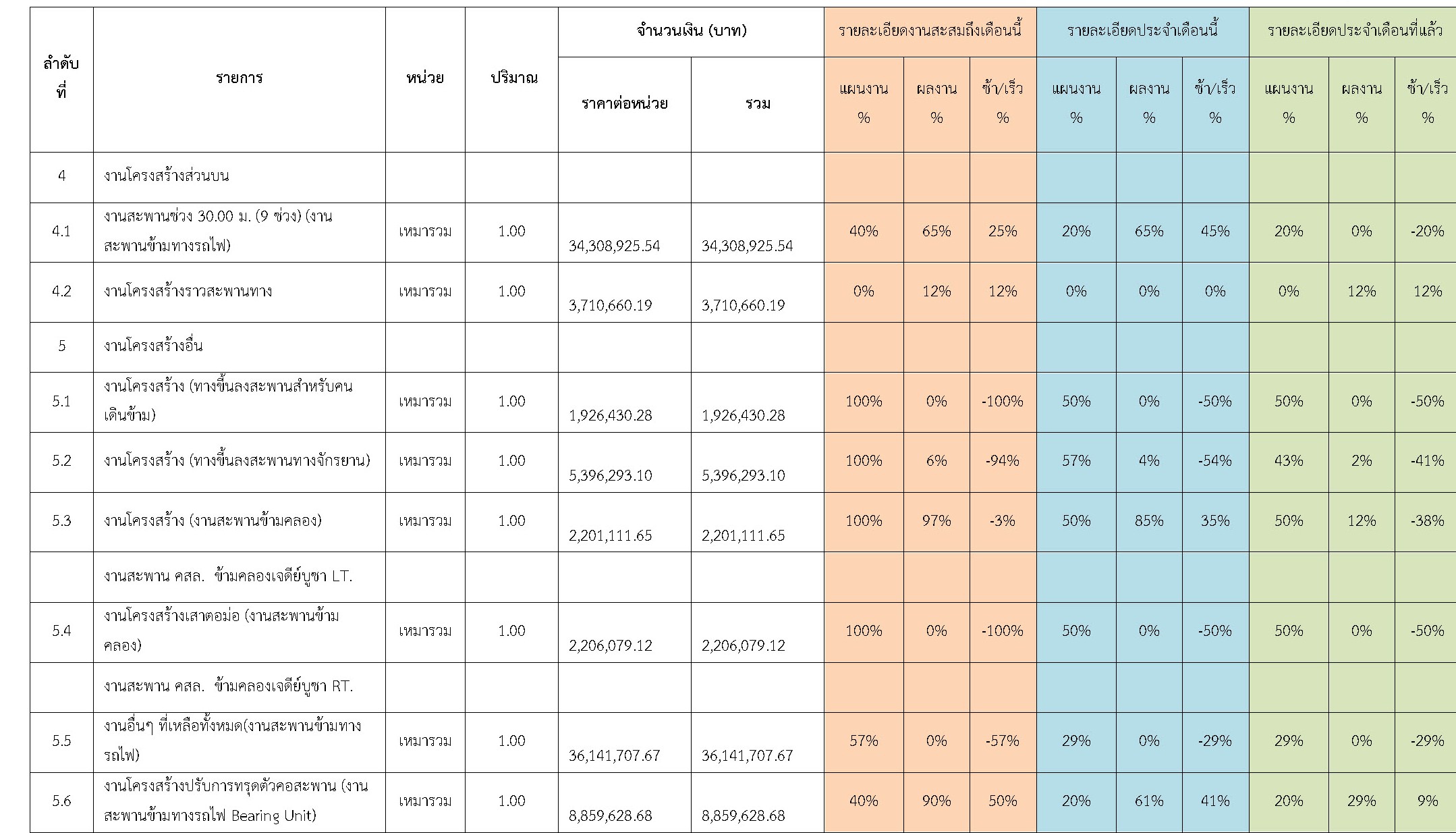 ความก้าวหน้าของเดือนกรกฎาคม 2560 ของการปฏิบัติงาน (56.751%) กำลังดำเนินการเทคอนกรีต Approach Slab, เทคอนกรีต Deck และหล่อแผ่นพื้นสะพานข้ามทางรถไฟ ผลงานความก้าวหน้าแสดงไว้ใน ตารางที่ 2.1-1