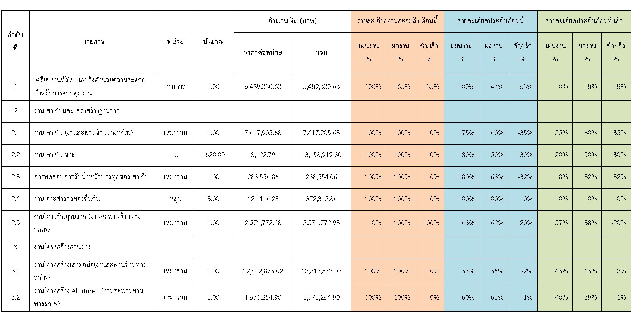 ความก้าวหน้าของเดือนตุลาคม 2560 ของการปฏิบัติงาน (72.163%) กำลังดำเนินการเทคอนกรีตเสาสะพานจักรยาน, เทคอนกรีตเสาสะพานคนเดินข้าม, เทคอนกรีตเสาสะพานข้ามคลองเจดีย์บูชาฝั่งขวาทาง, ลงวัสดุคัดเลือก Approach Slab สะพานข้ามทางรถไฟ, ติดตั้งคาน I-Girder และงานวางแผ่นพื้นสะพานข้ามทางรถไฟ ผลงานความก้าวหน้าแสดงไว้ใน ตารางที่ 2.1-1
