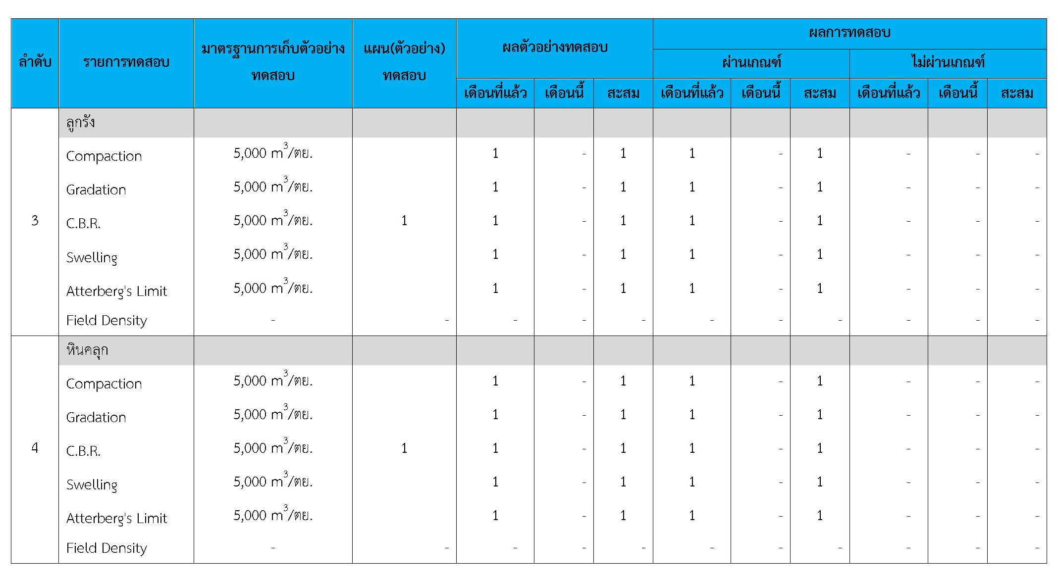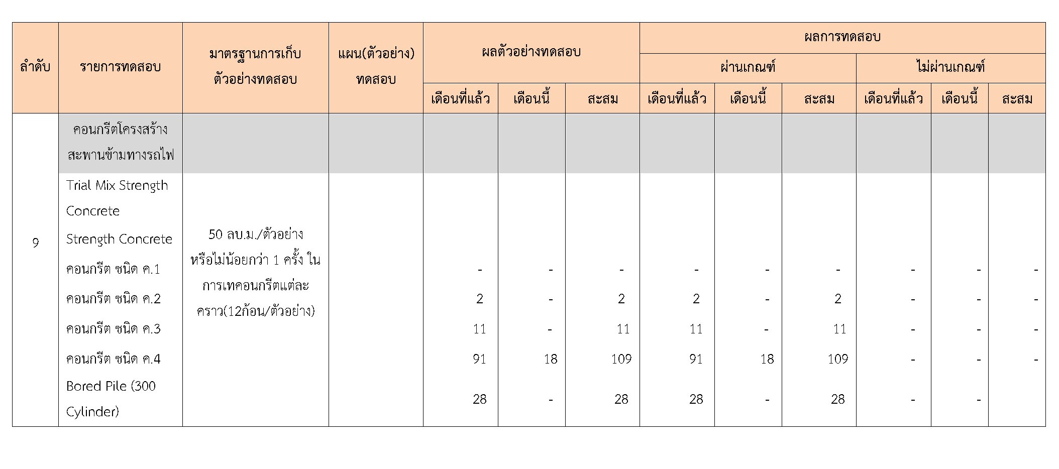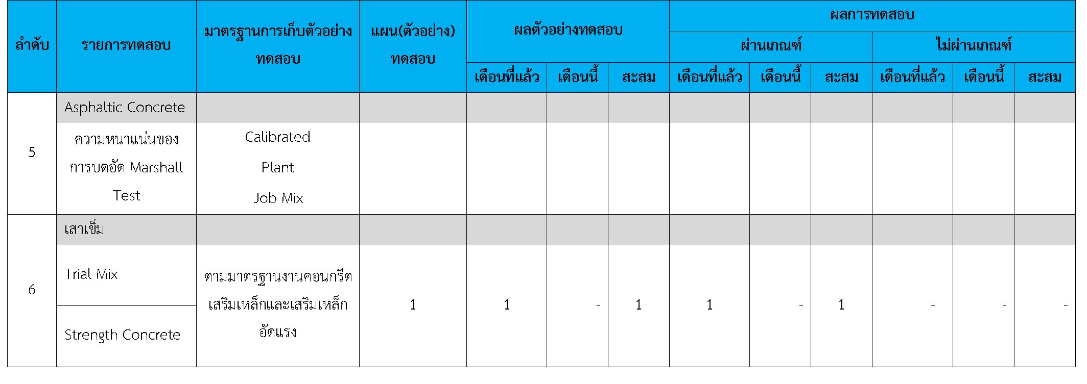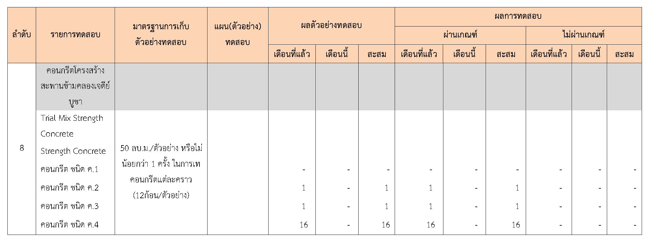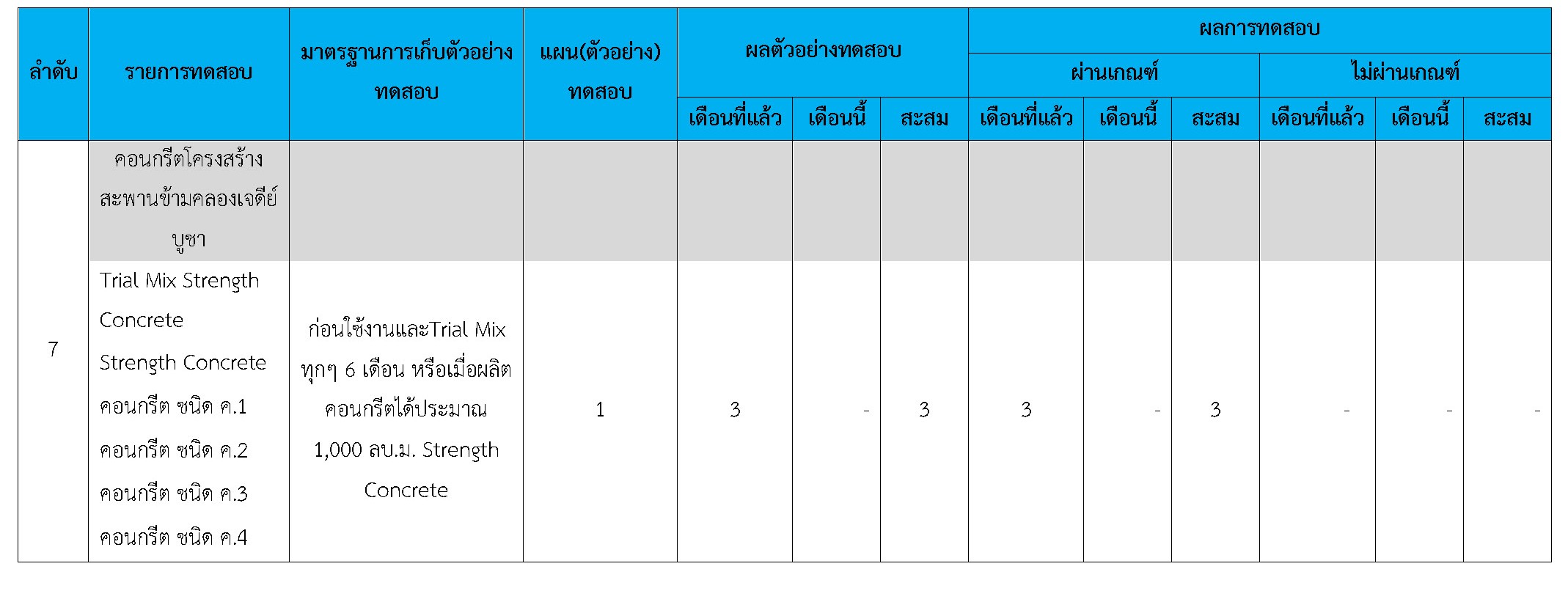 ในระหว่างวันที่ 1-31 ตุลาคม 2560 ผู้ว่าจ้างได้เสนอหนังสือขออนุมัติใช้วัสดุถึงที่ปรึกษา โดยที่ปรึกษาได้ตรวจสอบวัสดุดังกล่าวมีผลทดสอบดังตาราง