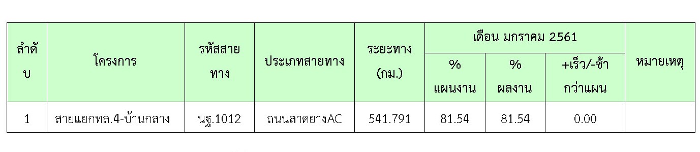 ที่ปรึกษาได้ดำเนินการควบคุมงานก่อสร้าง ในเดือน มกราคม 2561 มีรายละเอียดการดำเนินงานและความก้าวหน้าของงานตามที่กล่าวในบทที่ 2 ข้อ2.4 รายละเอียดความก้าวหน้าของงานในสายทาง
