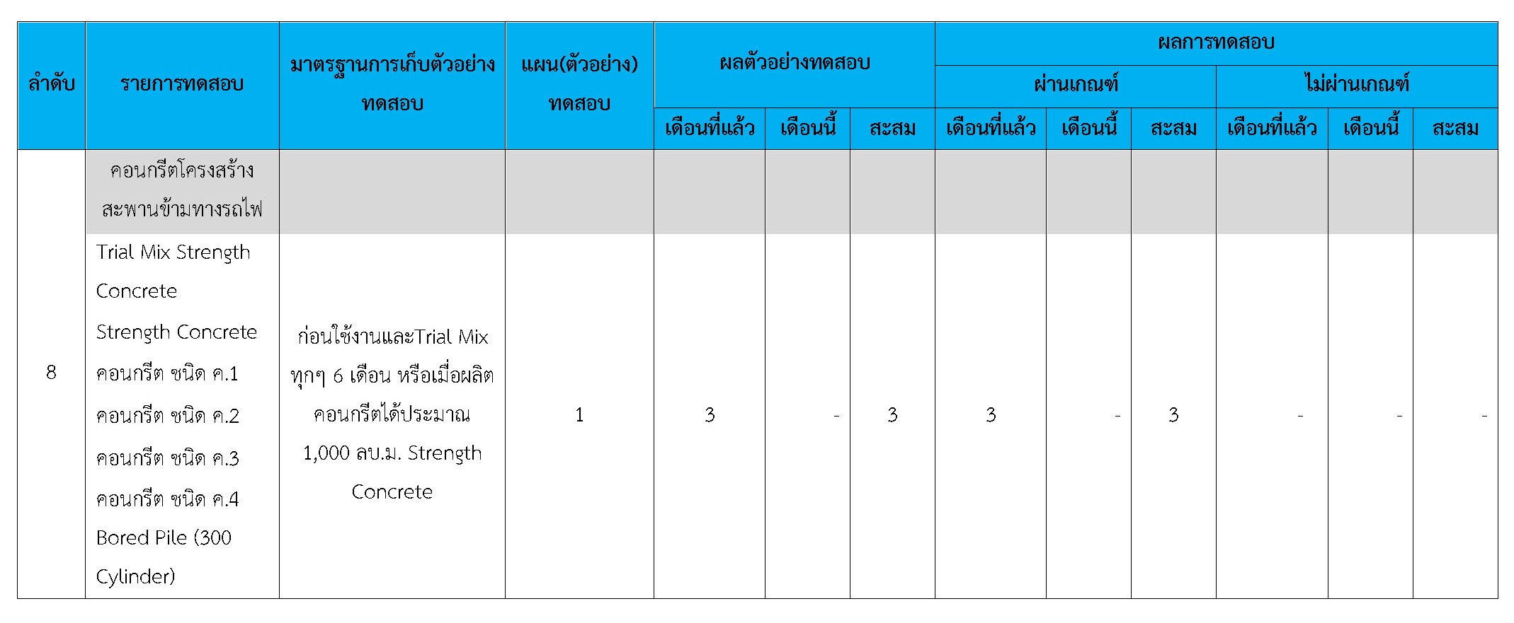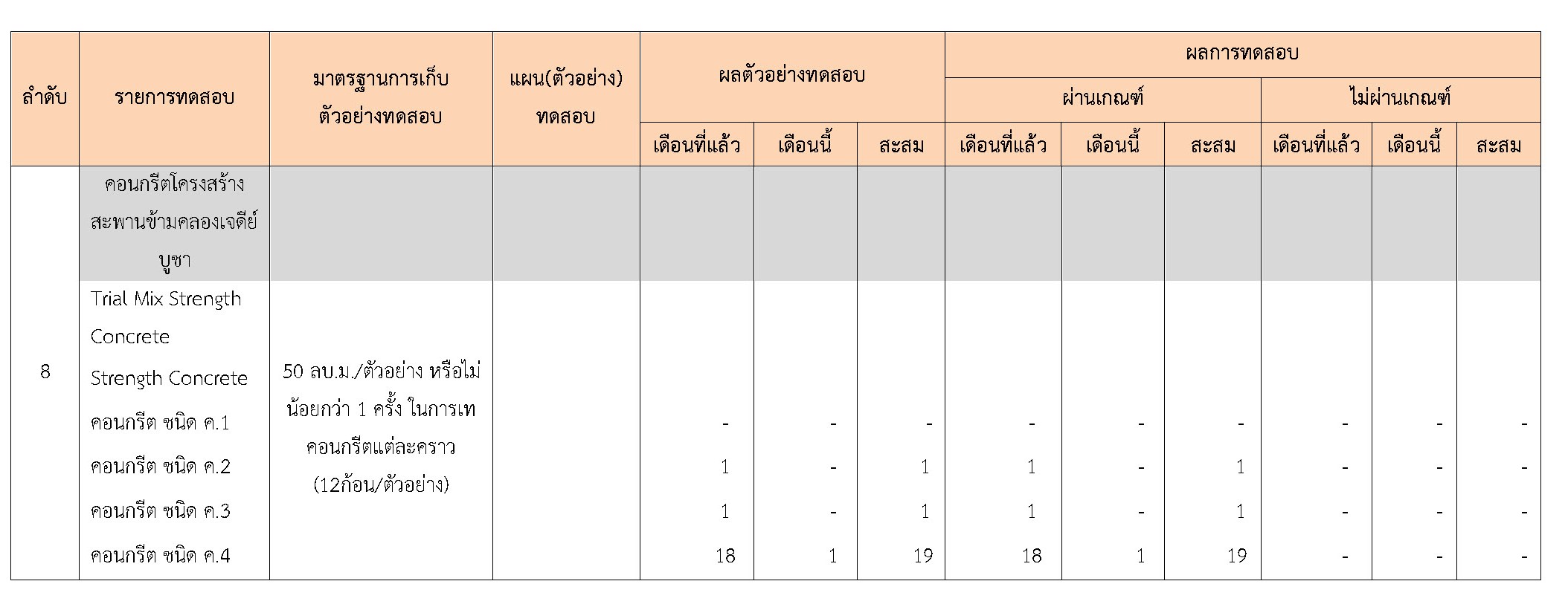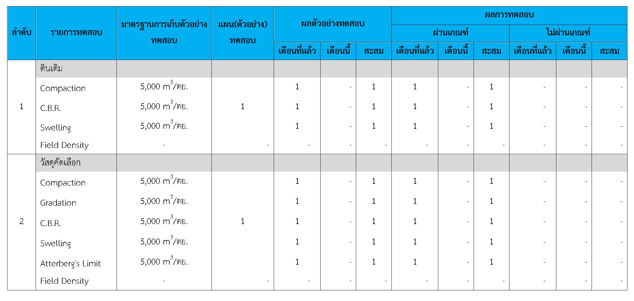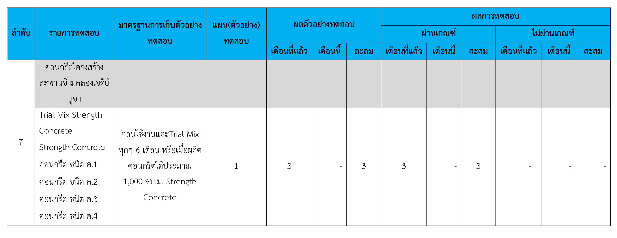 ในระหว่างวันที่ 1-31 มกราคม 2560 ผู้ว่าจ้างได้เสนอหนังสือขออนุมัติใช้วัสดุถึงที่ปรึกษา โดยที่ปรึกษาได้ตรวจสอบวัสดุดังกล่าวมีผลทดสอบดังตาราง