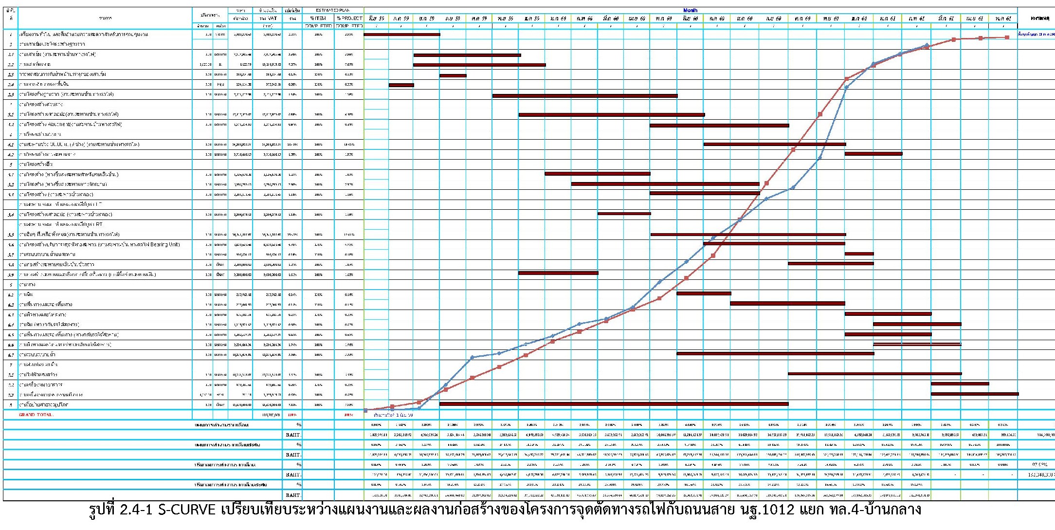 ที่ปรึกษาได้ติดตามความก้าวหน้าของงาน และนำมาจัดทำเป็น S-CURVE เปรียบเทียบกันระหว่างแผนงานและผลงานก่อสร้าง ดังรูปที่ 2.2-1
