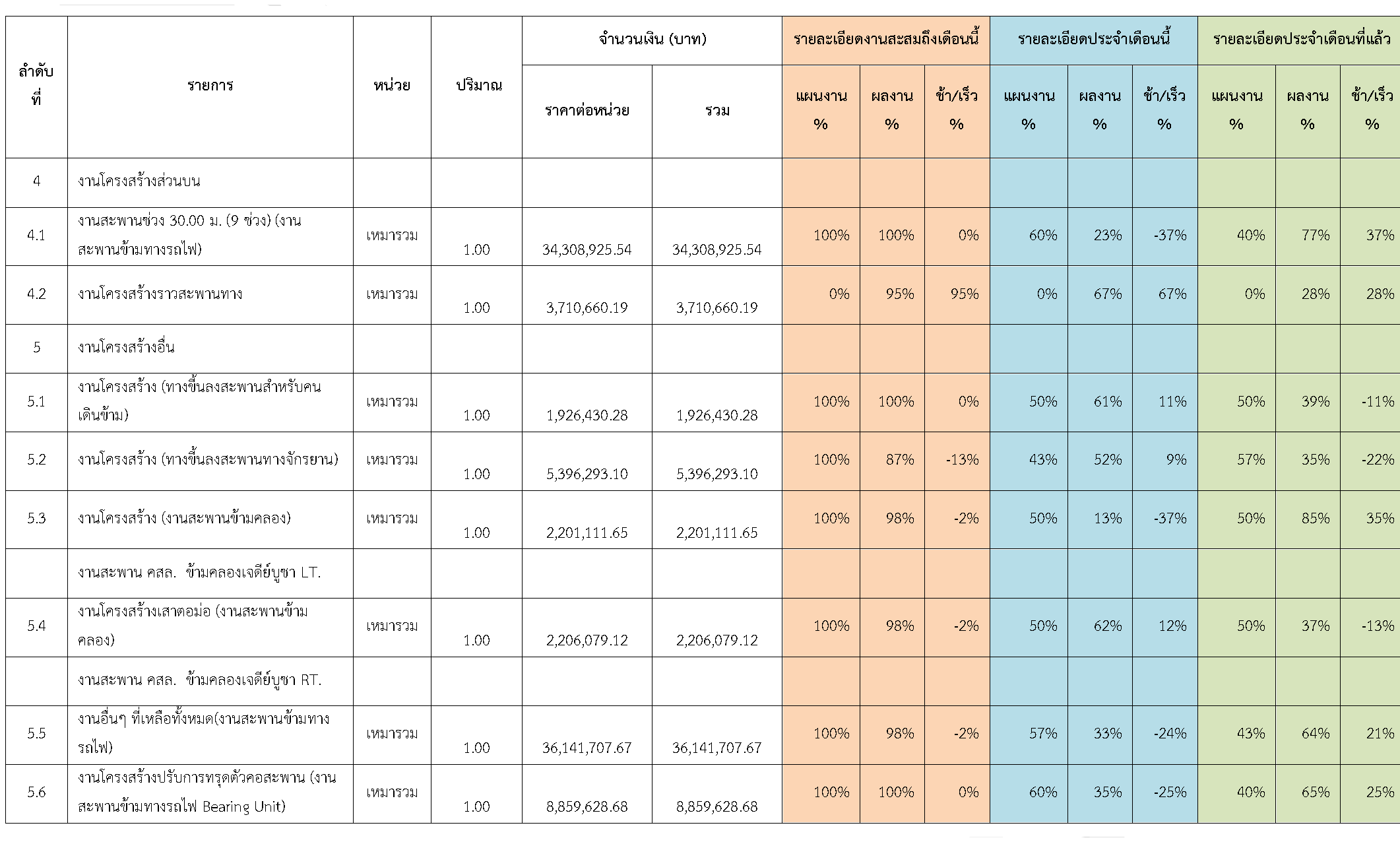 ความก้าวหน้าของเดือนเมษายน 2561 ของการปฏิบัติงาน (99.833%) กำลังดำเนินการติดตั้งราวกันตกสะพานจักรยาน, ราวกันตกสะพานคนเดินข้าม, งานติดตั้งกำแพงกันเสียง, งานปูพื้นทางเดินเท้า, งานเทคอนกรีตคันหินรางตื้น และงานเทคอนกรีตพื้นถนนคอนกรีต ผลงานความก้าวหน้าแสดงไว้ใน ตารางที่ 2.1-1