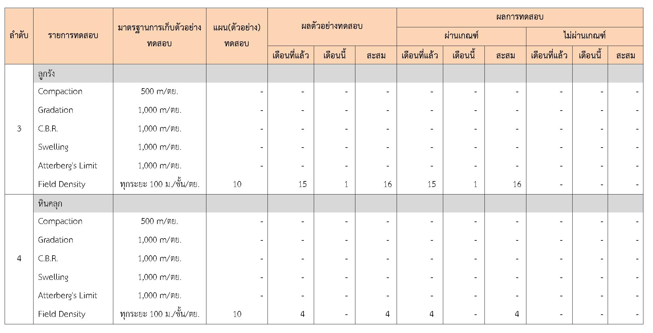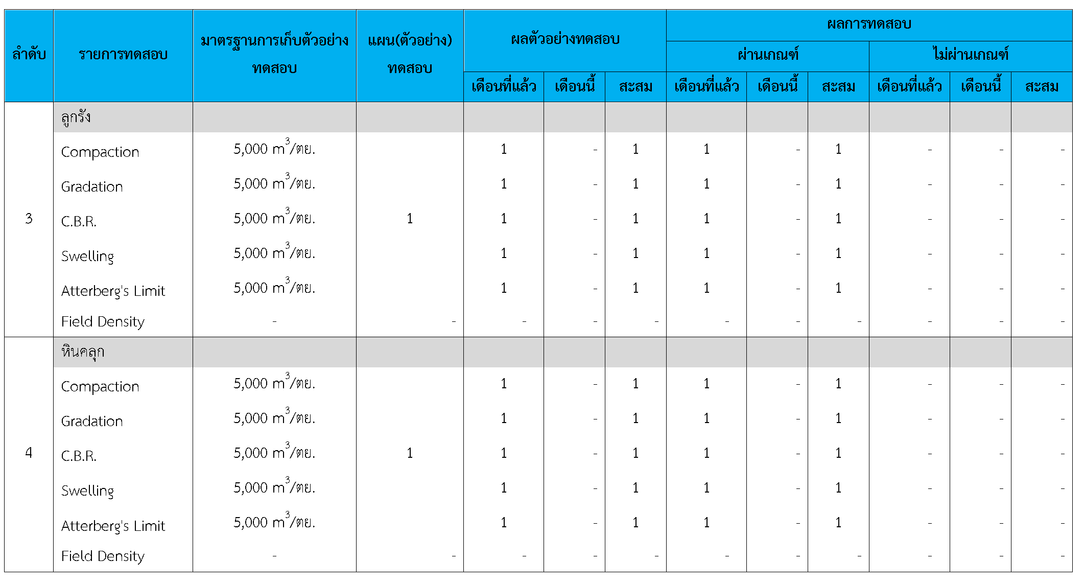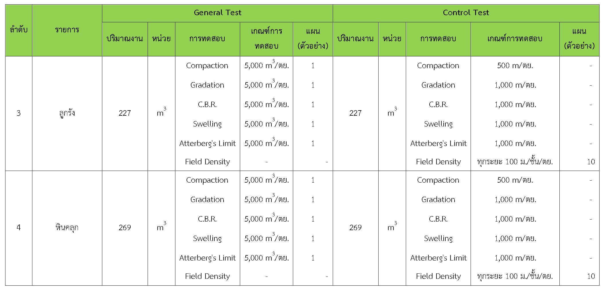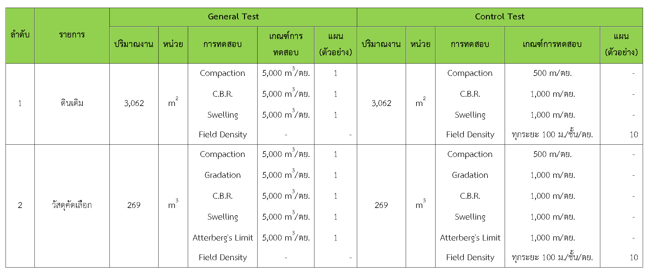 ในระหว่างวันที่ 1-30 เมษายน 2561 ผู้ว่าจ้างได้เสนอหนังสือขออนุมัติใช้วัสดุถึงที่ปรึกษา โดยที่ปรึกษาได้ตรวจสอบวัสดุดังกล่าวมีผลทดสอบดังตาราง