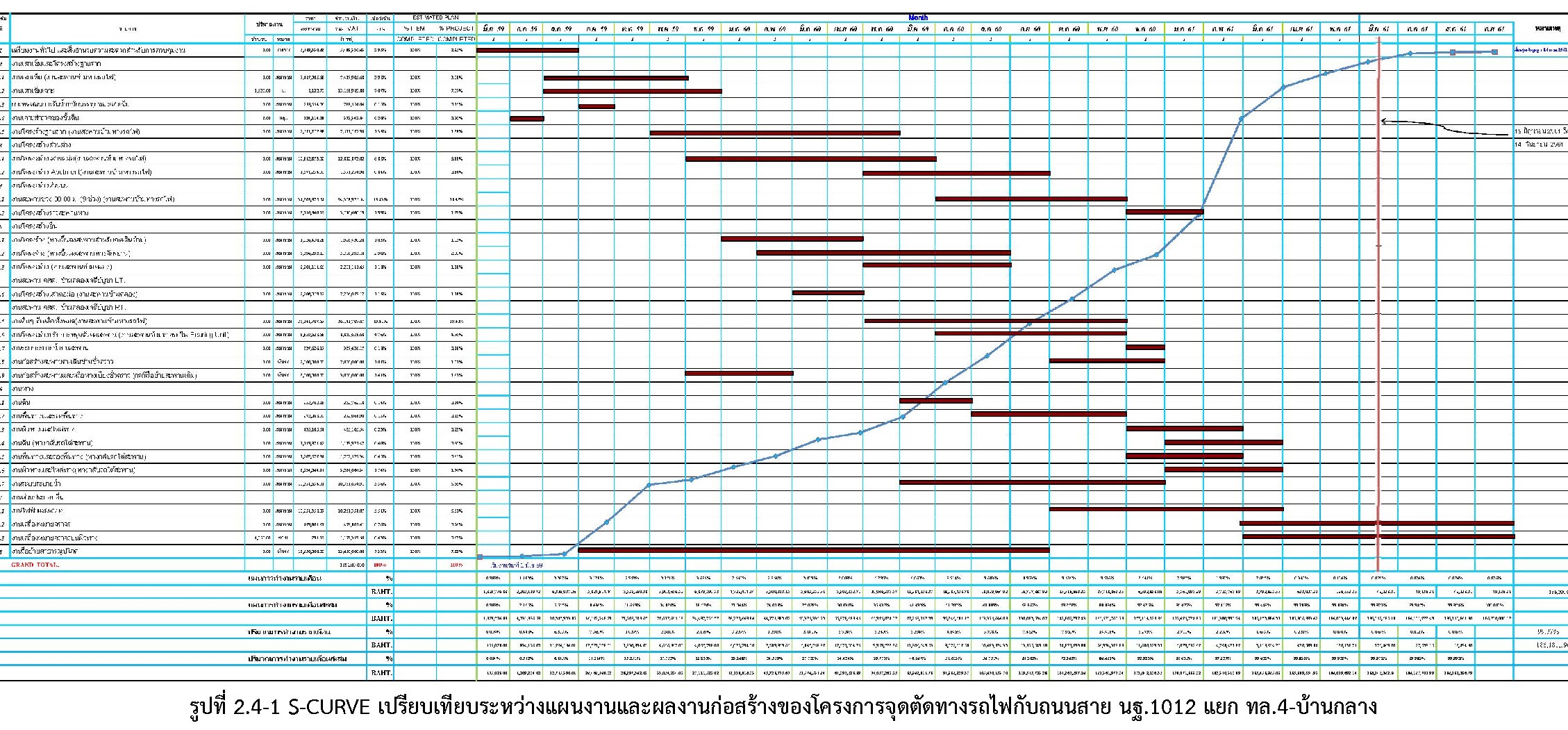 ที่ปรึกษาได้ติดตามความก้าวหน้าของงาน และนำมาจัดทำเป็น S-CURVE เปรียบเทียบกันระหว่างแผนงานและผลงานก่อสร้าง ดังรูปที่ 2.2-1