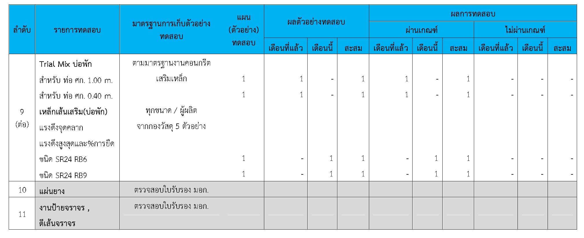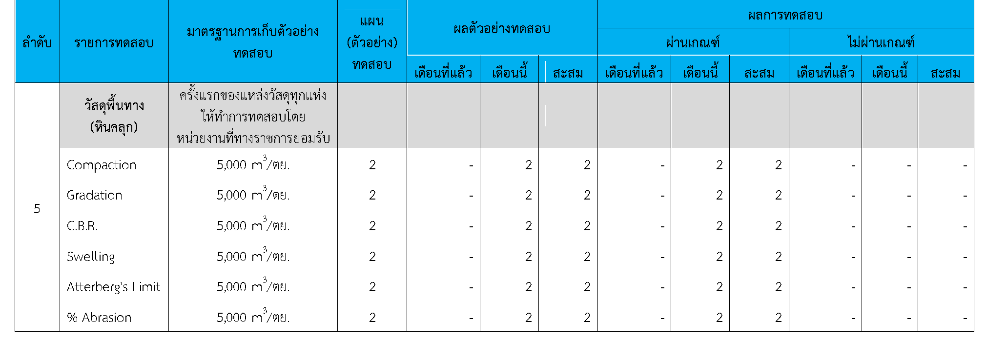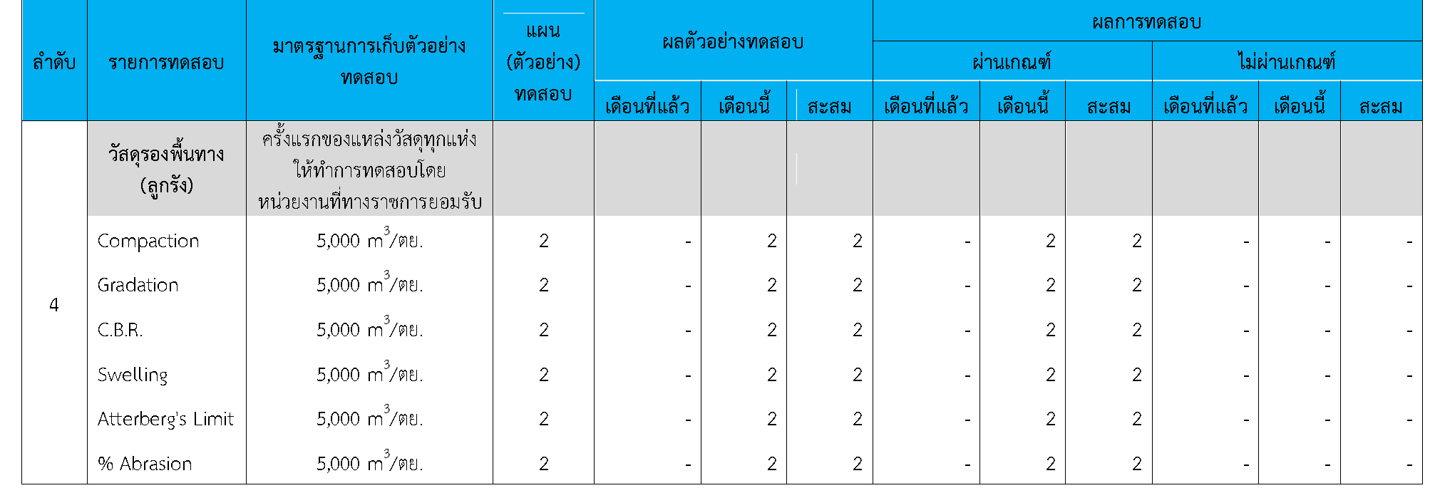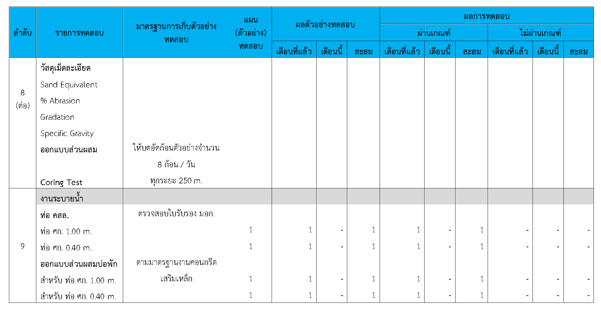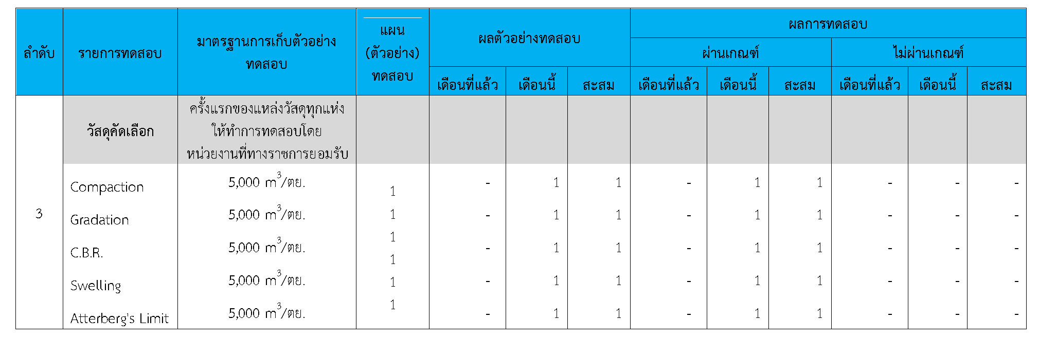 ในระหว่างวันที่ 1-30 กันยายน 2563ผู้ว่าจ้างได้เสนอหนังสือขออนุมัติใช้วัสดุถึงที่ปรึกษา โดยที่ปรึกษาได้ตรวจสอบวัสดุดังกล่าวมีผลทดสอบดังตาราง