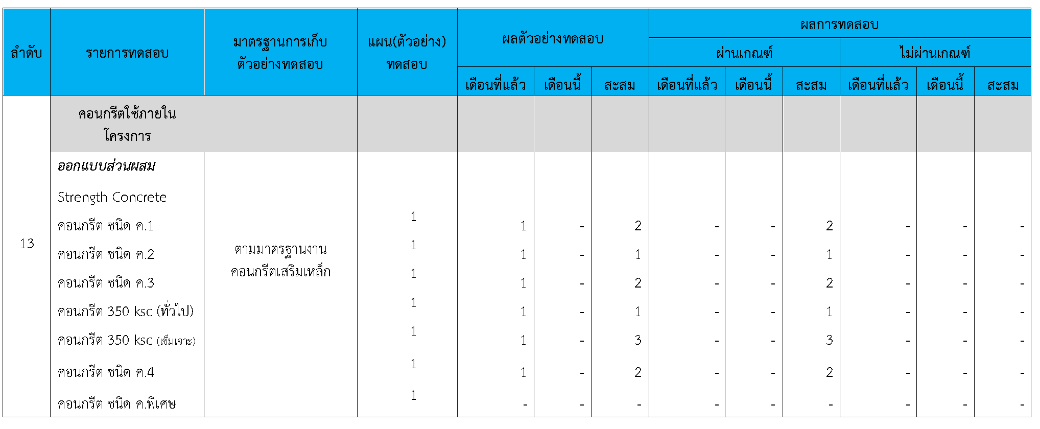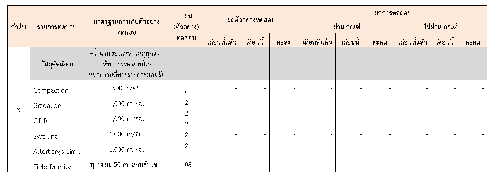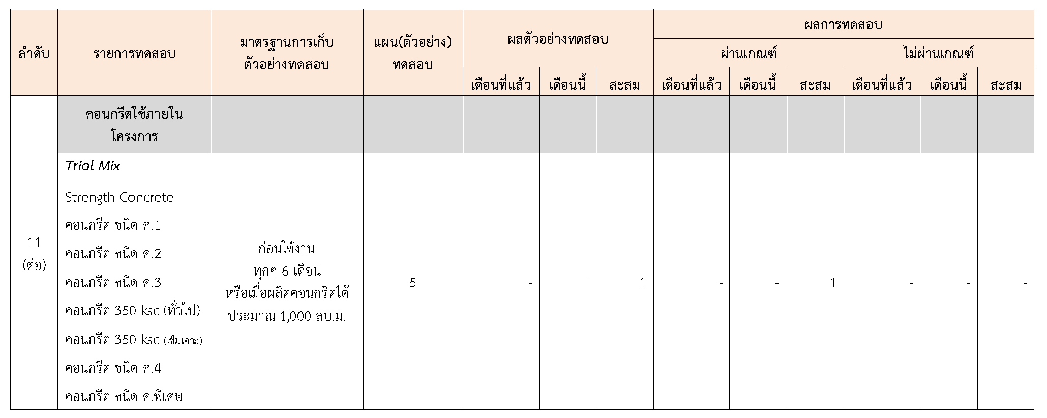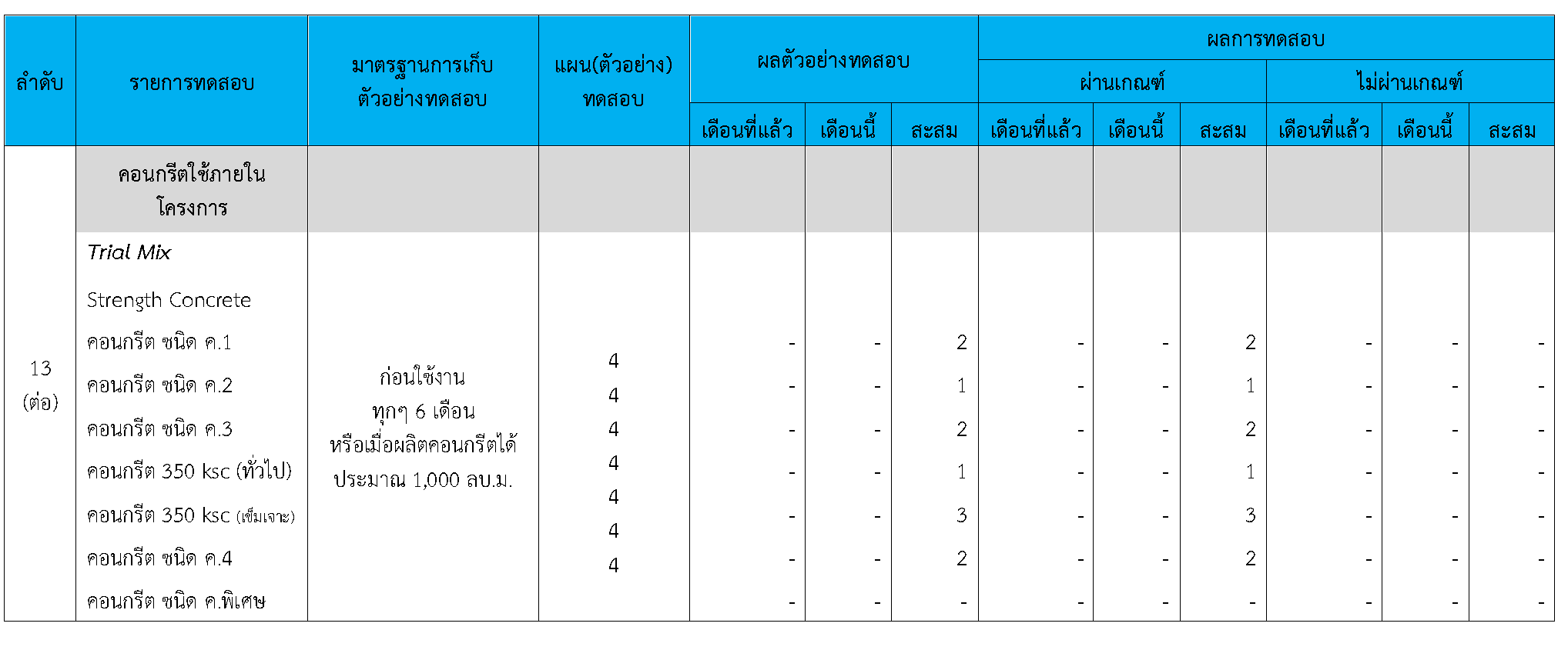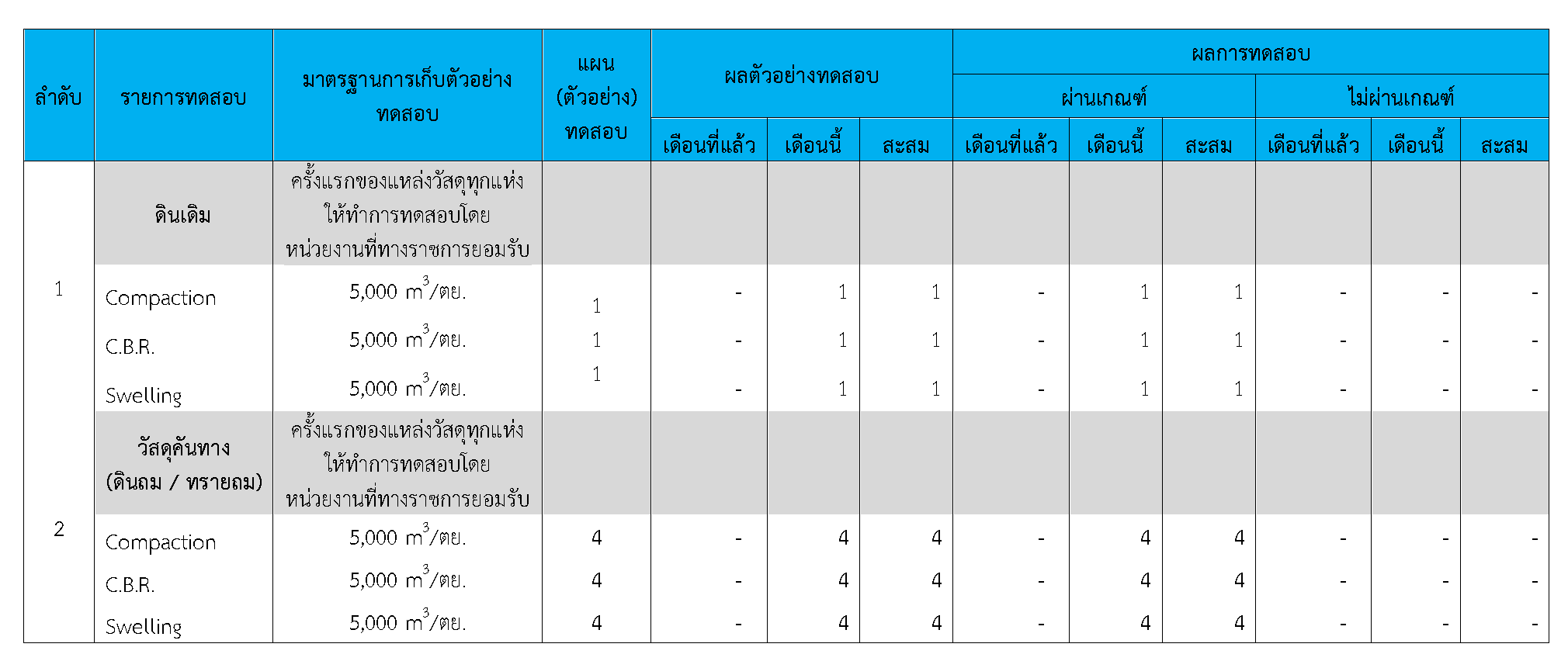 ในระหว่างวันที่ 1-30 กันยายน 2563ผู้ว่าจ้างได้เสนอหนังสือขออนุมัติใช้วัสดุถึงที่ปรึกษา โดยที่ปรึกษาได้ตรวจสอบวัสดุดังกล่าวมีผลทดสอบดังตาราง