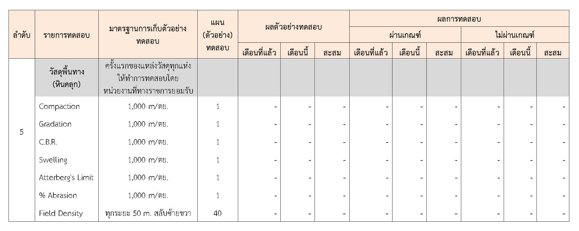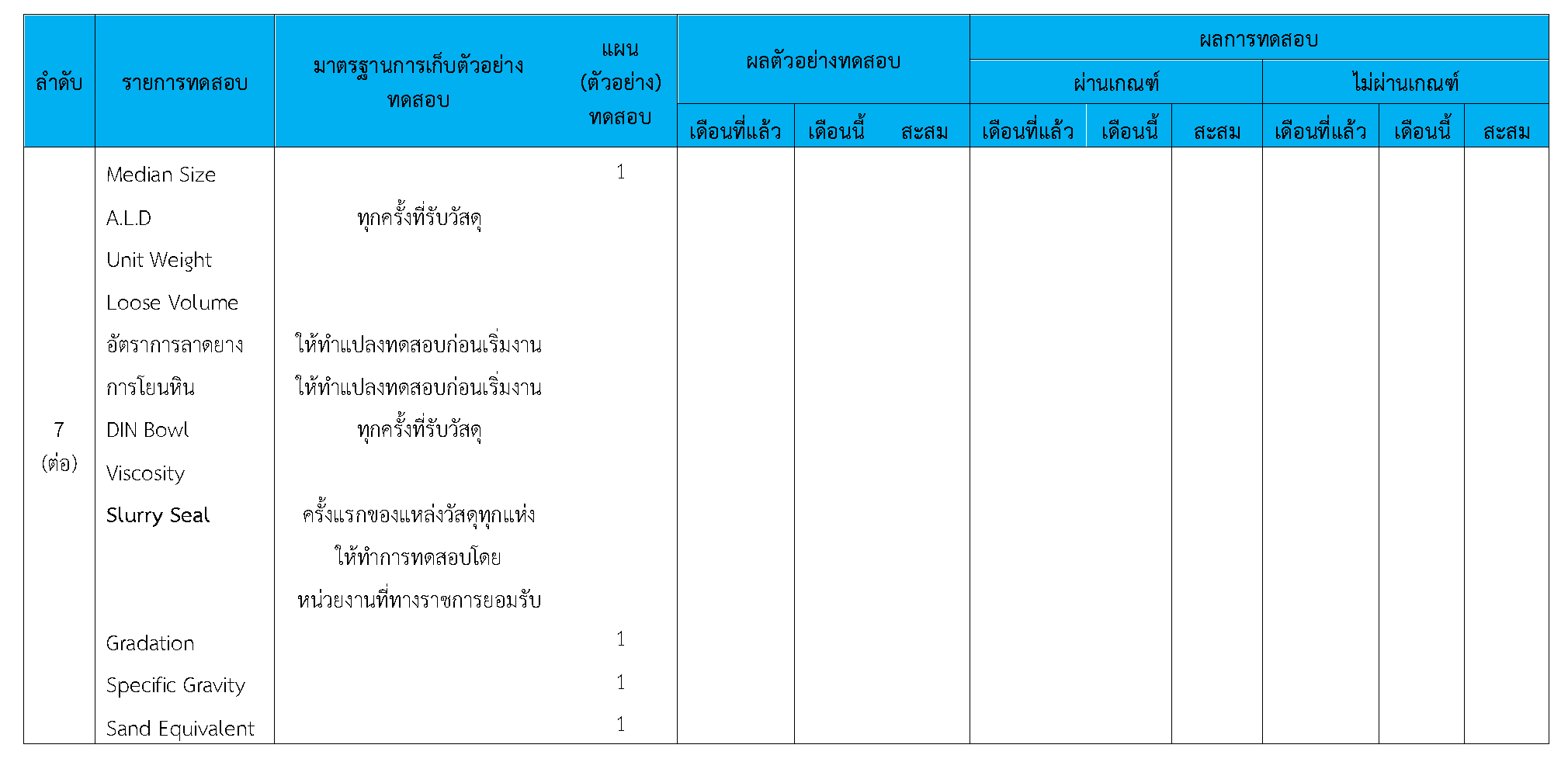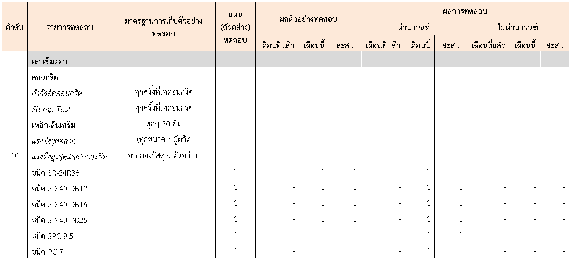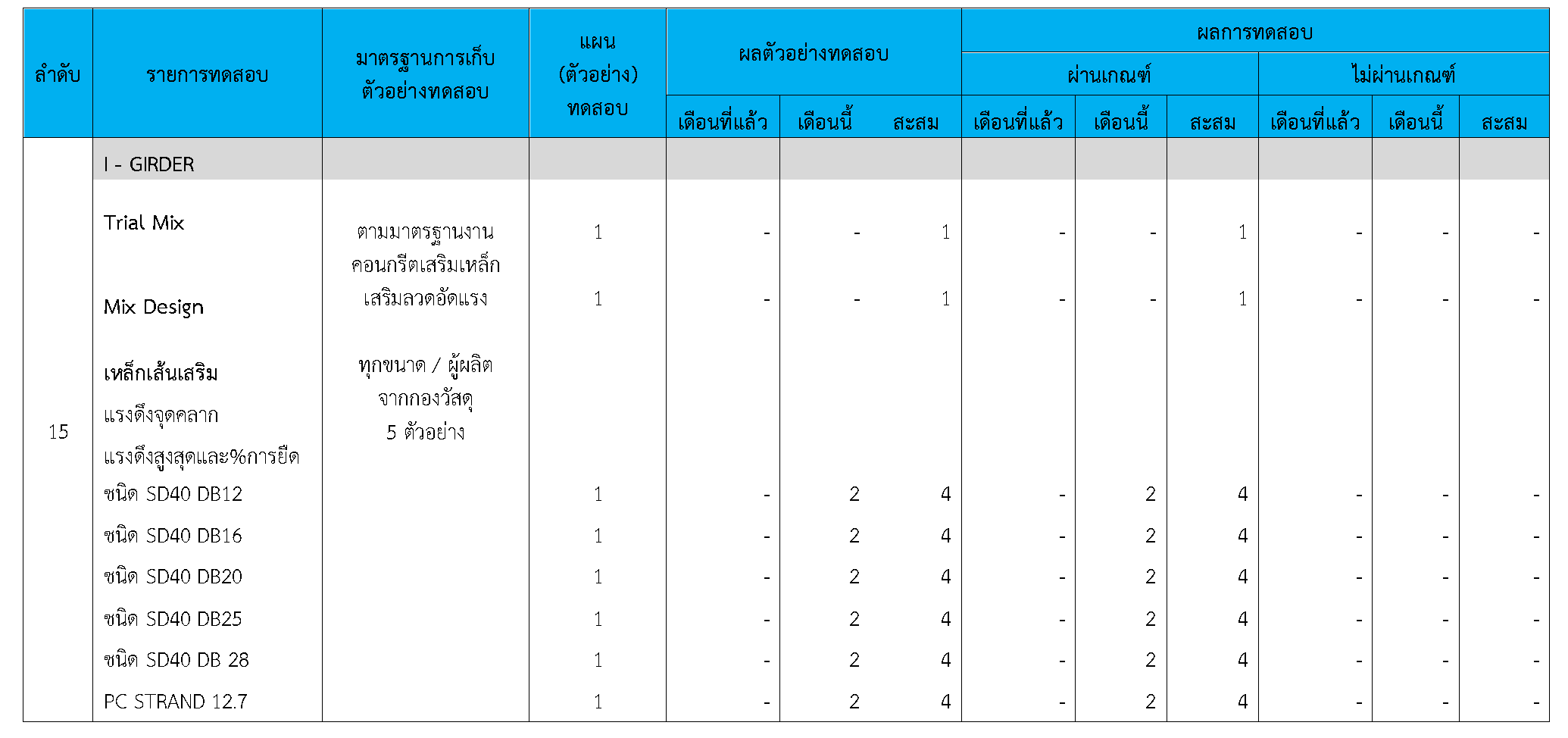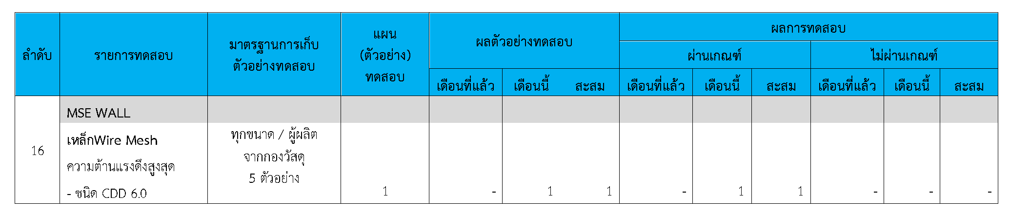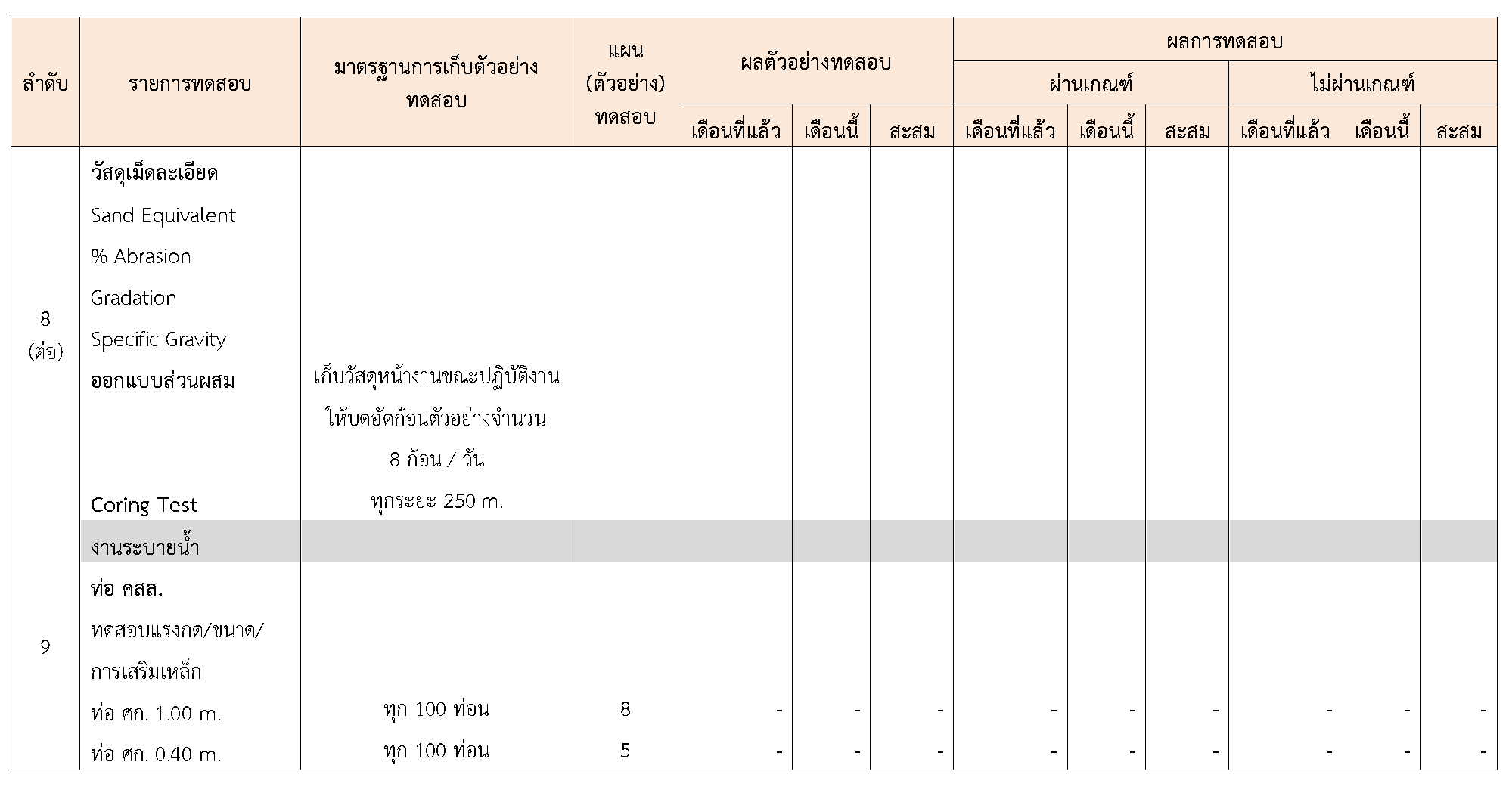 ในระหว่างวันที่ 1-30 กันยายน 2563ผู้ว่าจ้างได้เสนอหนังสือขออนุมัติใช้วัสดุถึงที่ปรึกษา โดยที่ปรึกษาได้ตรวจสอบวัสดุดังกล่าวมีผลทดสอบดังตาราง