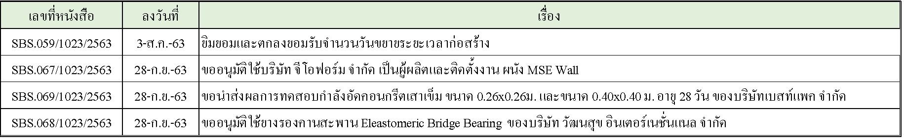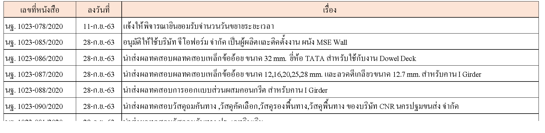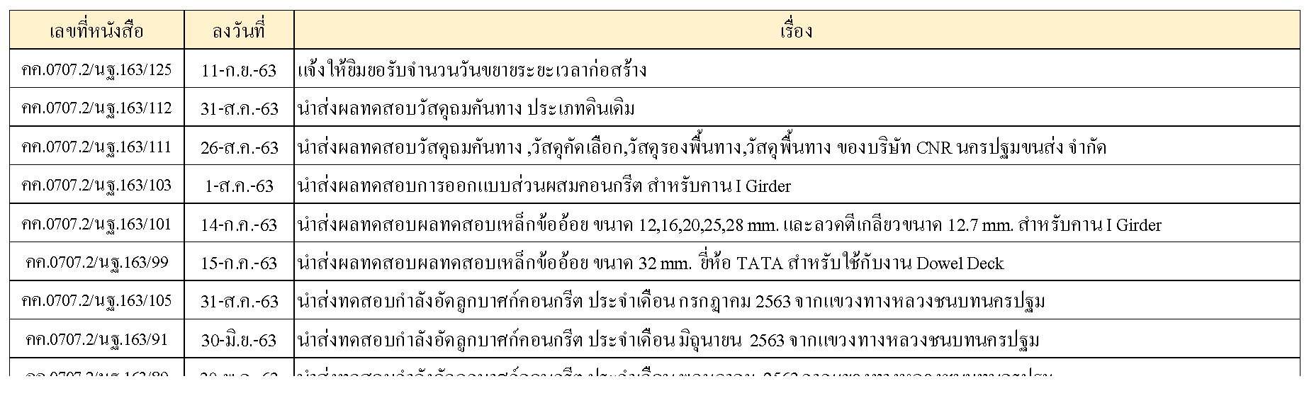 ในระหว่างวันที่ 1-30กันยายน 2563 ผู้ว่าจ้างได้เสนอหนังสือขออนุมัติใช้วัสดุถึงที่ปรึกษา โดยที่ปรึกษาได้ตรวจสอบวัสดุดังกล่าวมีผลทดสอบดังตาราง