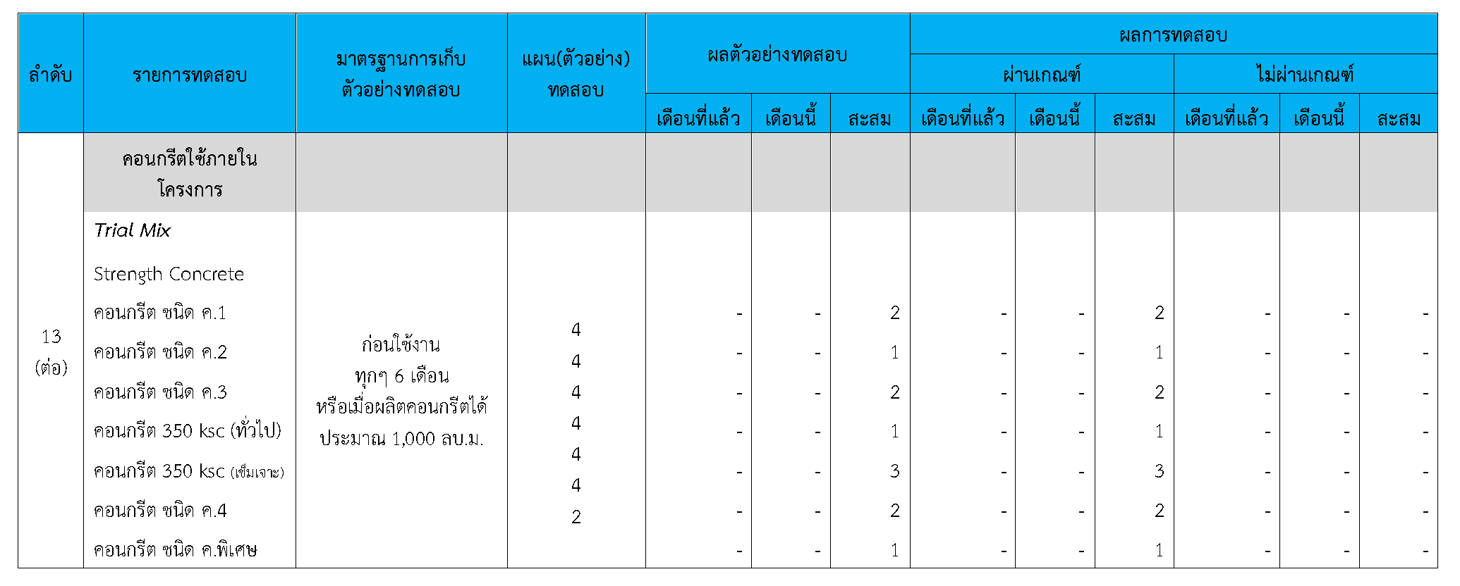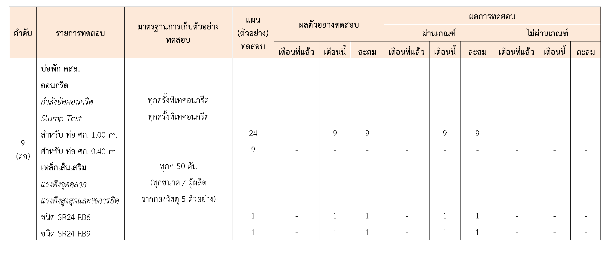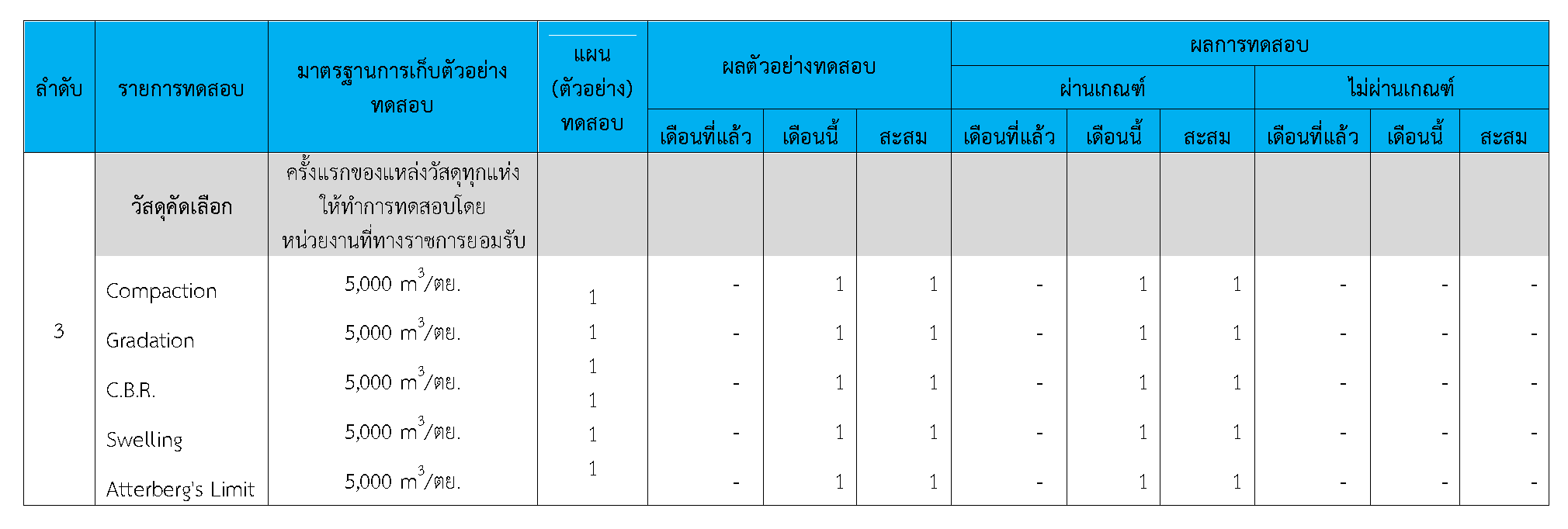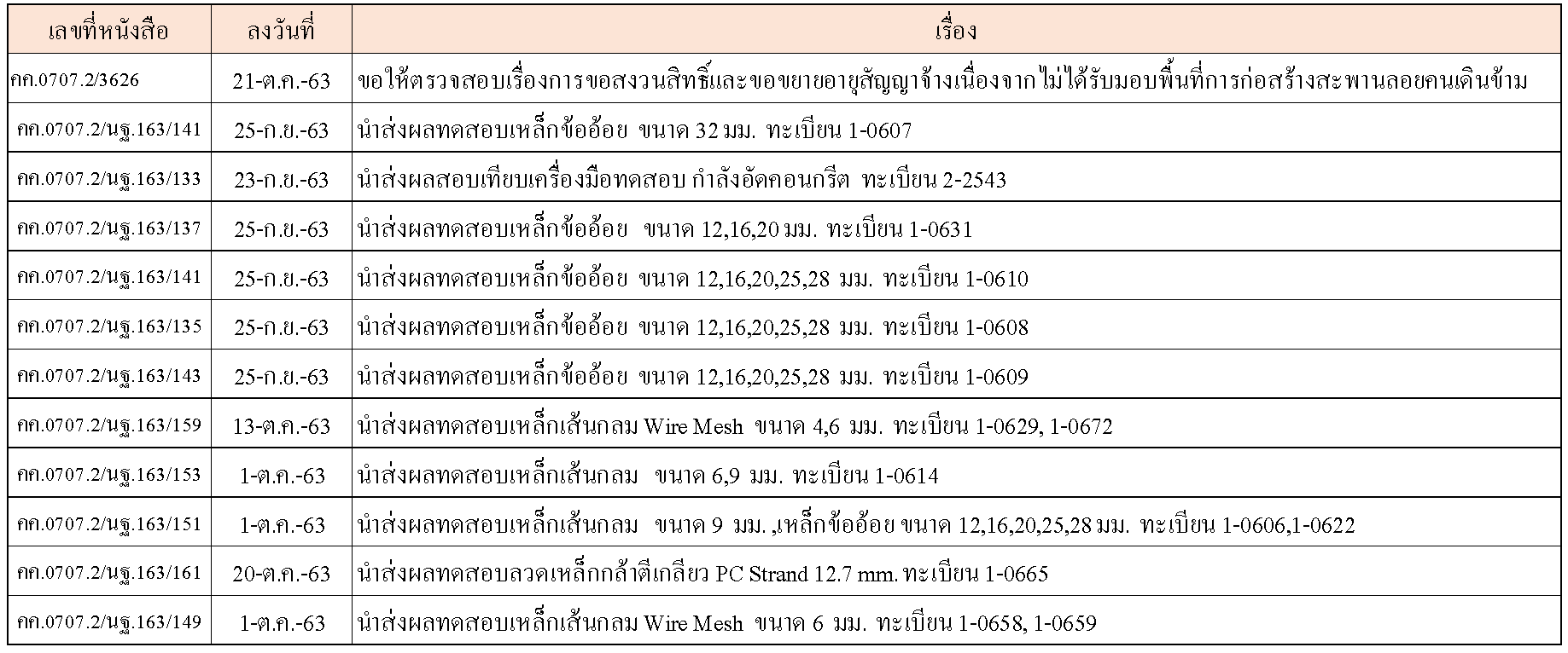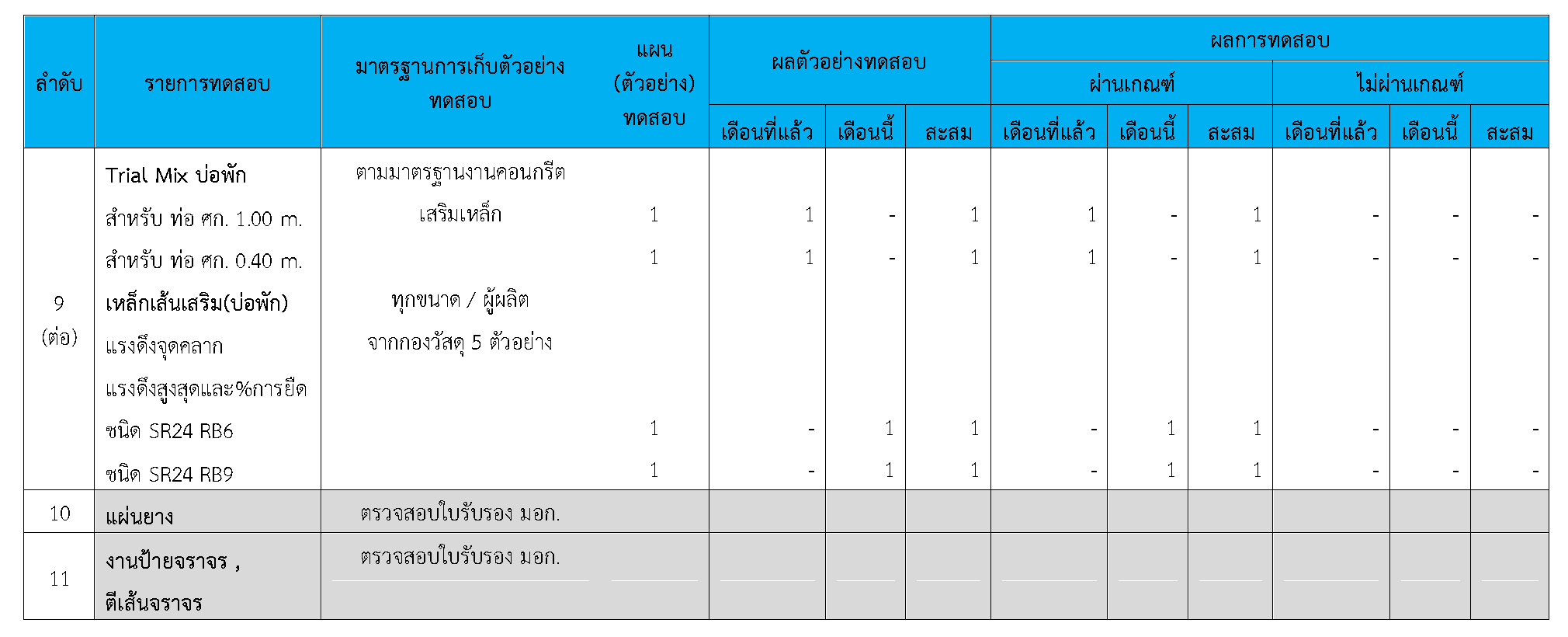 ในระหว่างวันที่ 1-31ตุลาคม 2563 ผู้ว่าจ้างได้เสนอหนังสือขออนุมัติใช้วัสดุถึงที่ปรึกษา โดยที่ปรึกษาได้ตรวจสอบวัสดุดังกล่าวมีผลทดสอบดังตาราง