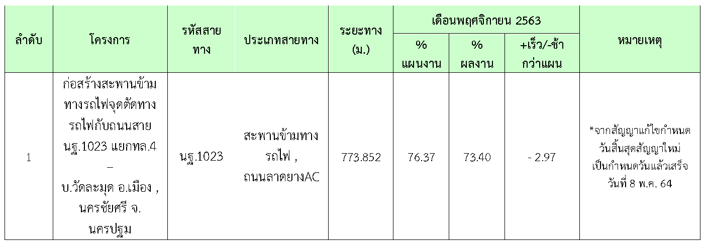 ในเดือน พฤศจิกายน2563 ที่ปรึกษาได้ปฏิบัติงานควบคุมงานก่อสร้างโครงการ สรุปการดำเนินงานได้ดังนี้