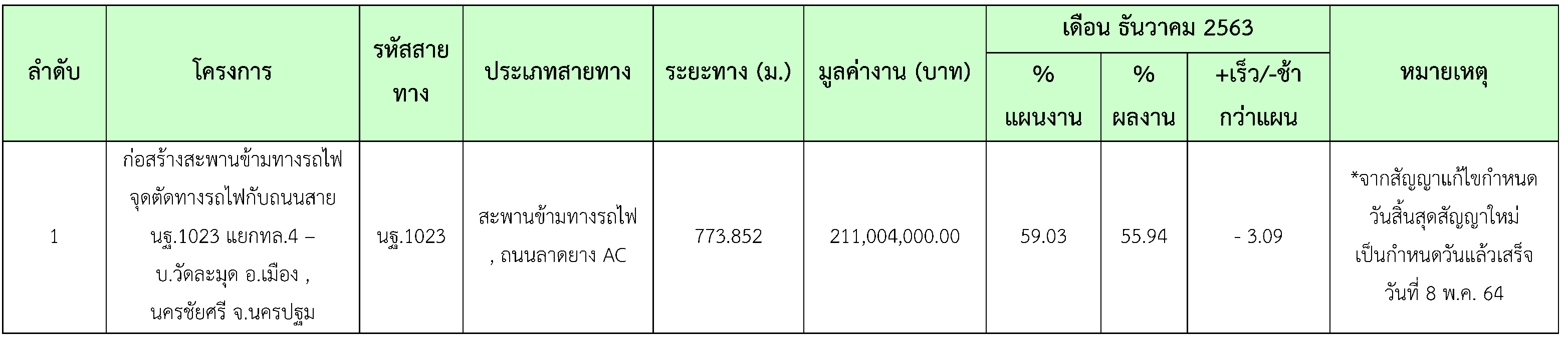 ในเดือน ธันวาคม 2563 มีความก้าวหน้าของงานก่อสร้างและการตรวจรับงาน ดังสรุปในตารางที่ 2.3-1