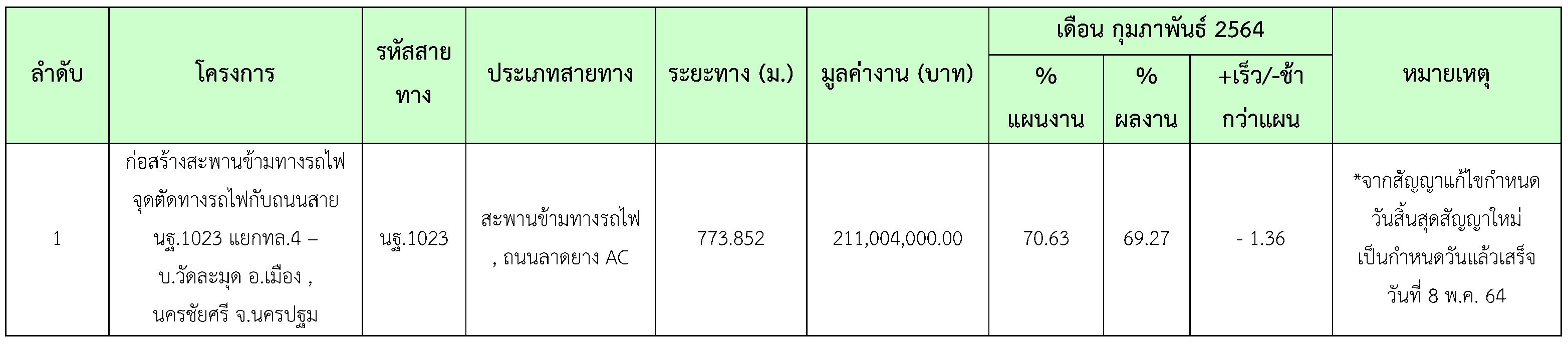 ในเดือน กุมภาพันธ์2564 มีความก้าวหน้าของงานก่อสร้างและการตรวจรับงาน ดังสรุปในตารางที่ 2.3-1