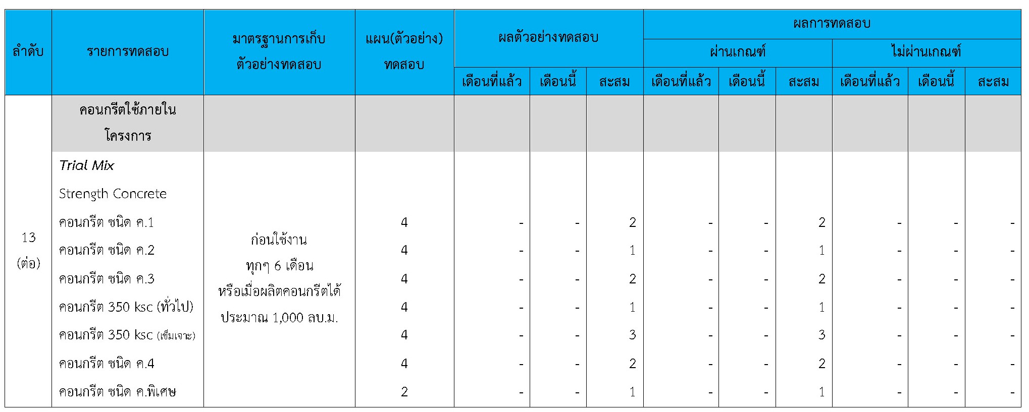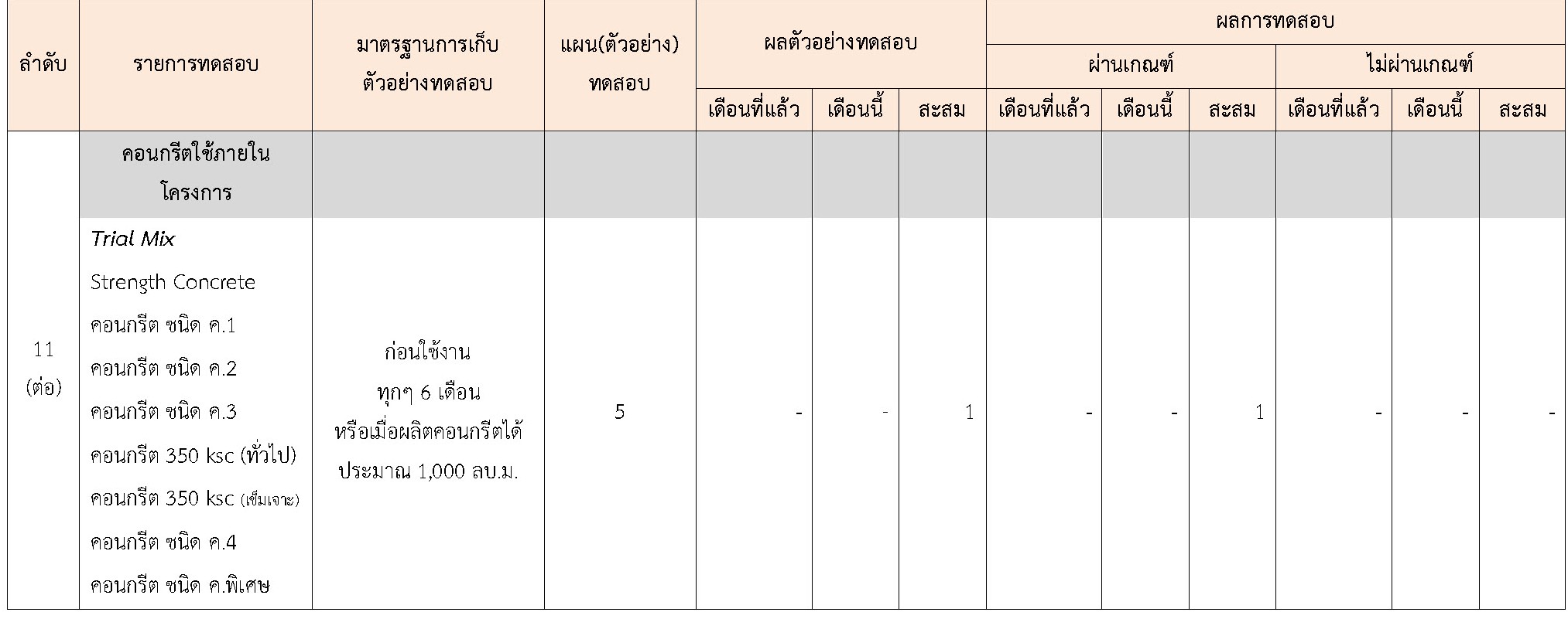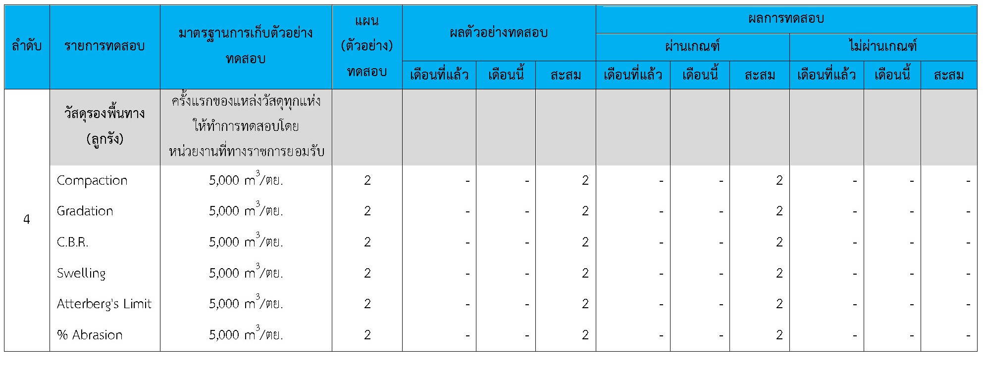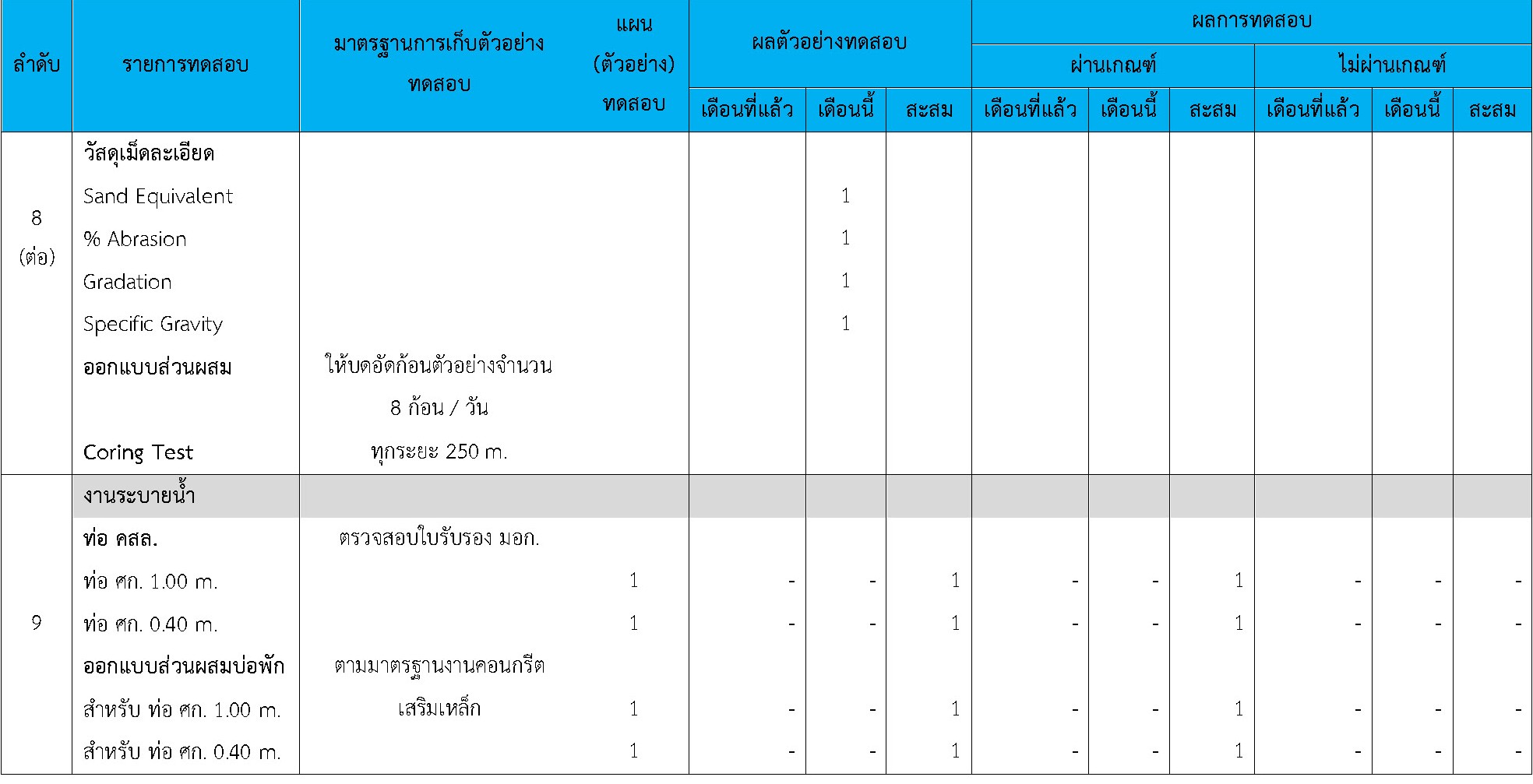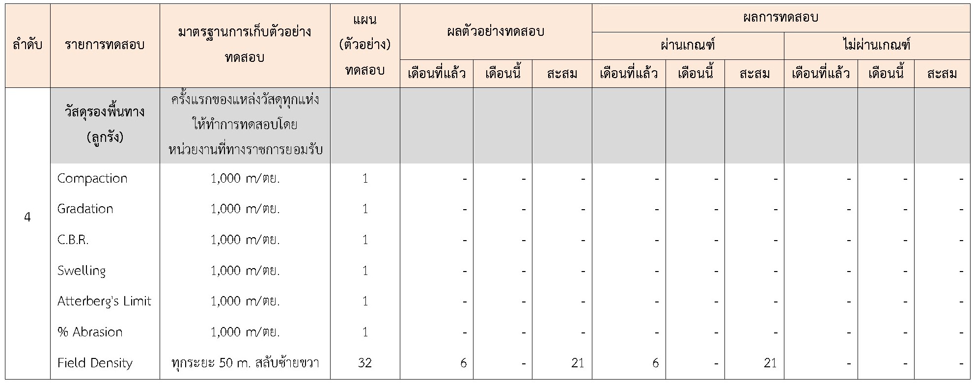 ในระหว่างวันที่ 1-30 เมษายน 2564ผู้ว่าจ้างได้เสนอหนังสือขออนุมัติใช้วัสดุถึงที่ปรึกษา โดยที่ปรึกษาได้ตรวจสอบวัสดุดังกล่าวมีผลทดสอบดังตาราง