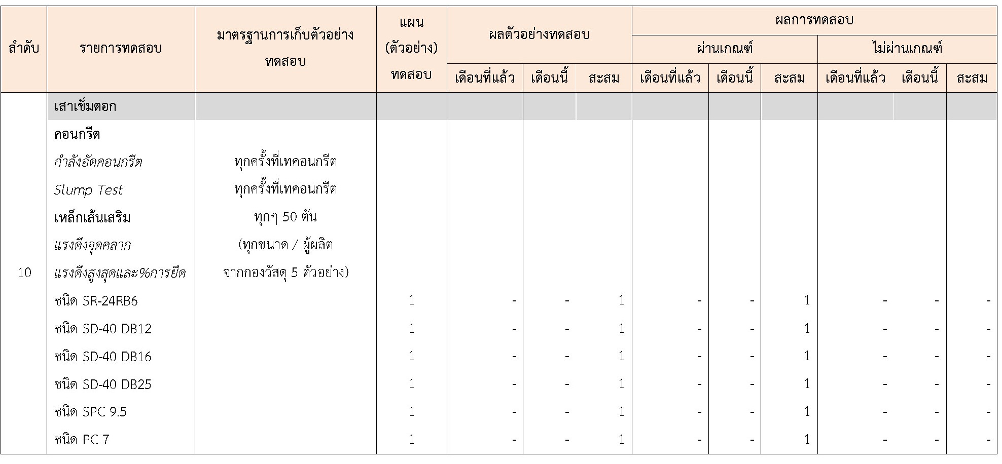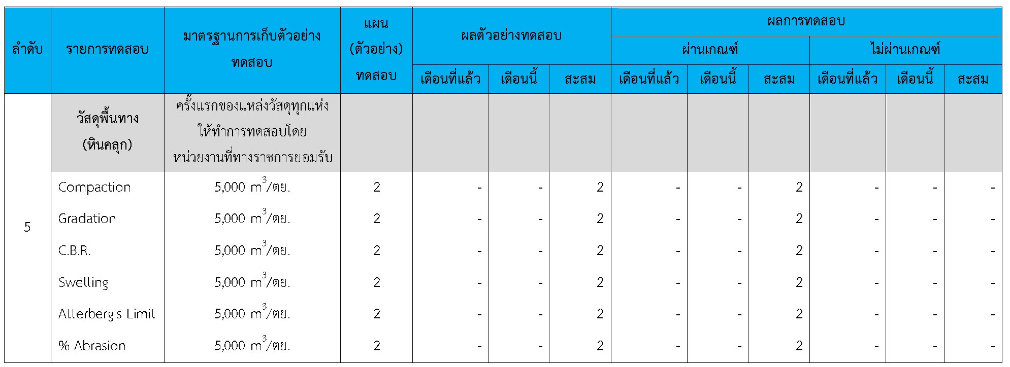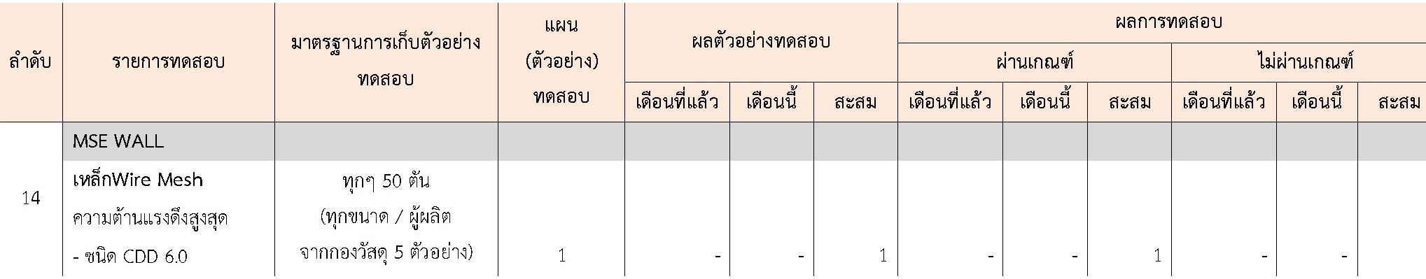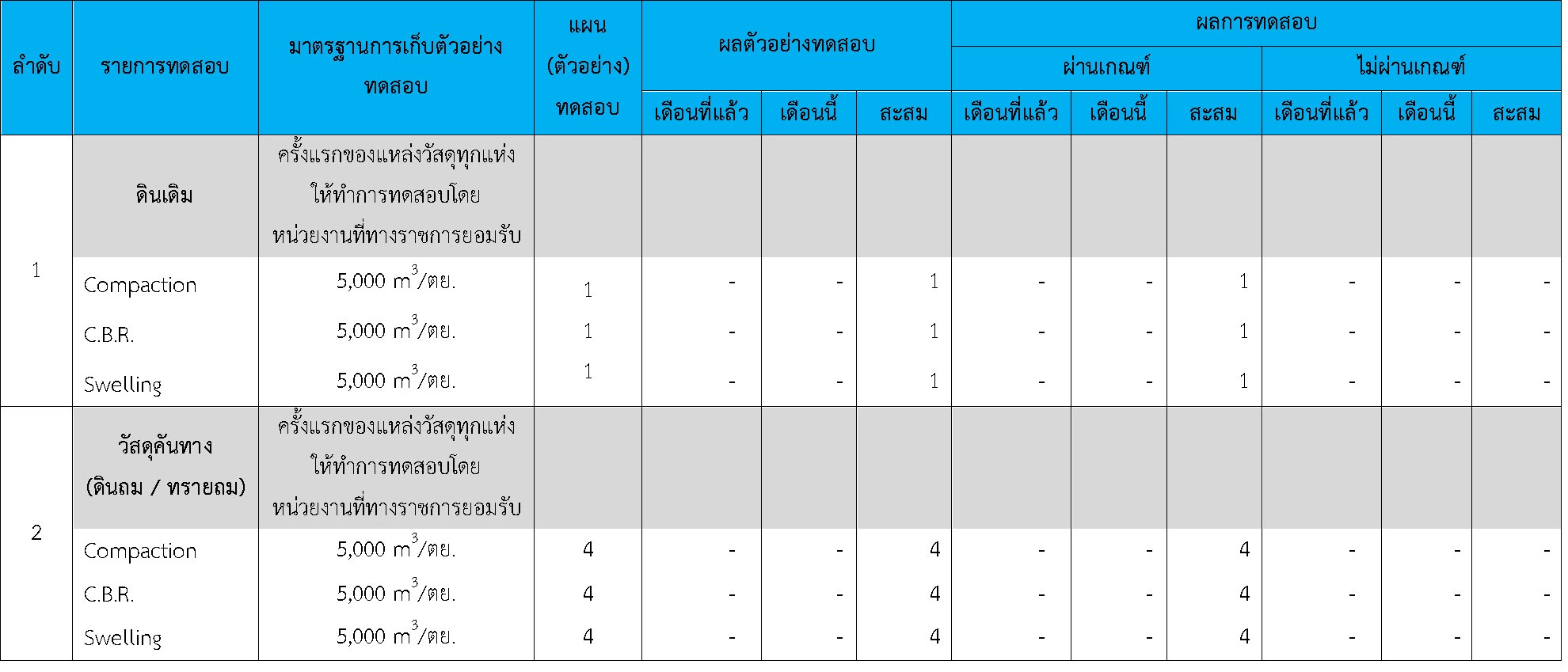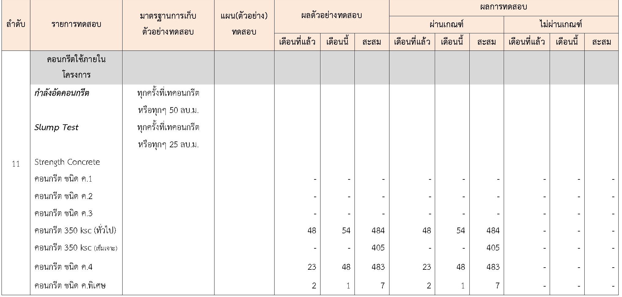 ในระหว่างวันที่ 1-30 เมษายน 2564ผู้ว่าจ้างได้เสนอหนังสือขออนุมัติใช้วัสดุถึงที่ปรึกษา โดยที่ปรึกษาได้ตรวจสอบวัสดุดังกล่าวมีผลทดสอบดังตาราง