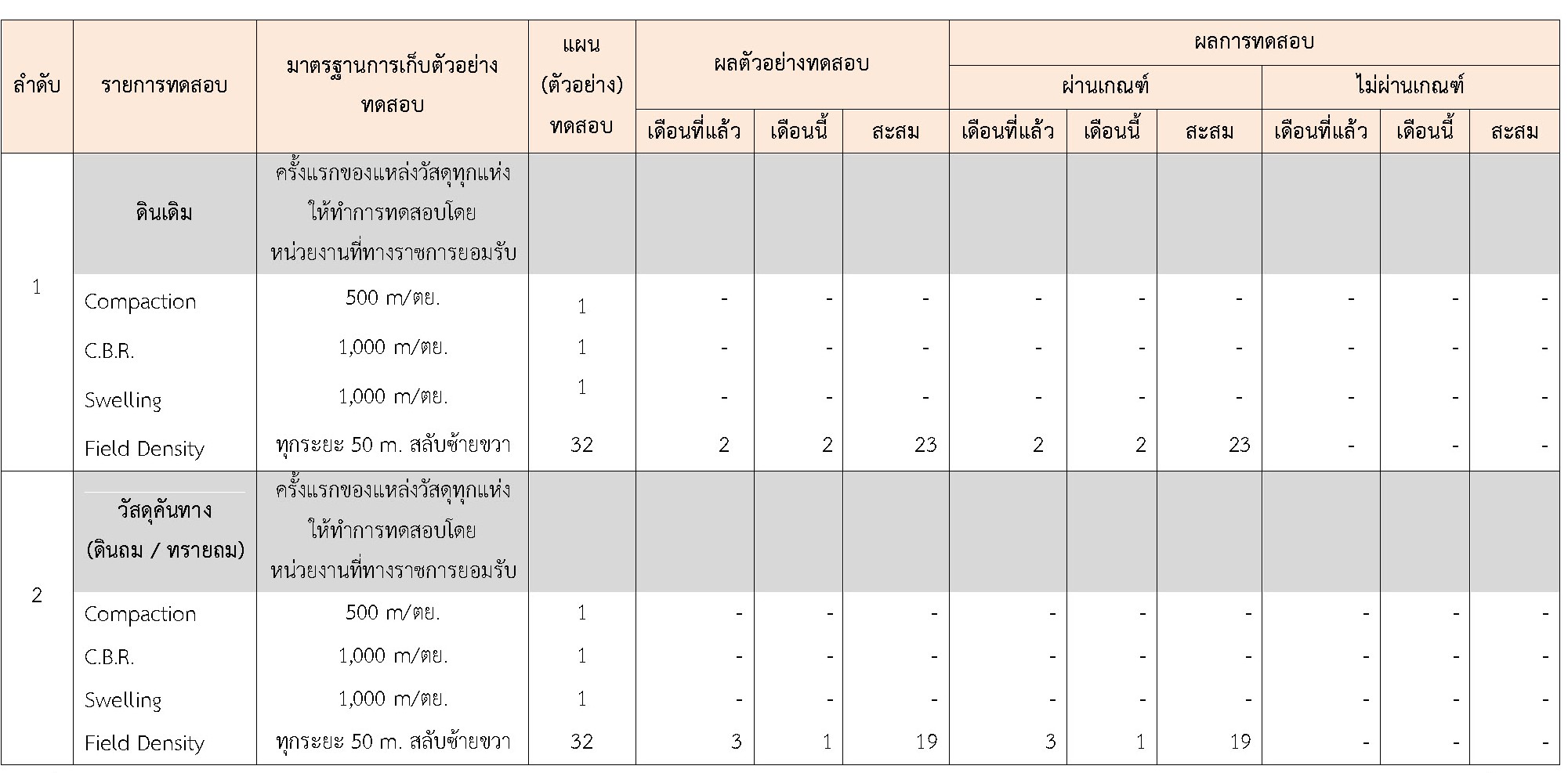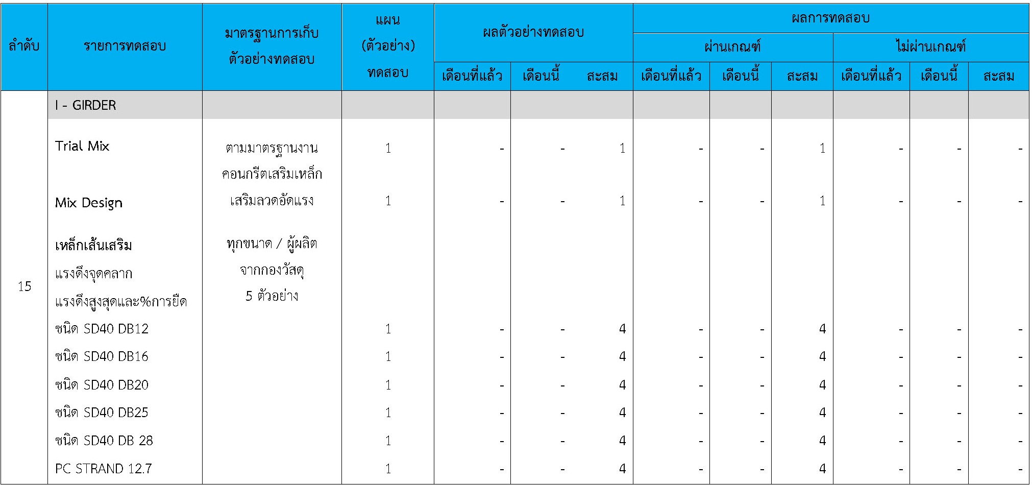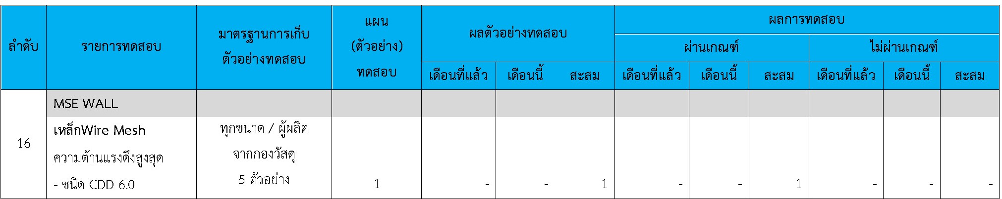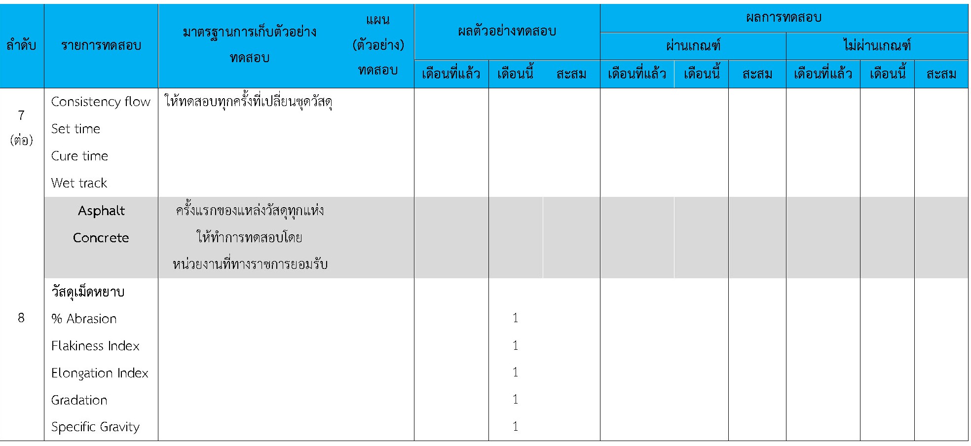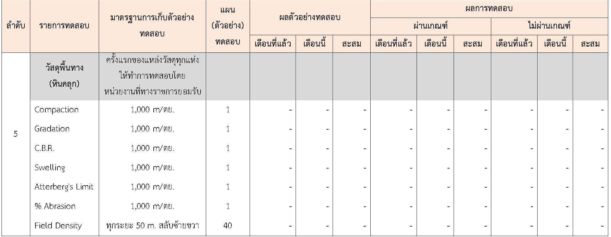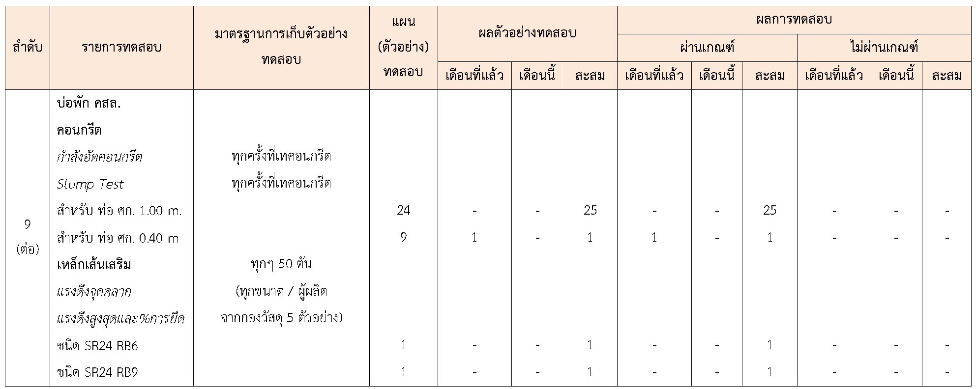 ในระหว่างวันที่ 1-30 เมษายน 2564ผู้ว่าจ้างได้เสนอหนังสือขออนุมัติใช้วัสดุถึงที่ปรึกษา โดยที่ปรึกษาได้ตรวจสอบวัสดุดังกล่าวมีผลทดสอบดังตาราง