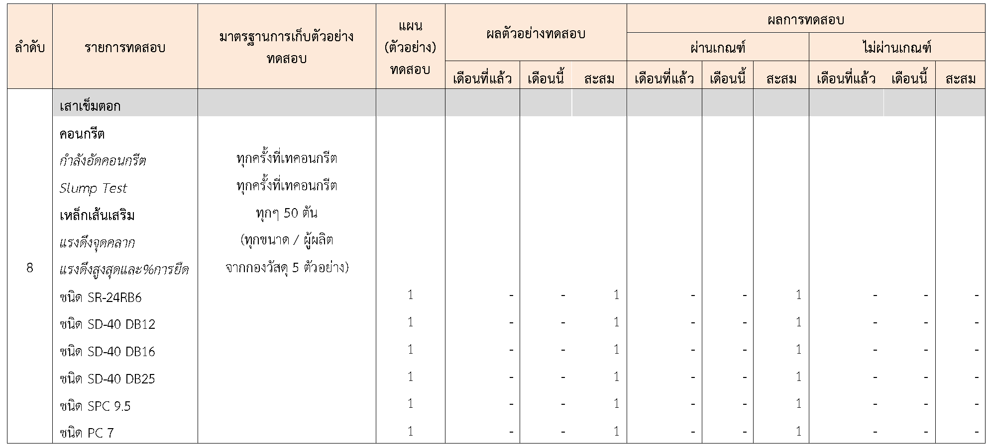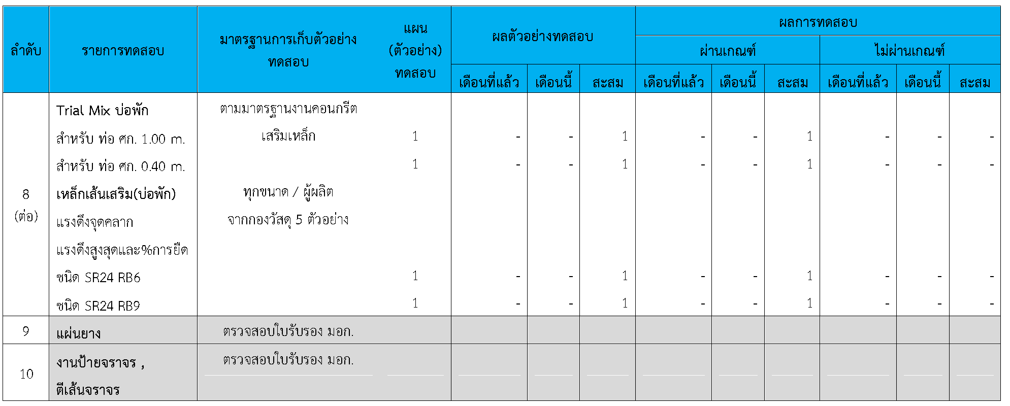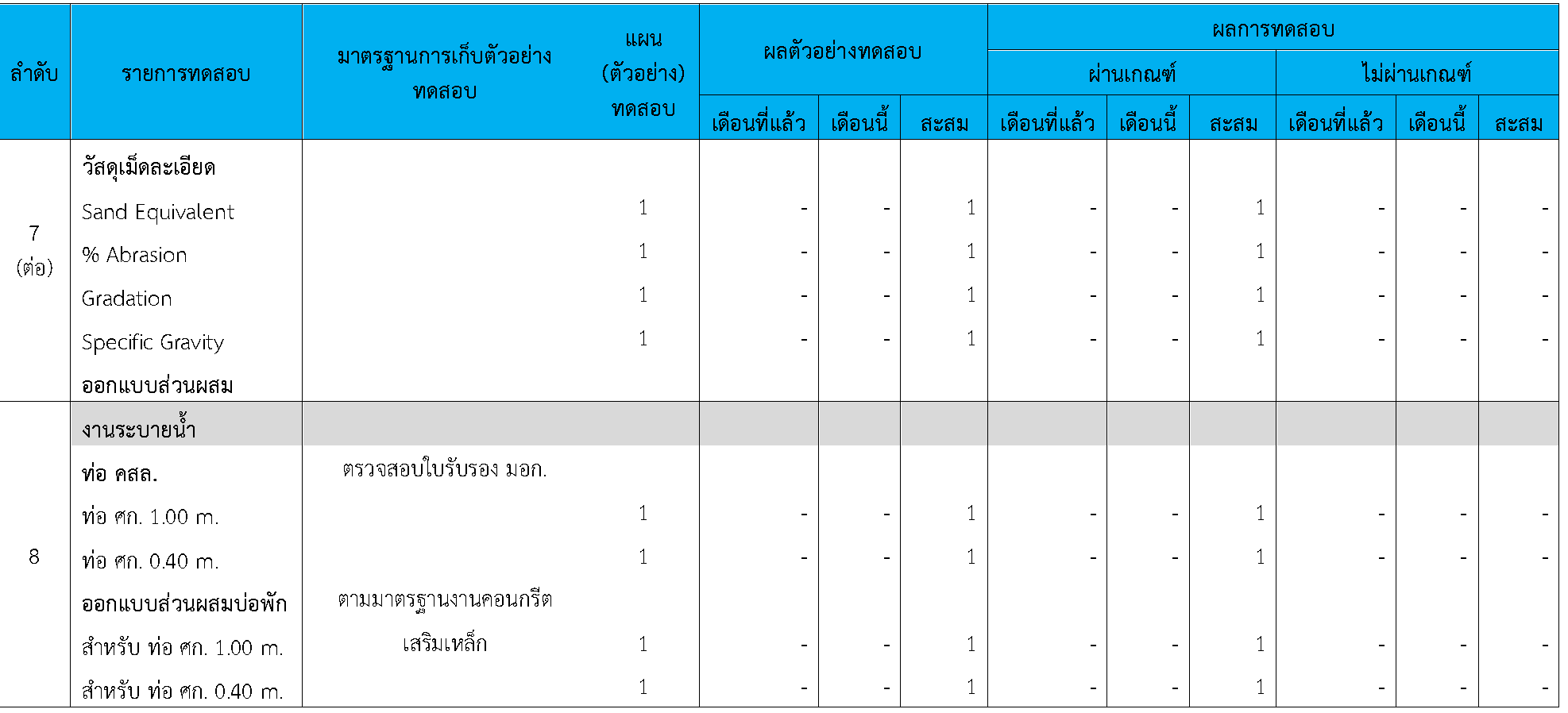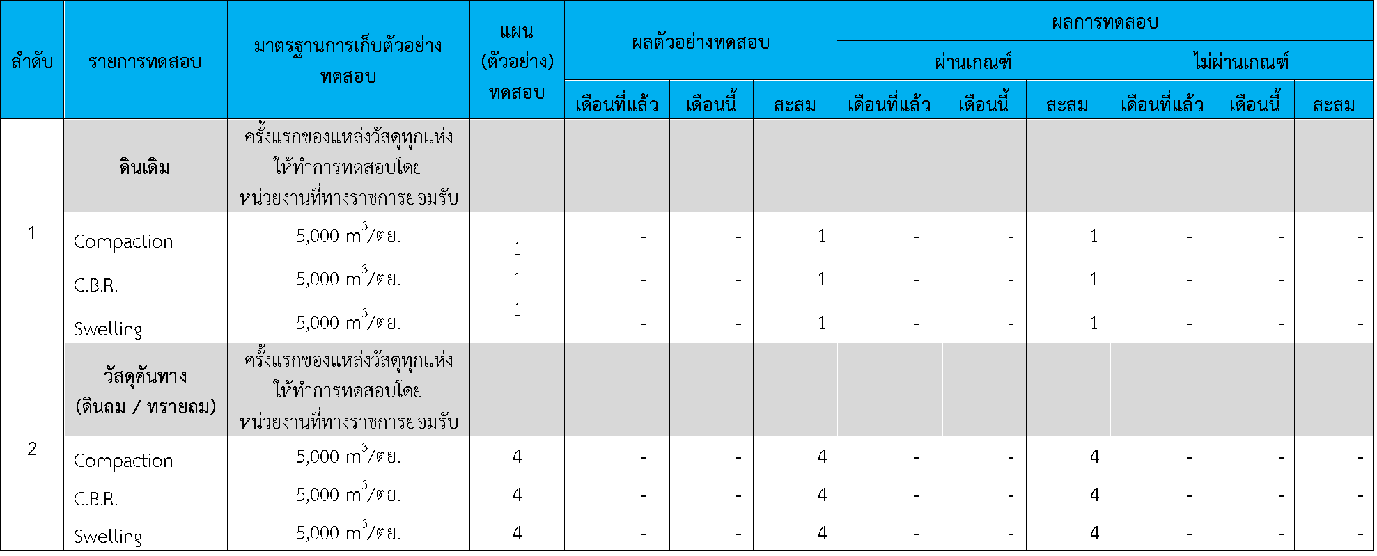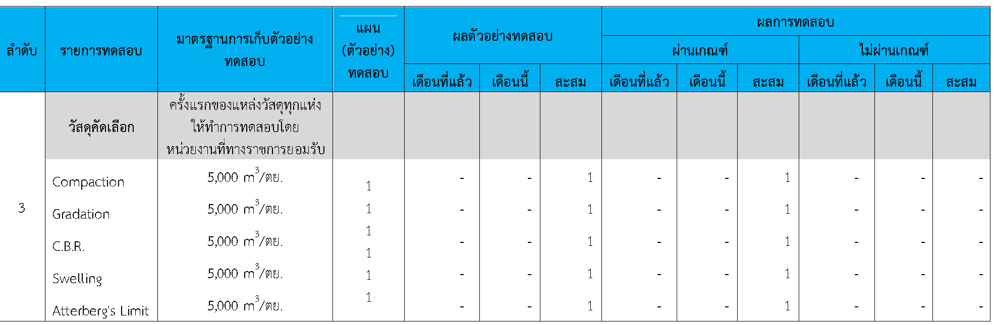 ในระหว่างวันที่ 1-31สิงหาคม 2564ผู้ว่าจ้างได้เสนอหนังสือขออนุมัติใช้วัสดุถึงที่ปรึกษา โดยที่ปรึกษาได้ตรวจสอบวัสดุดังกล่าวมีผลทดสอบดังตาราง
