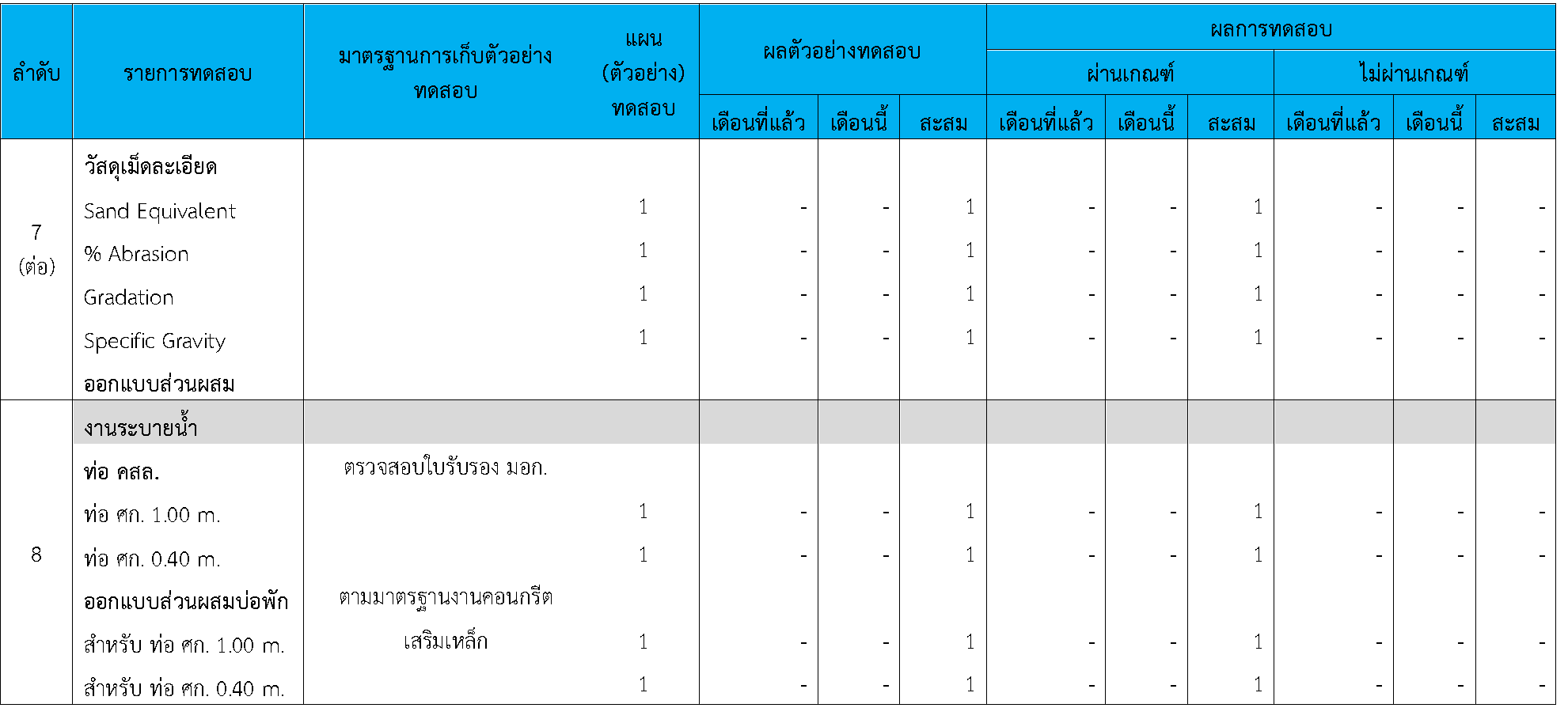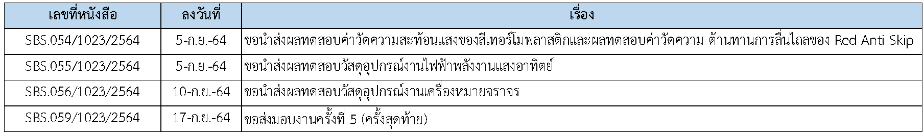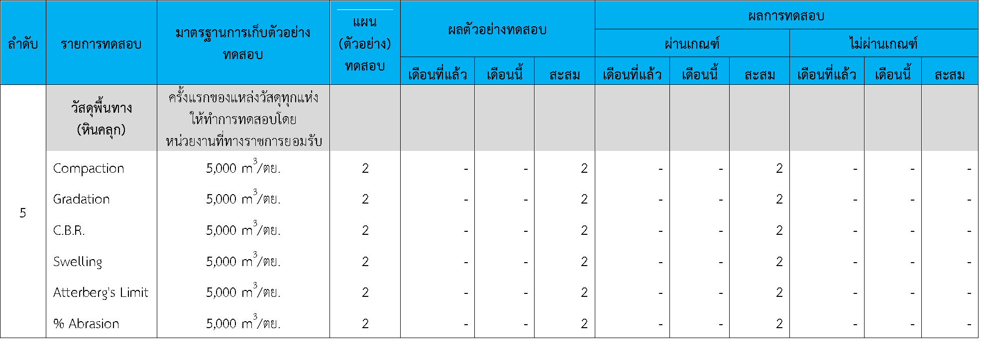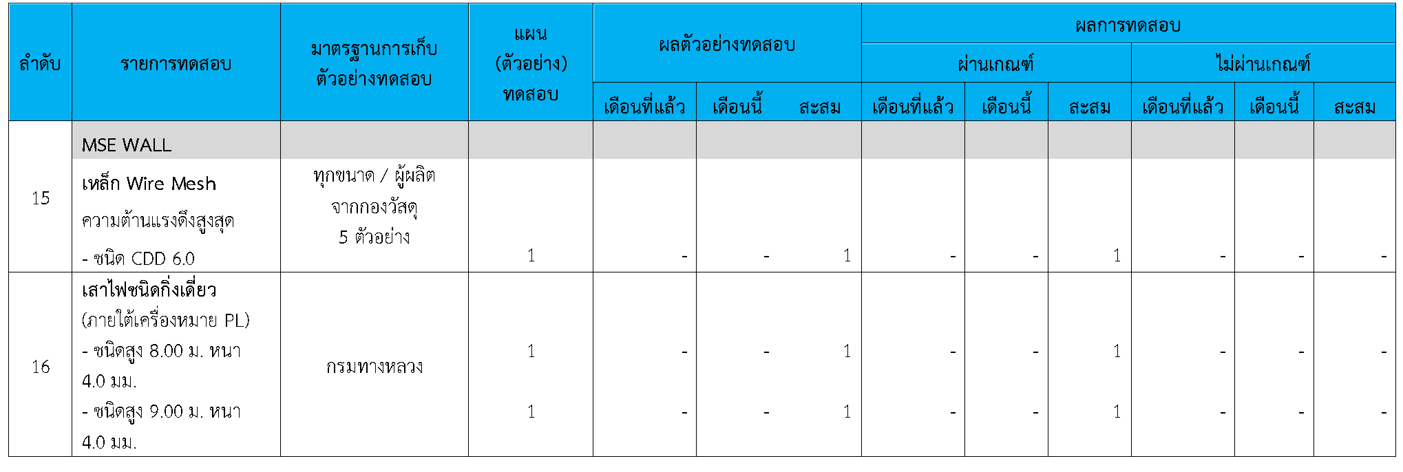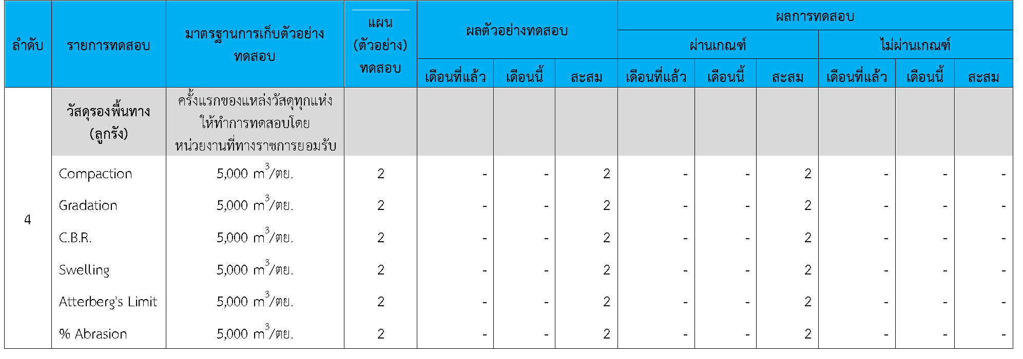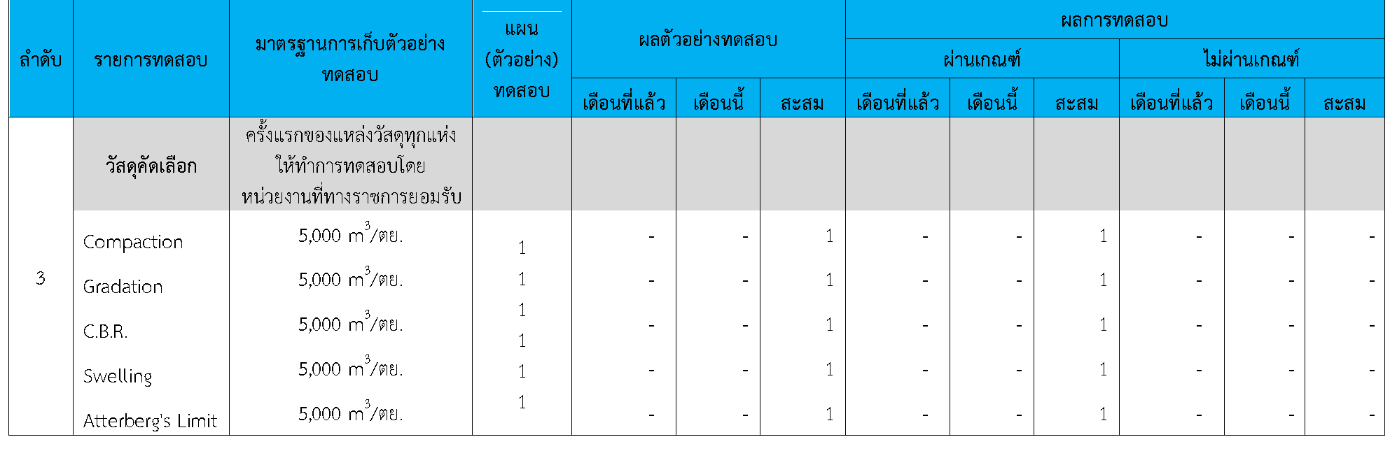 ในระหว่างวันที่ 1-30 กันยายน 2564 ผู้ว่าจ้างได้เสนอหนังสือขออนุมัติใช้วัสดุถึงที่ปรึกษา โดยที่ปรึกษาได้ตรวจสอบวัสดุดังกล่าวมีผลทดสอบดังตาราง