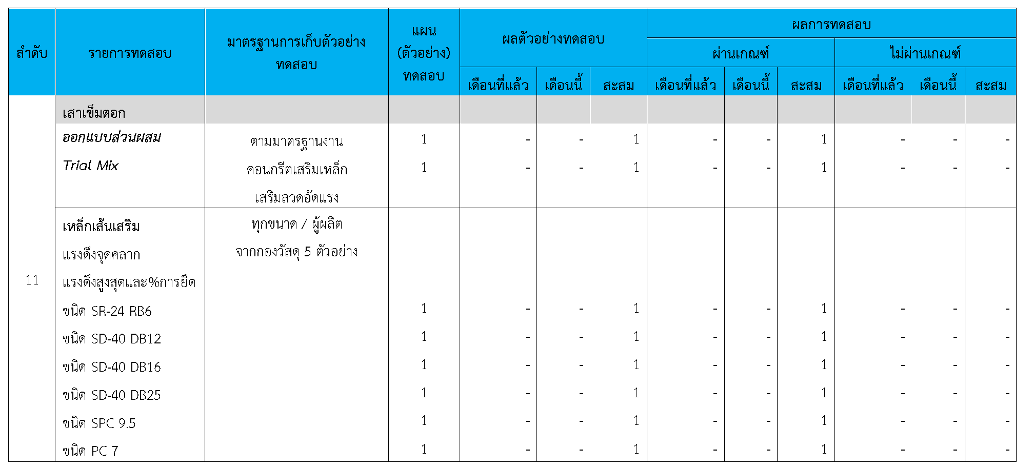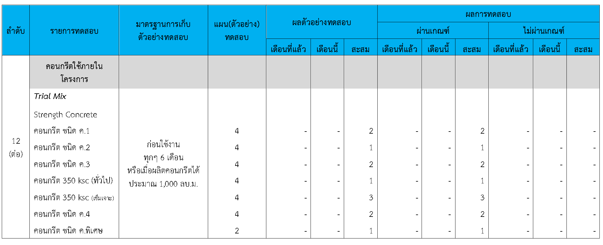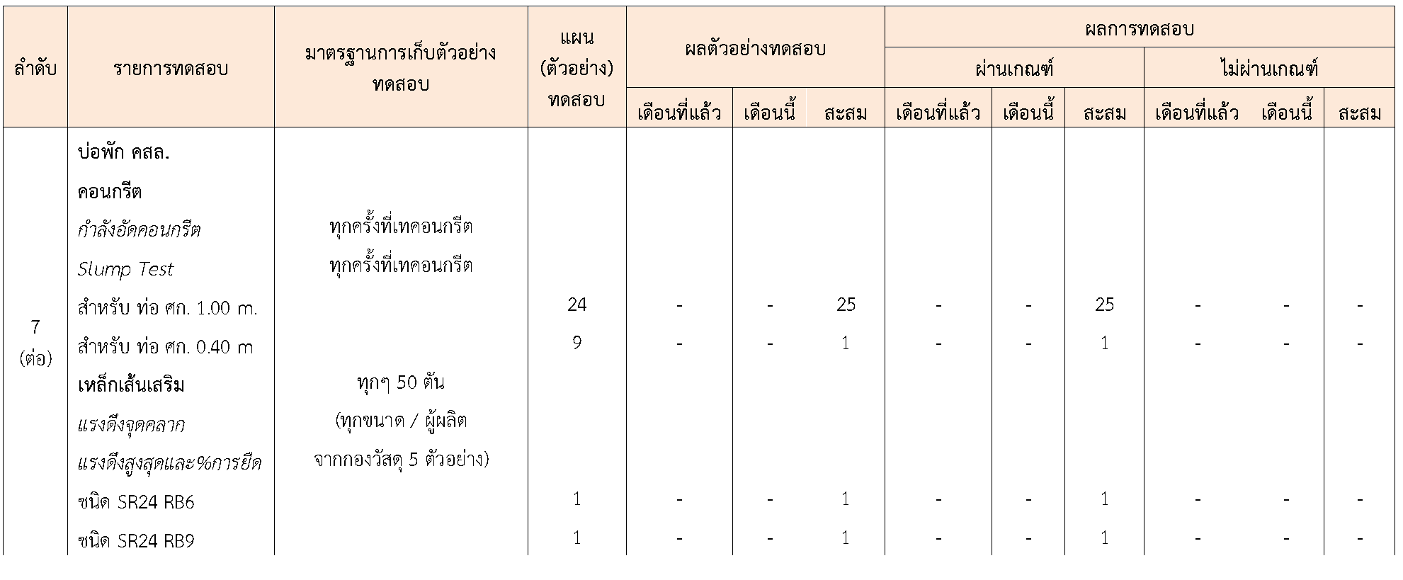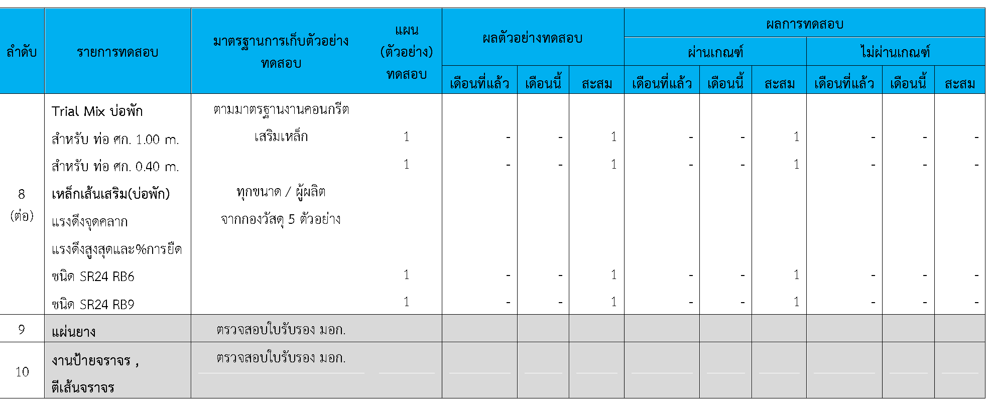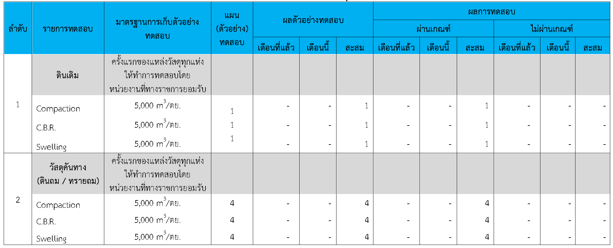 ในระหว่างวันที่ 1-30 กันยายน 2564 ผู้ว่าจ้างได้เสนอหนังสือขออนุมัติใช้วัสดุถึงที่ปรึกษา โดยที่ปรึกษาได้ตรวจสอบวัสดุดังกล่าวมีผลทดสอบดังตาราง