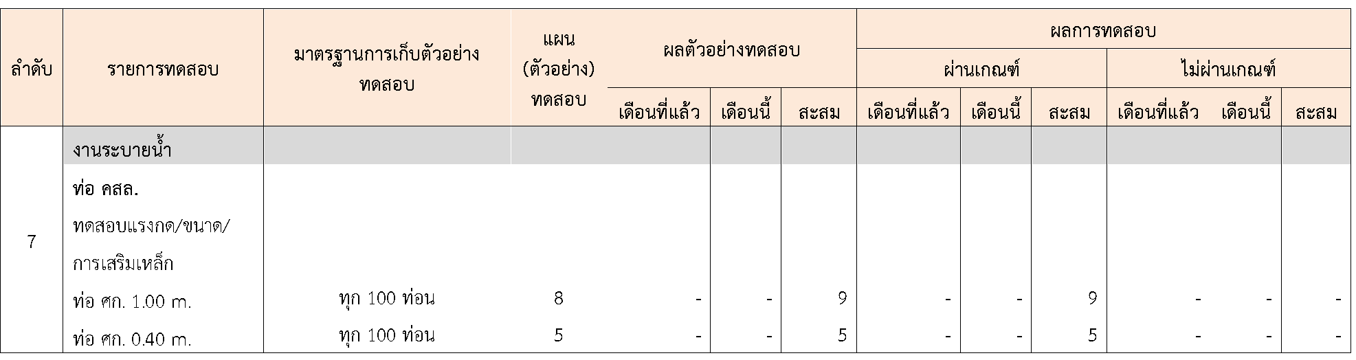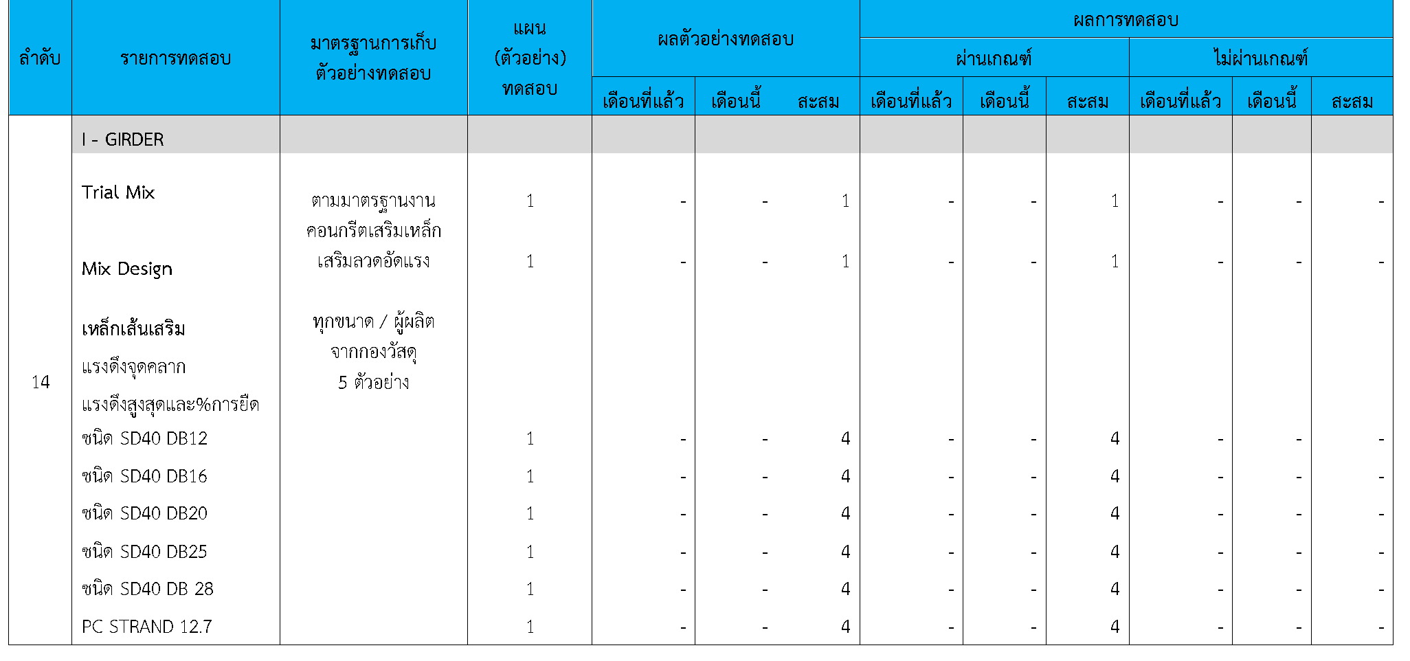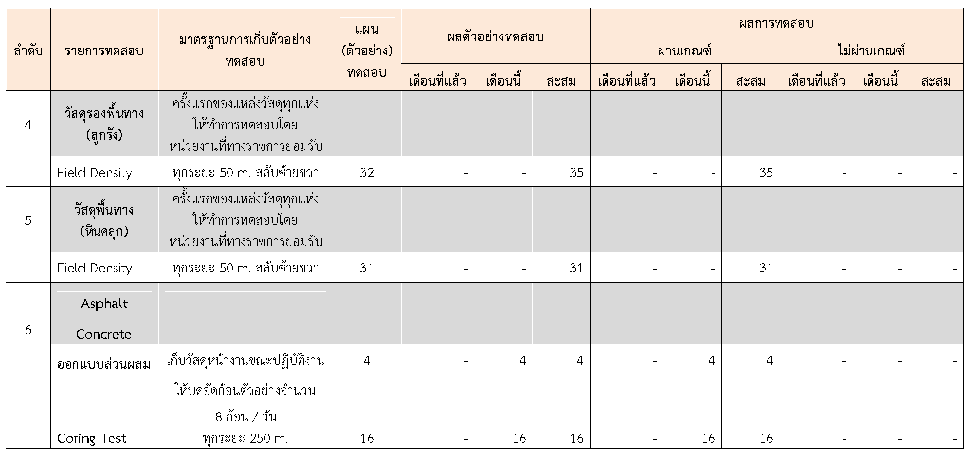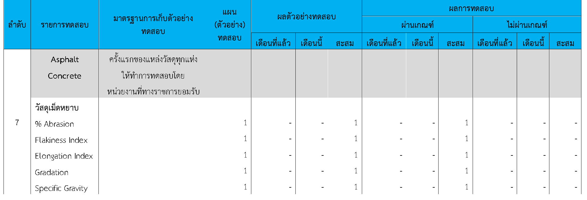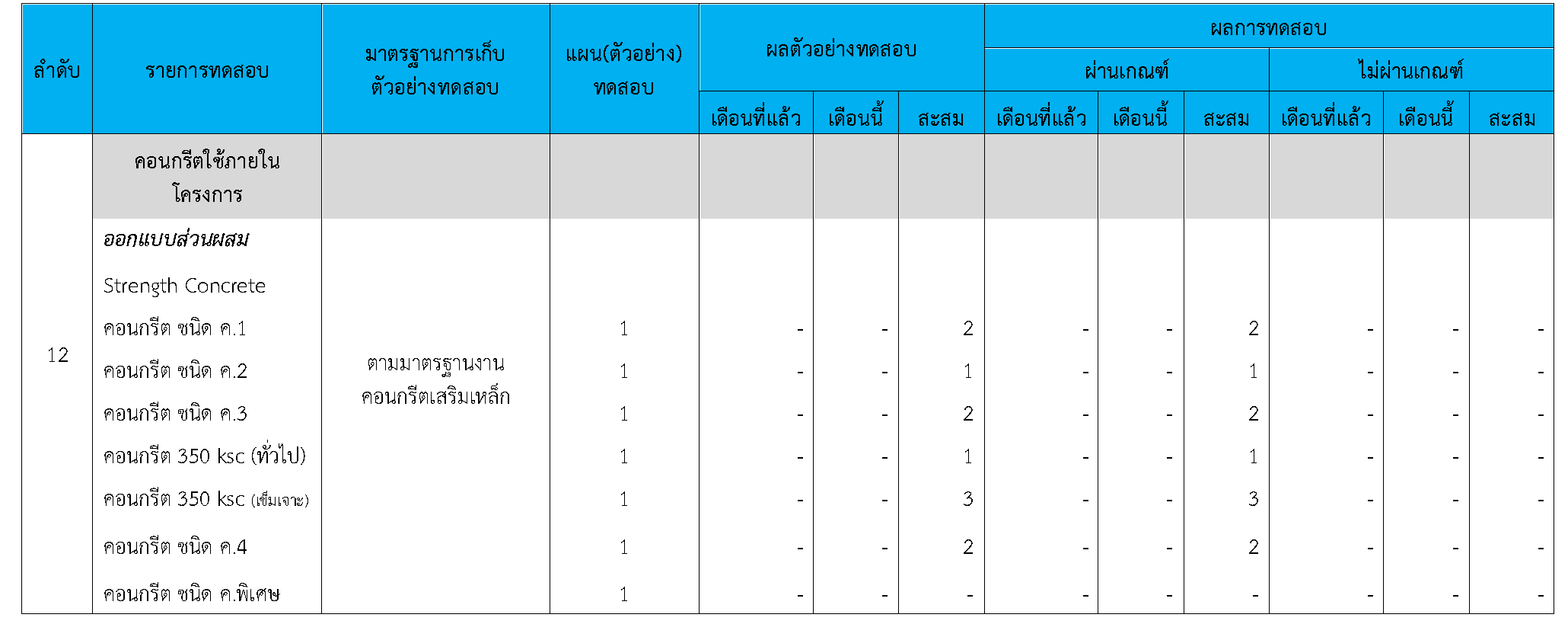 ในระหว่างวันที่ 1-30 กันยายน 2564 ผู้ว่าจ้างได้เสนอหนังสือขออนุมัติใช้วัสดุถึงที่ปรึกษา โดยที่ปรึกษาได้ตรวจสอบวัสดุดังกล่าวมีผลทดสอบดังตาราง