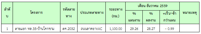 ที่ปรึกษาได้ดำเนินการควบคุมงานก่อสร้าง ในเดือน ธันวาคม 2559 มีรายละเอียดการดำเนินงานและความก้าวหน้าของงานตามที่กล่าวในบทที่ 2 ข้อ2.2 รายละเอียดความก้าวหน้าของงานในสายทาง