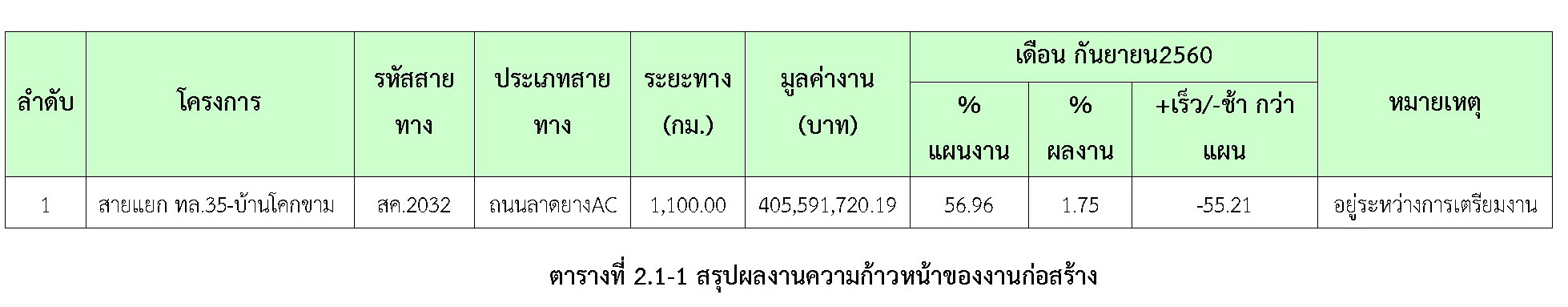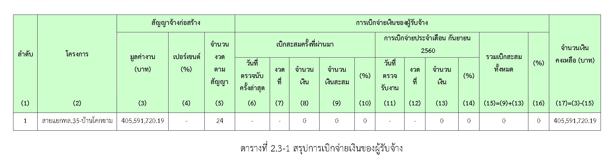 ในเดือน กันยายน2560 ยังไม่มีความก้าวหน้าของงานก่อสร้างที่สามารถตรวจรับงานได้ จึงไม่มีการตรวจรับงานใดๆ ดังสรุปในตารางที่ 2.3-1