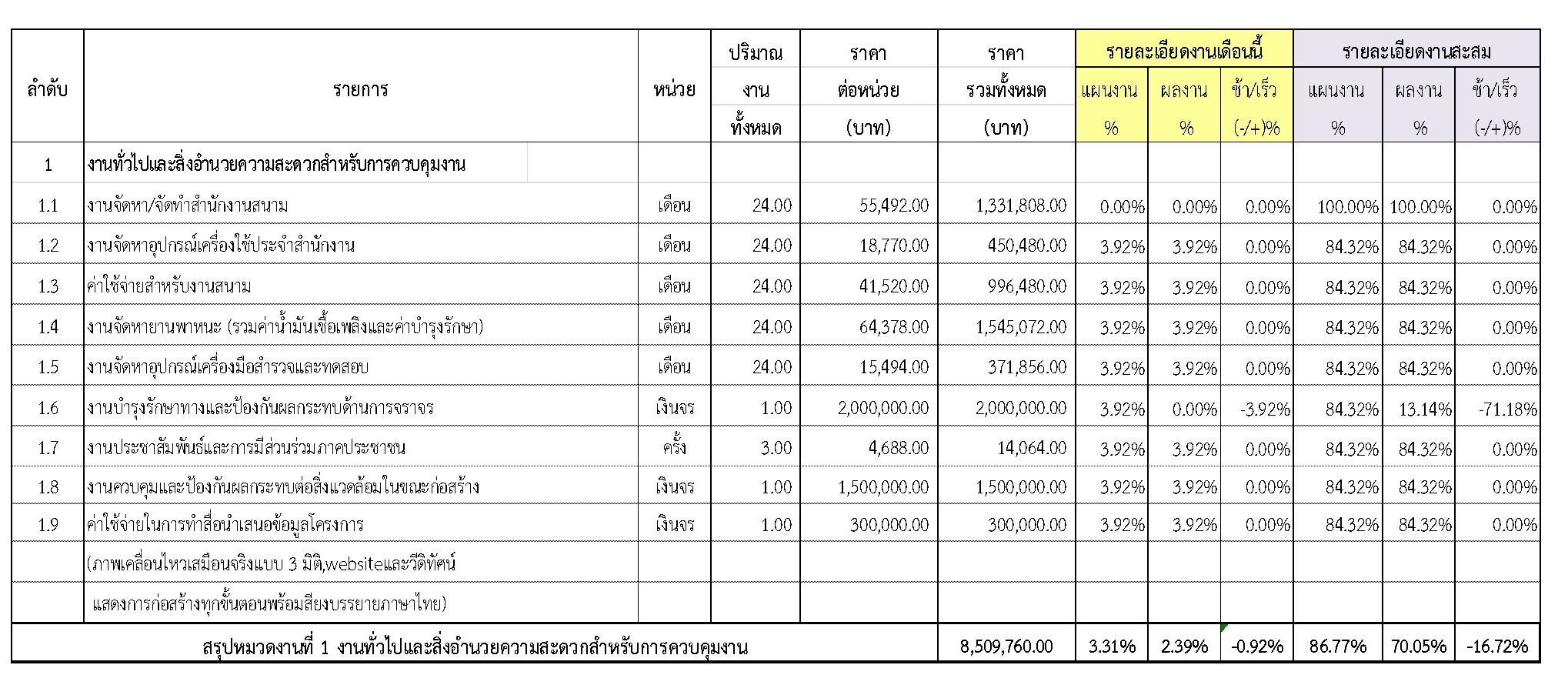 ตารางที่ 2.1-1 สรุปผลงานความก้าวหน้าของงานก่อสร้าง