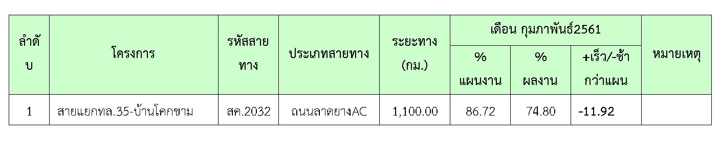 ที่ปรึกษาได้ดำเนินการควบคุมงานก่อสร้าง ในเดือน กุมภาพันธ์ 2561มีรายละเอียดการดำเนินงานและความก้าวหน้าของงานตามที่กล่าวในบทที่ 2 ข้อ2.2 รายละเอียดความก้าวหน้าของงานในสายทาง