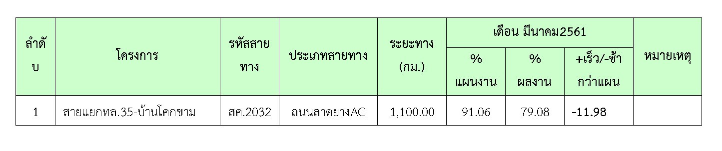 ที่ปรึกษาได้ดำเนินการควบคุมงานก่อสร้าง ในเดือน มีนาคม 2561มีรายละเอียดการดำเนินงานและความก้าวหน้าของงานตามที่กล่าวในบทที่ 2 ข้อ2.2 รายละเอียดความก้าวหน้าของงานในสายทาง