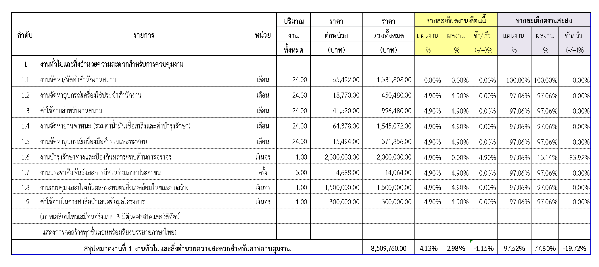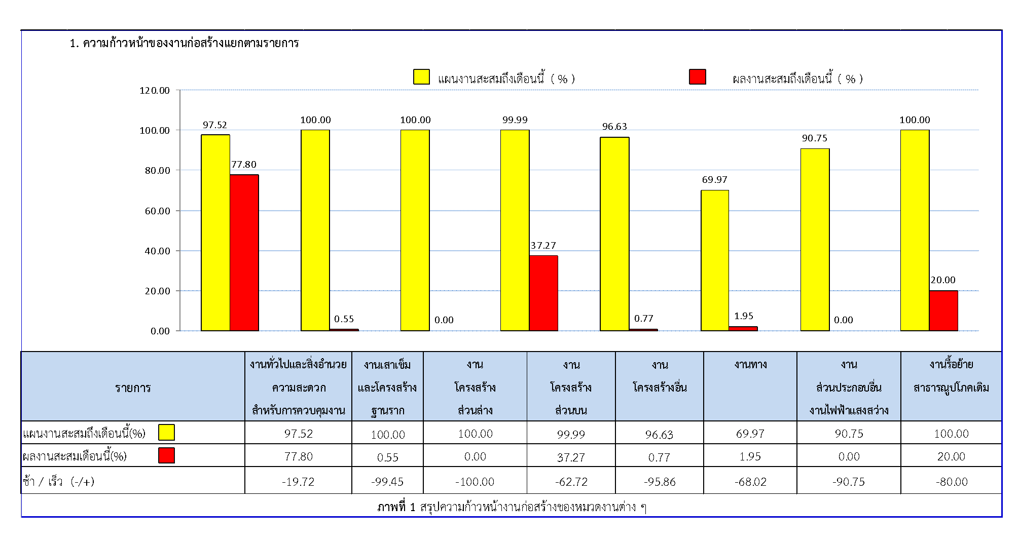 ตารางที่ 2.1-1 สรุปผลงานความก้าวหน้าของงานก่อสร้าง
