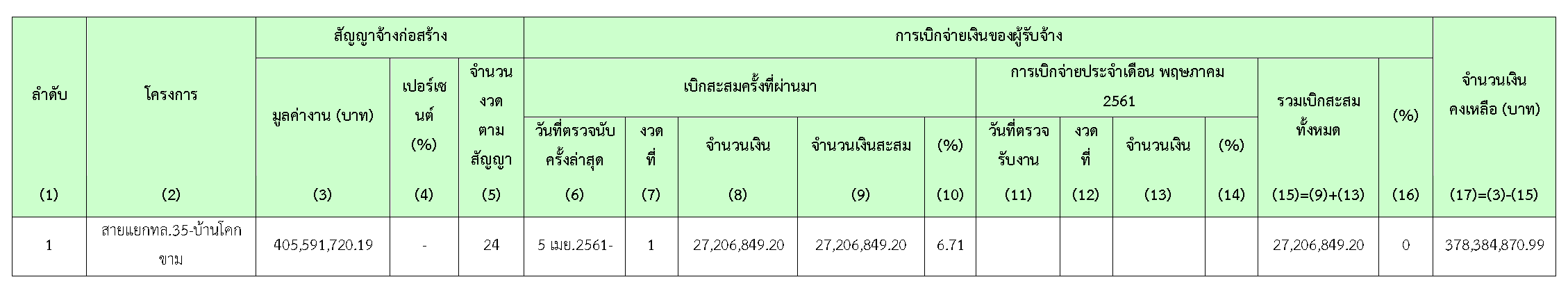 ในเดือนพฤษภาคม2561มีความก้าวหน้าของงานก่อสร้างที่สามารถตรวจรับงานได้ ดังสรุปในตารางที่ 2.3-1